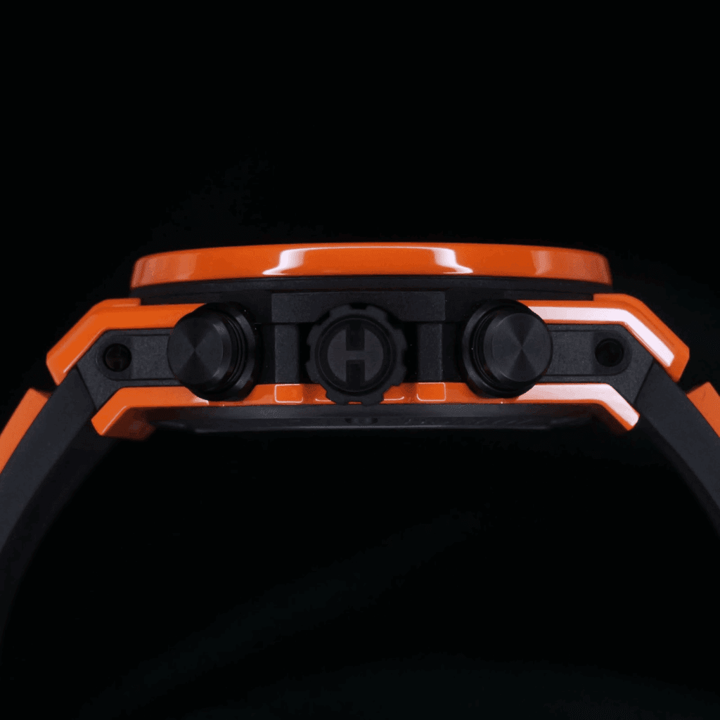 The 42 mm case with a thickness of 14.5 mm sits well on most wrists – not oversized, but still carrying the substance you expect from a Big Bang. Both the case and bezel are made from polished orange ceramic, a material that holds its color and resists scratches. Between the layers of the case is a black composite resin insert, a design cue that adds contrast to the orange ceramic, while six black-plated titanium “H” screws secure the bezel in place. Protecting the dial is a sapphire crystal with anti-reflective treatment, and the watch is rated to 100 meters of water resistance, making it ready for daily wear.