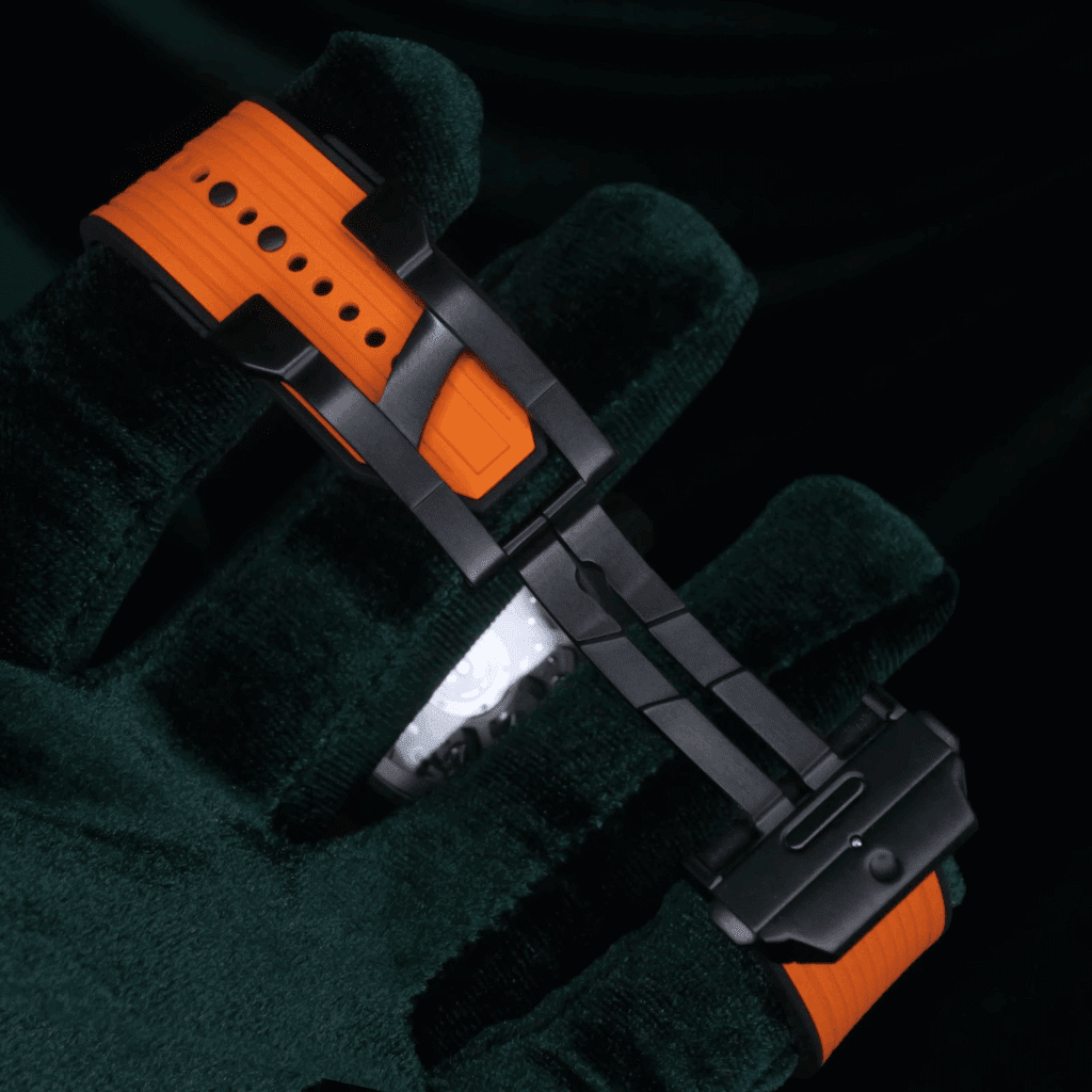 The central hands, hour markers, and Arabic numerals are coated with Super-LumiNova, keeping the watch legible even in low light. Paired with the orange ceramic case and strap, the dial pulls your eyes straight to the mechanics that make this piece so engaging.