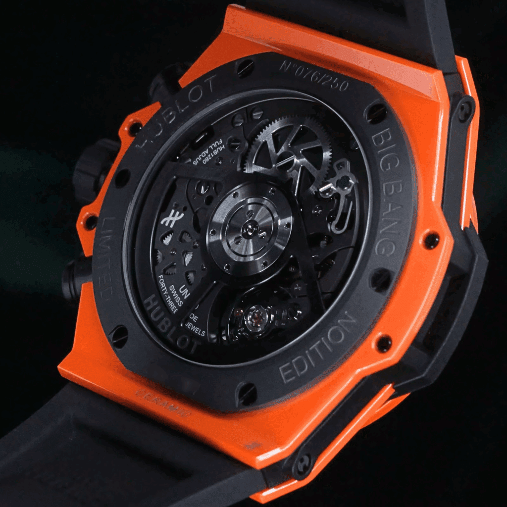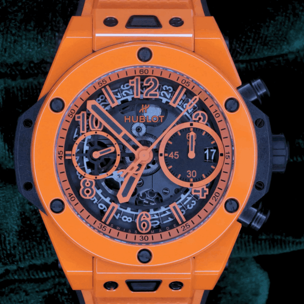 The Big Bang Unico Orange Ceramic 441.CU continues this journey. Creating a high-polished orange ceramic case wasn’t easy, it took years of research into the right mix of chemical additives, firing conditions, and pressure to produce a vibrant shade that stayed consistent across every part of the watch. Beyond the color itself, Hublot had to overcome the difficulty of mirror-polishing ceramic, a process that demands precision to avoid cracks while still achieving a flawless finish. All of this was done in-house, with patented methods that set Hublot apart as one of the only brands capable of producing such ceramic colors.