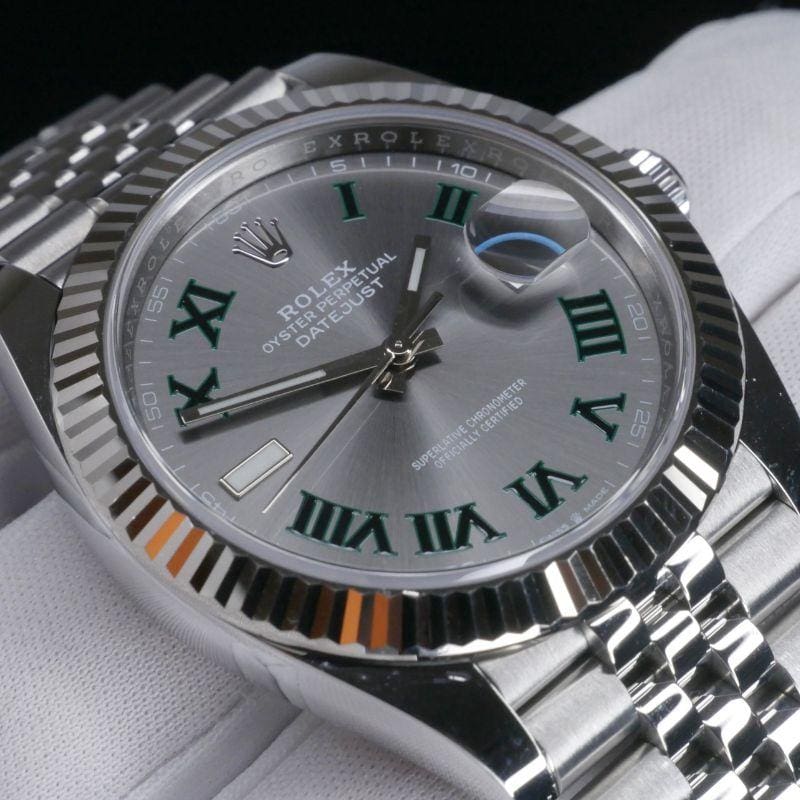 | Dial Details | Black Roman numerals with green edges; white printed minute track with 5-minute numerals; high-polished white-gold baton hour & minute hands with Chromalight lume (plus lume at 9 o’clock marker); slim polished seconds hand; embossed white-gold Rolex crown at 12; “Rolex Oyster Perpetual Datejust” and “Superlative Chronometer Officially Certified” printed clearly; “Swiss Made” with Rolex coronet at 6 |