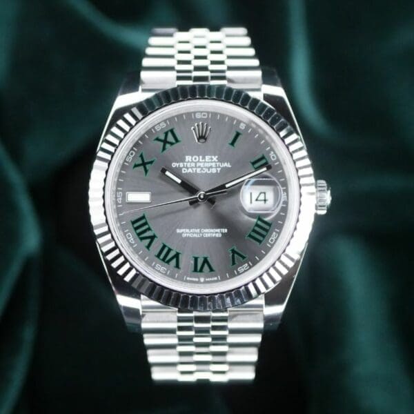 This Datejust “Wimbledon” dial measures 41mm and is equipped with a white gold fluted bezel as well as a fully linked jubilee bracelet. The hour hand, minute hand, and 9 o’ clock stick indices are all luminous. The Wimbledon dial was created as a partnership with the Wimbledon. The green roman numerals represent the green grass on the courts.