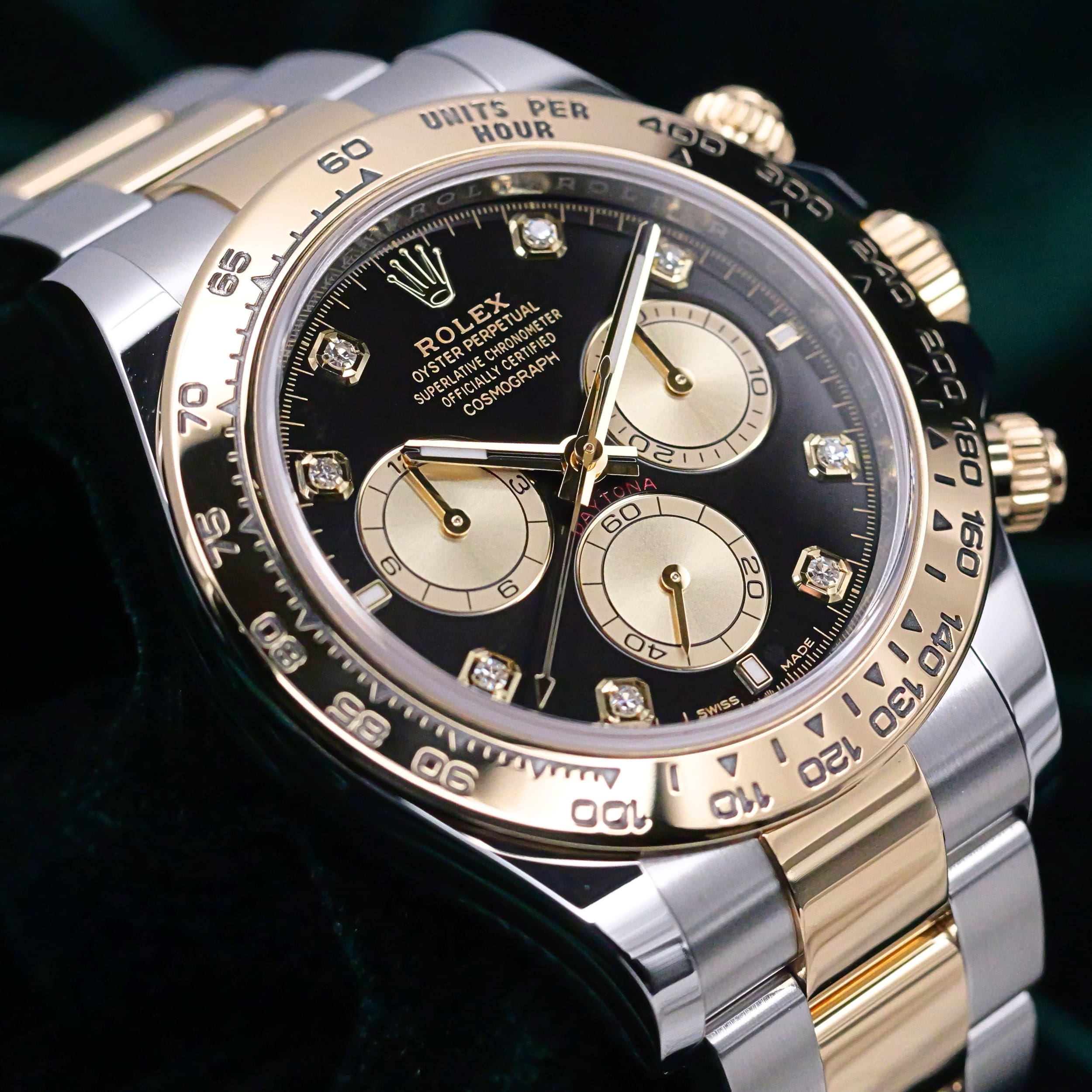 Striking a balance between luxury and performance, this timepiece features a rich black dial adorned with diamond hour markers and framed by a lustrous yellow gold bezel. Perfect for collectors and professionals alike, this two-tone Daytona exudes confidence whether on the racetrack or at a formal event.