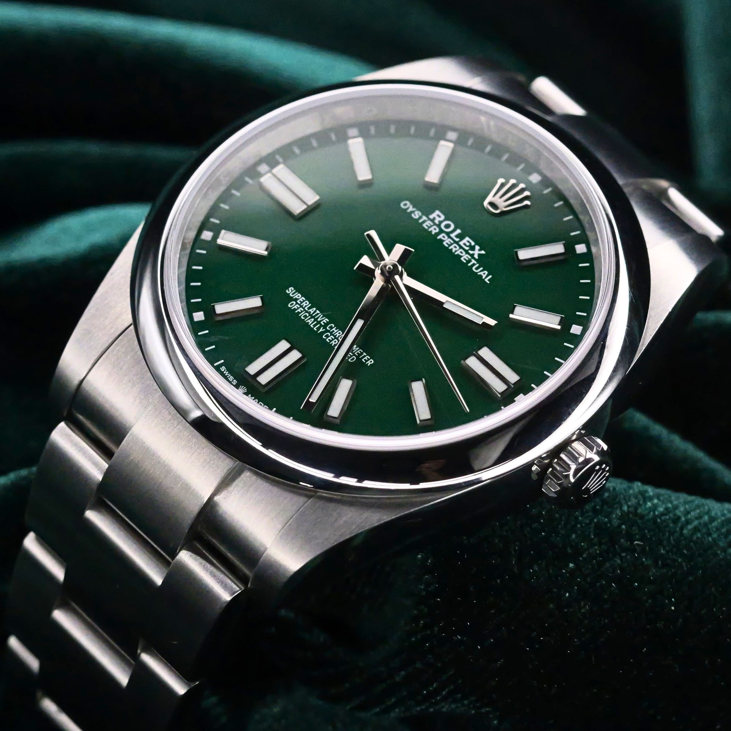 Presents itself in mint condition with little to no signs of wear. The green lacquer dial is easily the standout feature. Rich, glossy, and electric under light, with Chromalight-filled hour markers and hands. The domed polished bezel in Oystersteel provides a sleek contrast, catching reflections without competing with the vibrance of the dial. Paired with the brushed and polished Oyster bracelet, the watch wears with everyday comfort and unmistakable wrist presence.