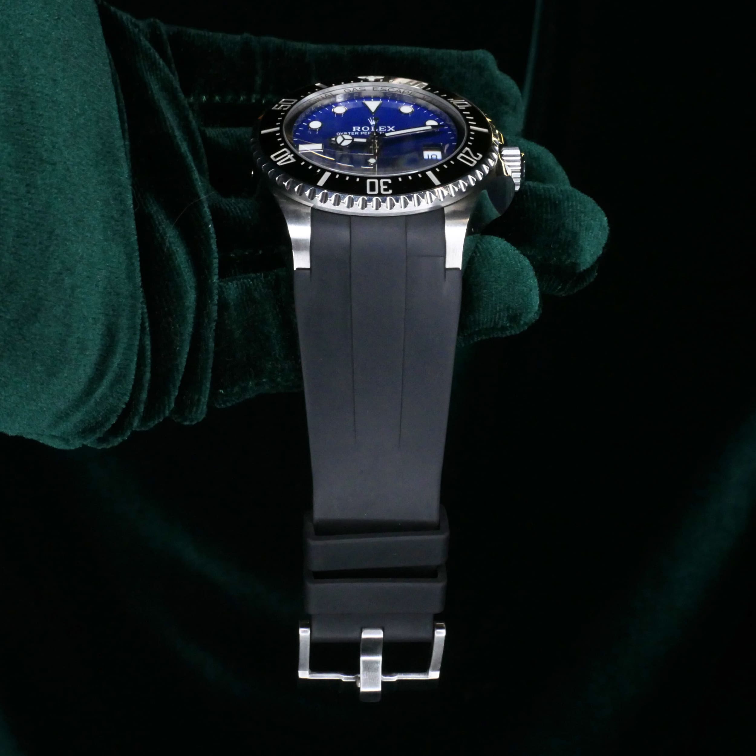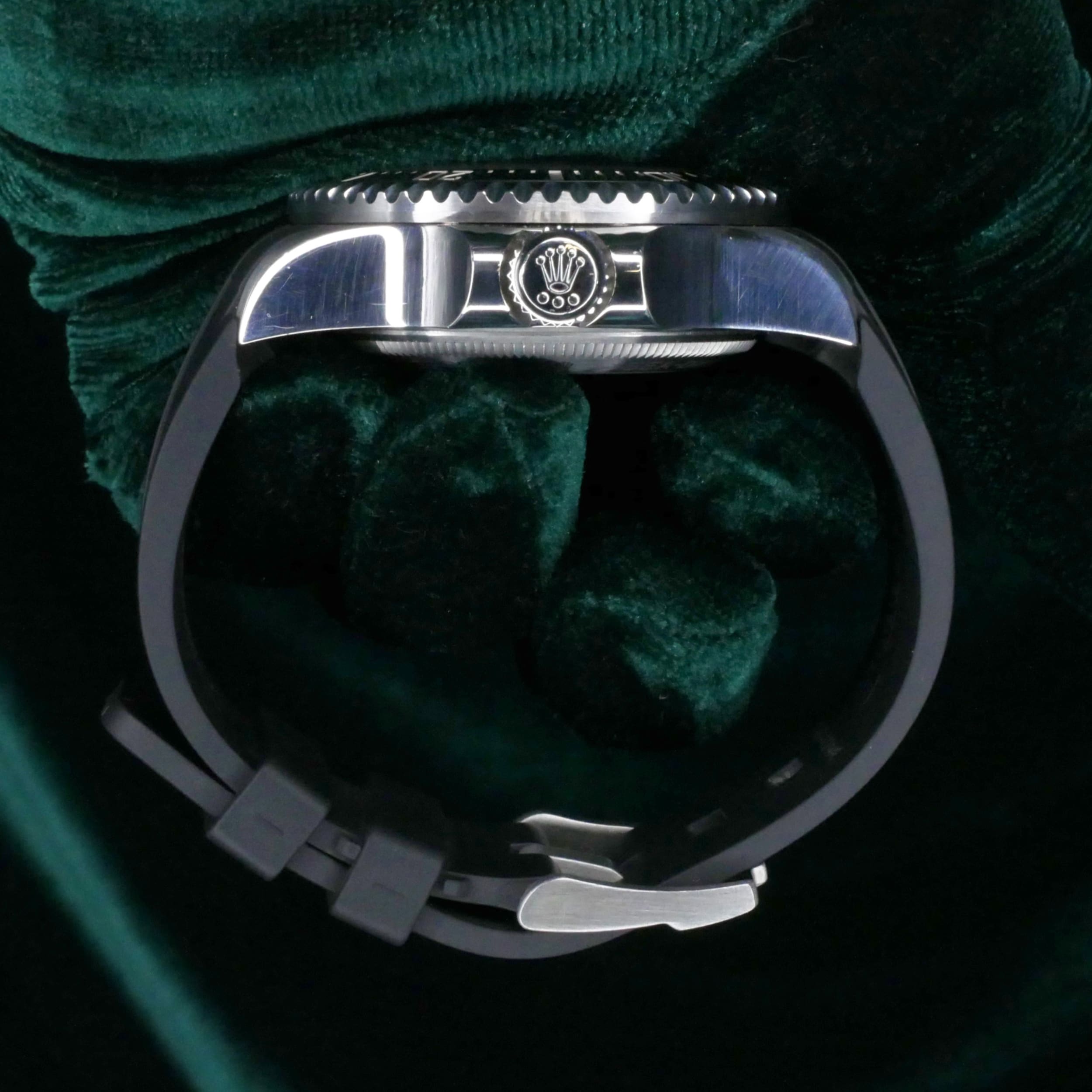 This timepiece is in mint condition, with little to no signs of wear. The distinctive Cerachrom bezel, crafted from black ceramic, effectively highlights the essence of the deep sea. The incorporation of white hour markers enhances the visibility of both the dial and the bezel. The black rubber strap contributes to the watch’s versatility and durability.