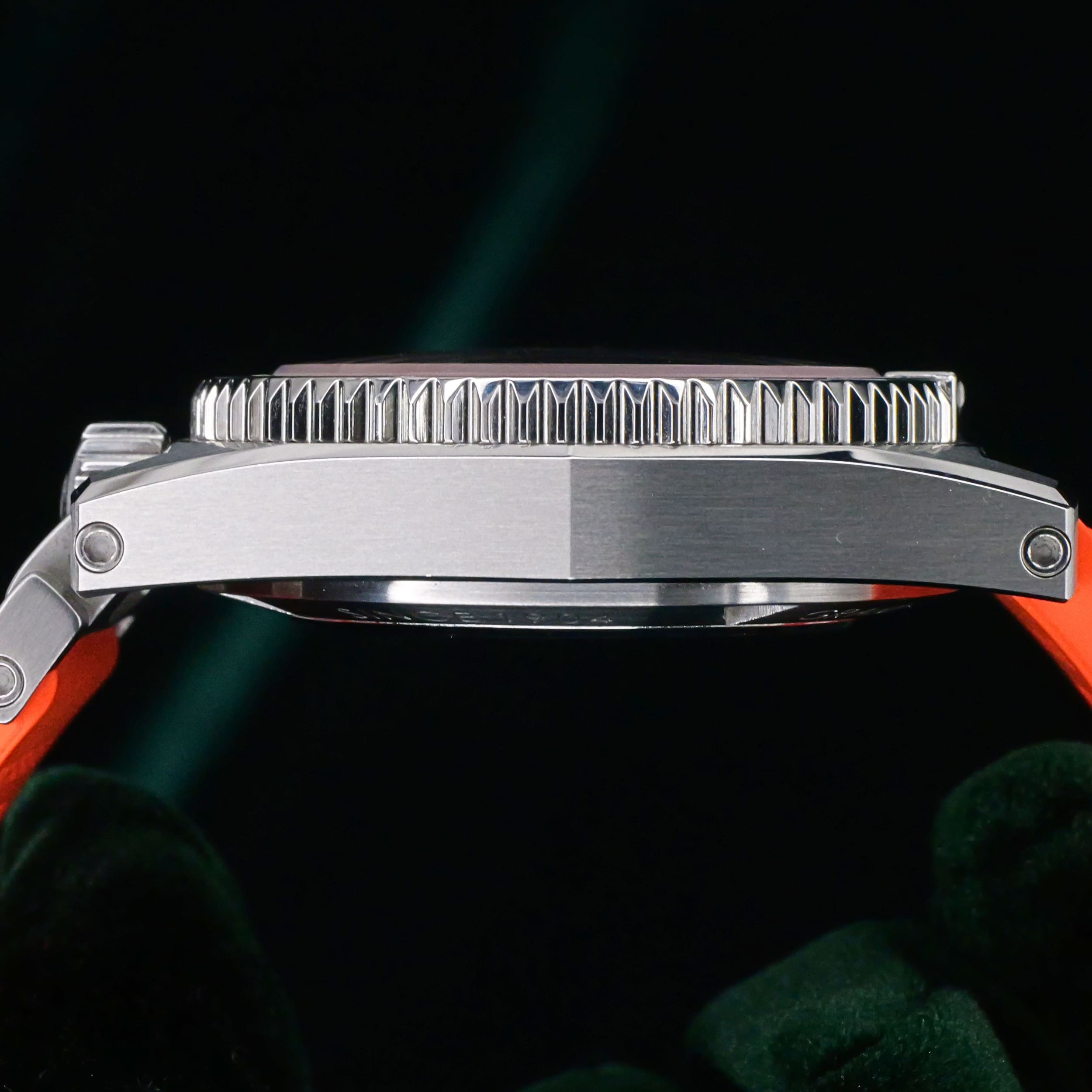 Presents itself in mint condition with little to no signs of wear. Featuring its radiant tangerine dial as the focal point, the watch presents a vivid burst of color that immediately captures attention. Showcasing the contrasting black bezel, the piece gains a defined visual edge that sharpens the overall composition. Highlighting the matching tangerine rubber strap, which echoes the dial’s vibrant tone, the watch achieves a unified aesthetic that amplifies its bold, modern character.