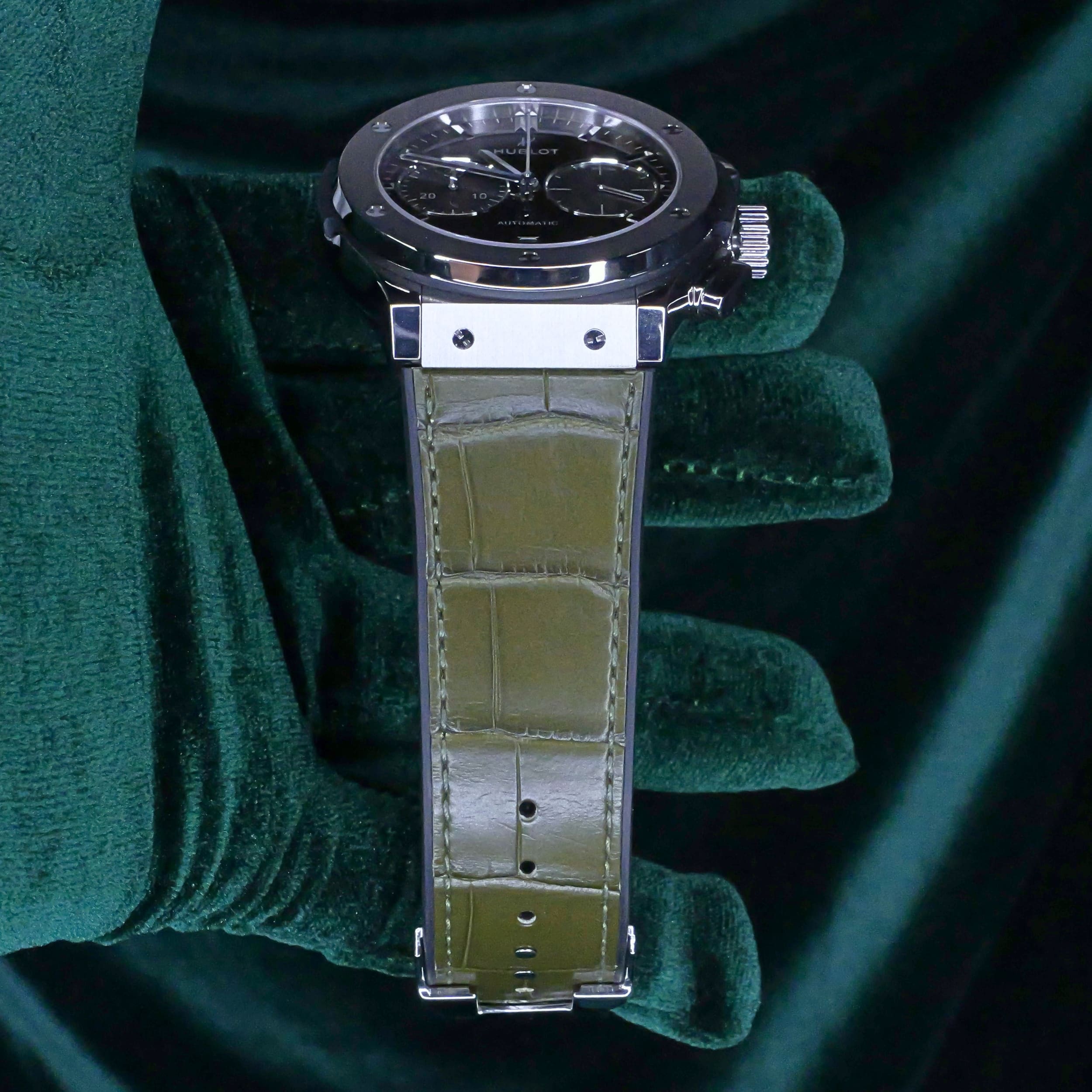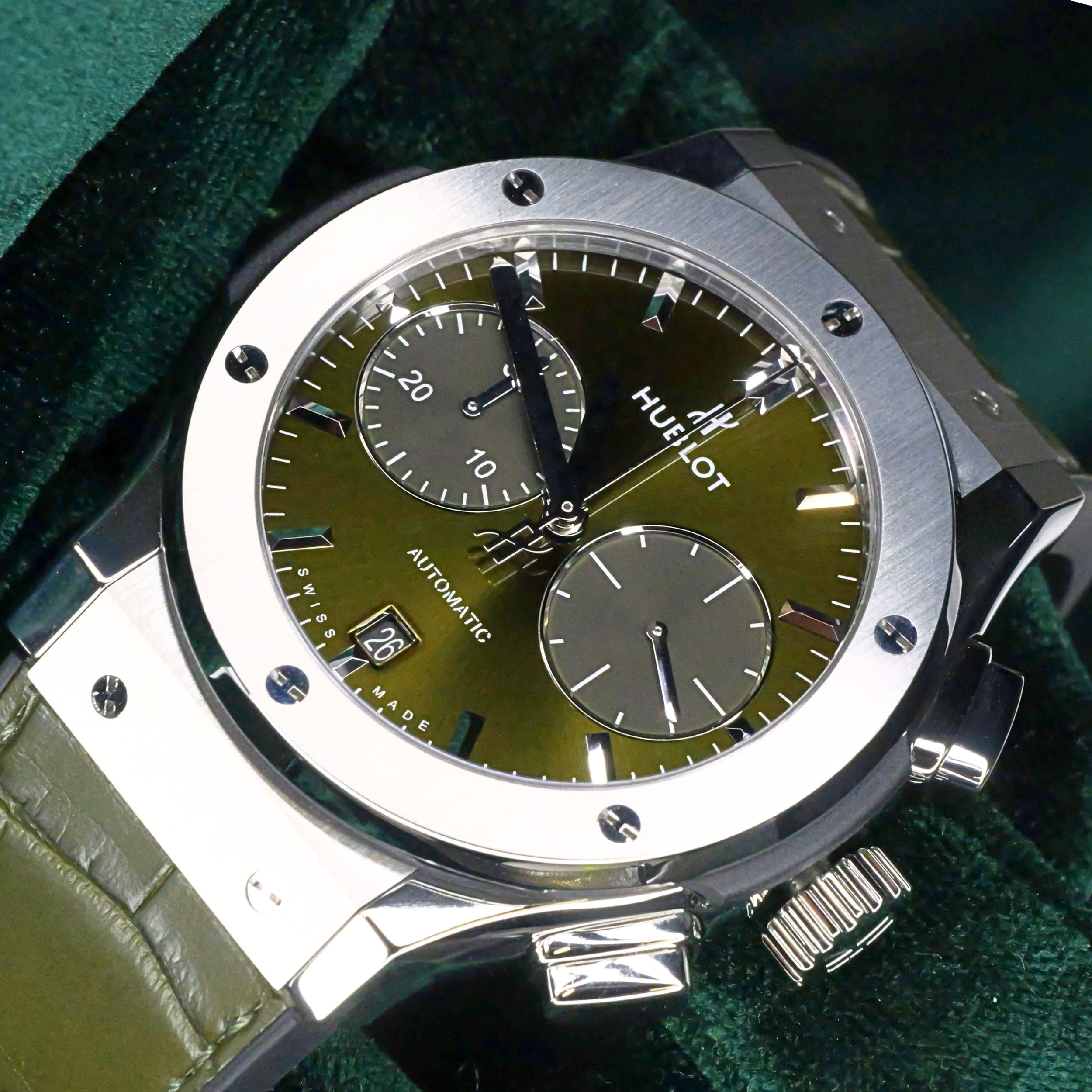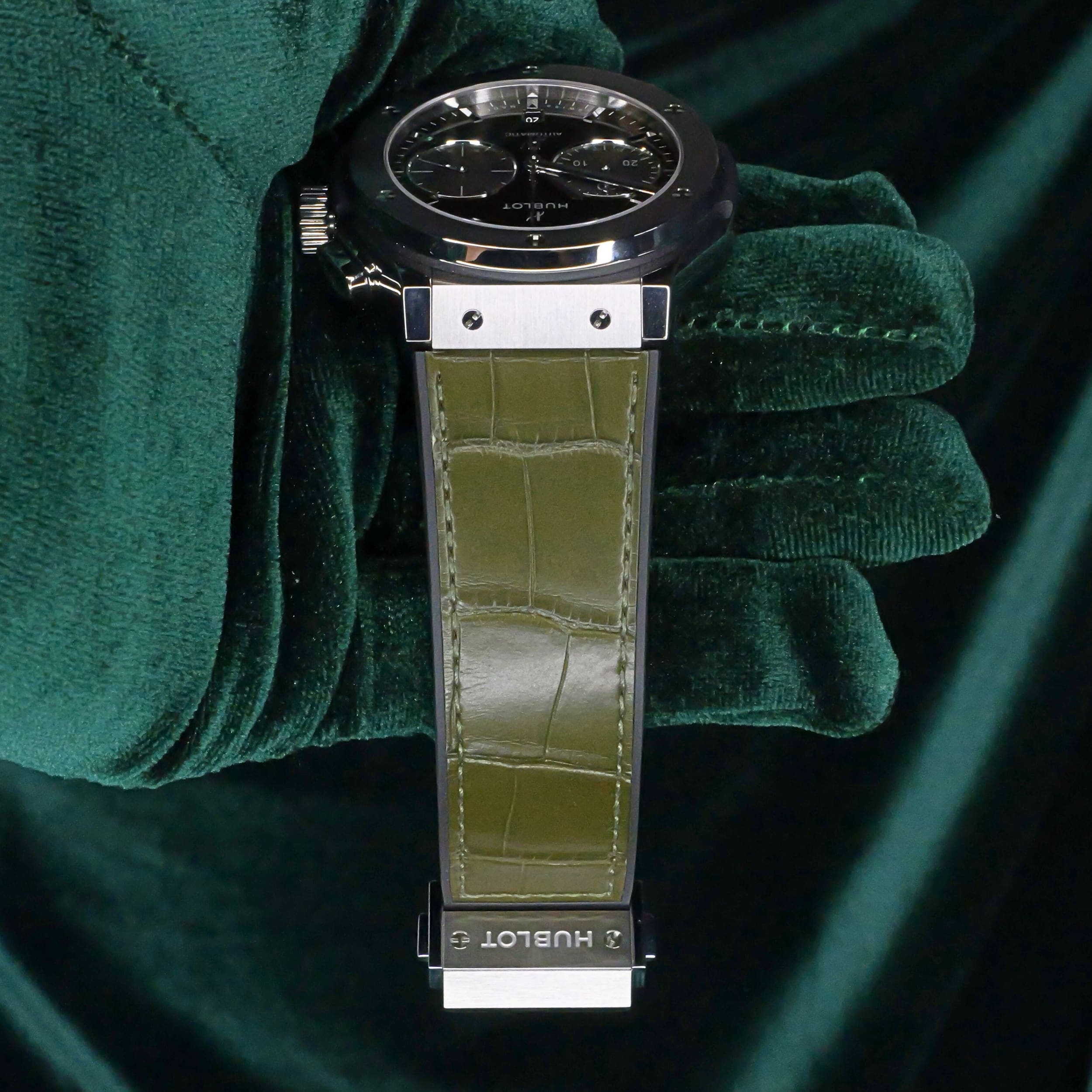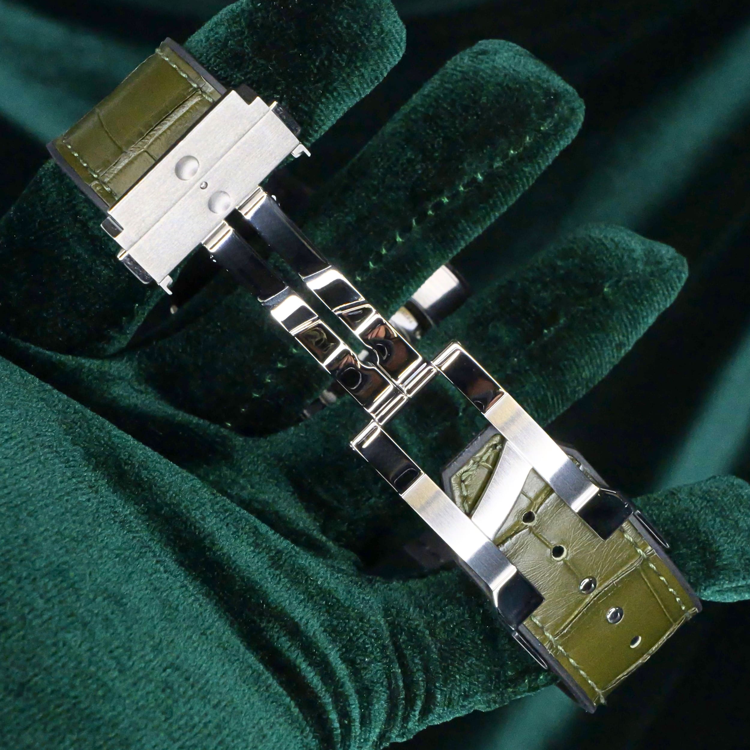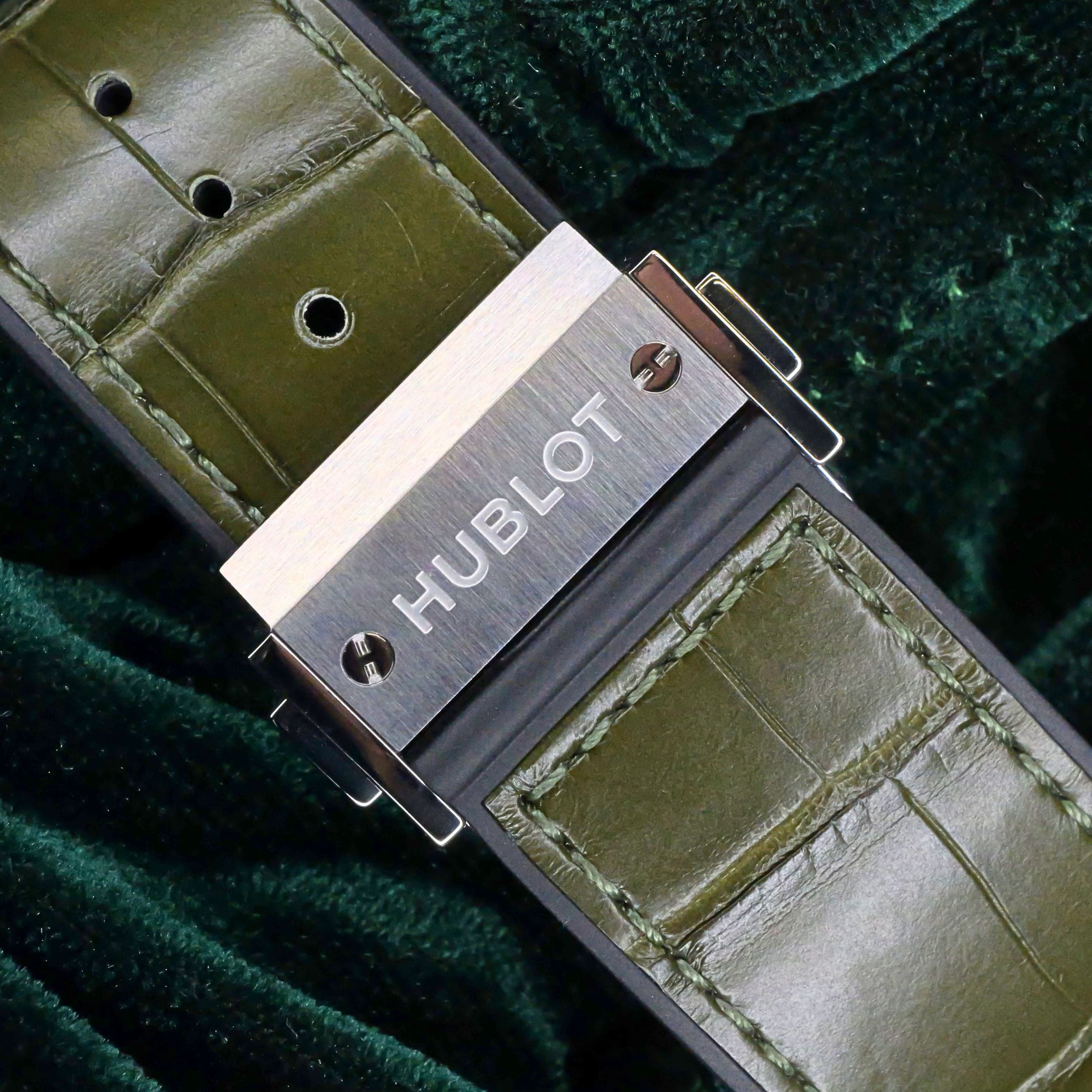 Presents itself in brand new condition with no signs of wear. Showcases a satin-finished and polished titanium bezel that is immaculate, while the transparent caseback remains pristine. Its pushers and crown are smooth and operate perfectly. Both the green alligator strap and green rubber strap are in great shape, with the stainless steel deployant buckle clasp providing a secure and comfortable fit.