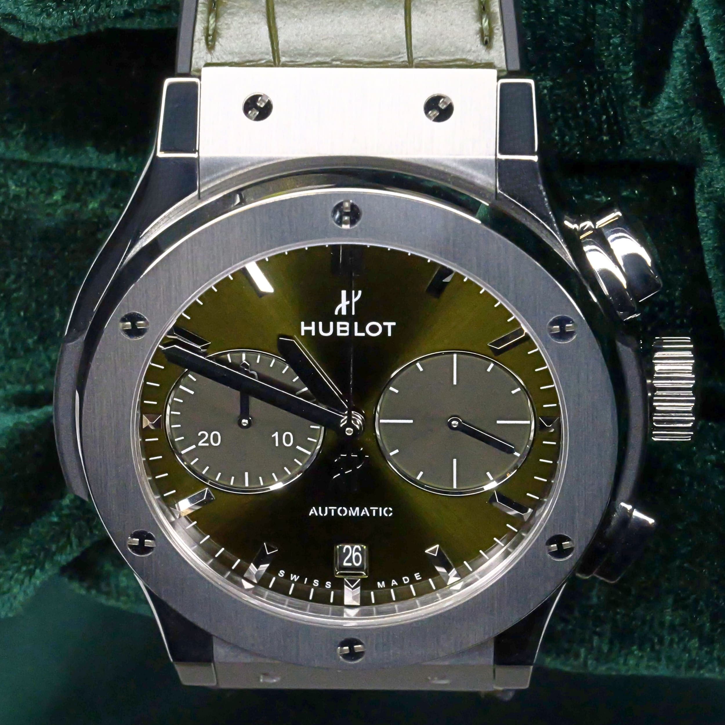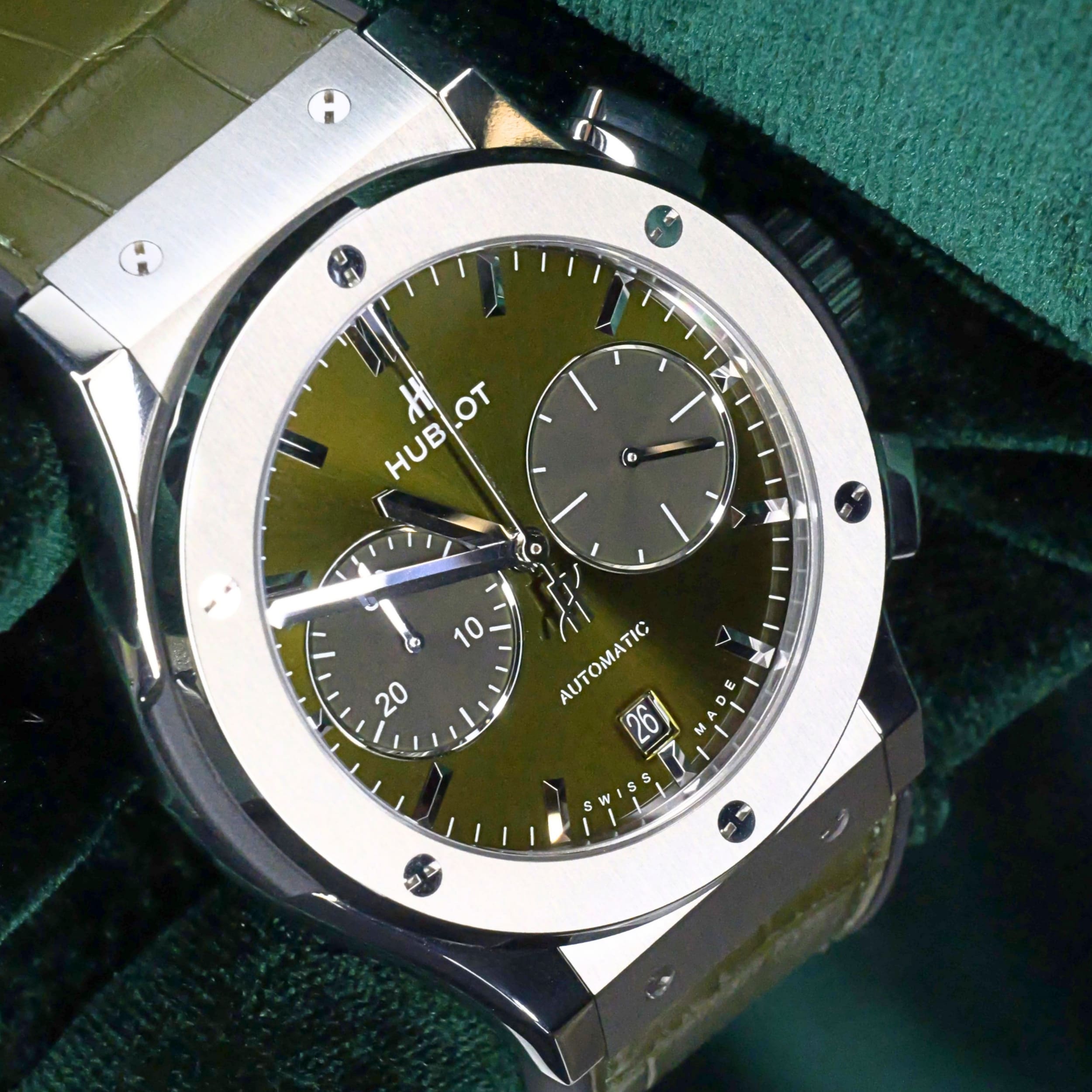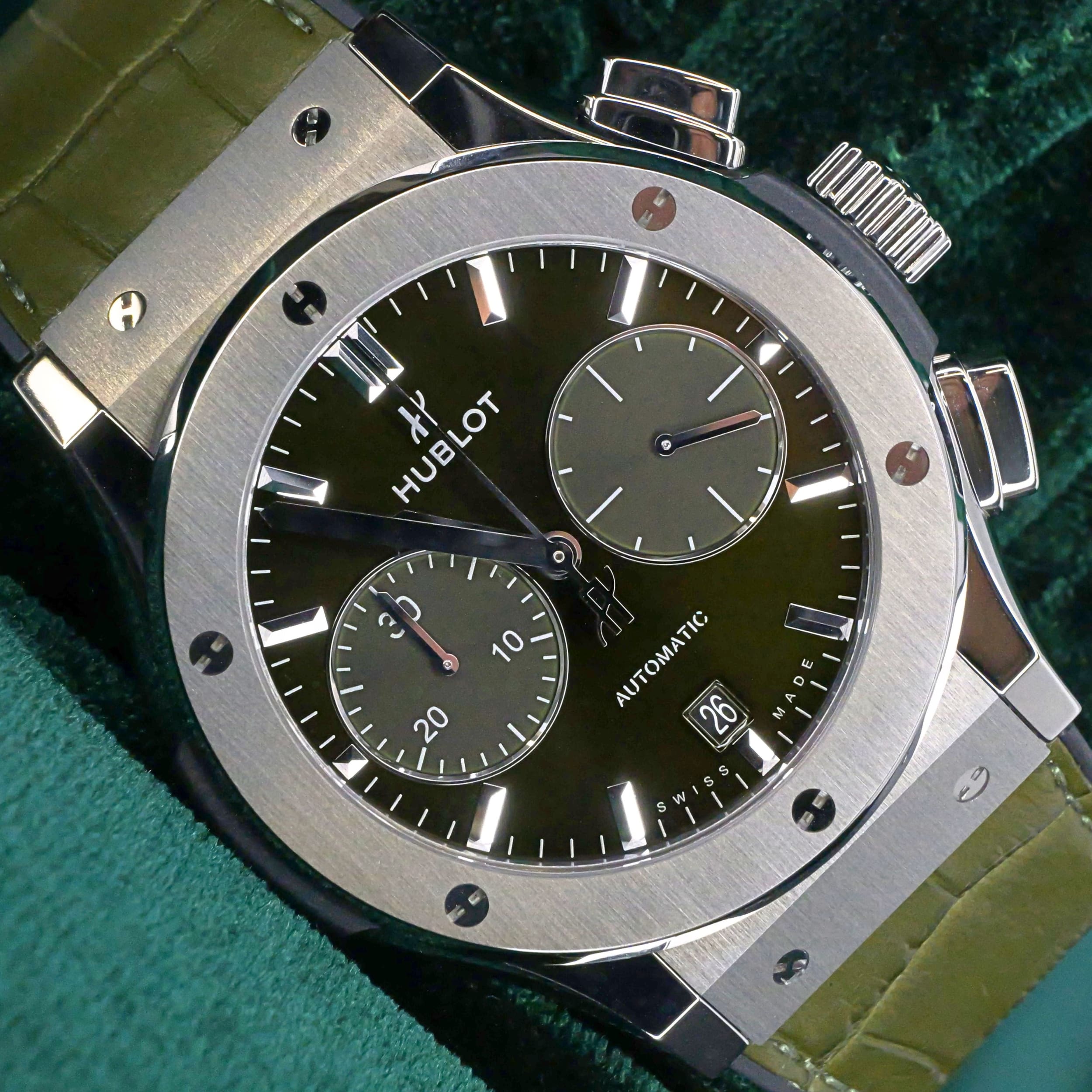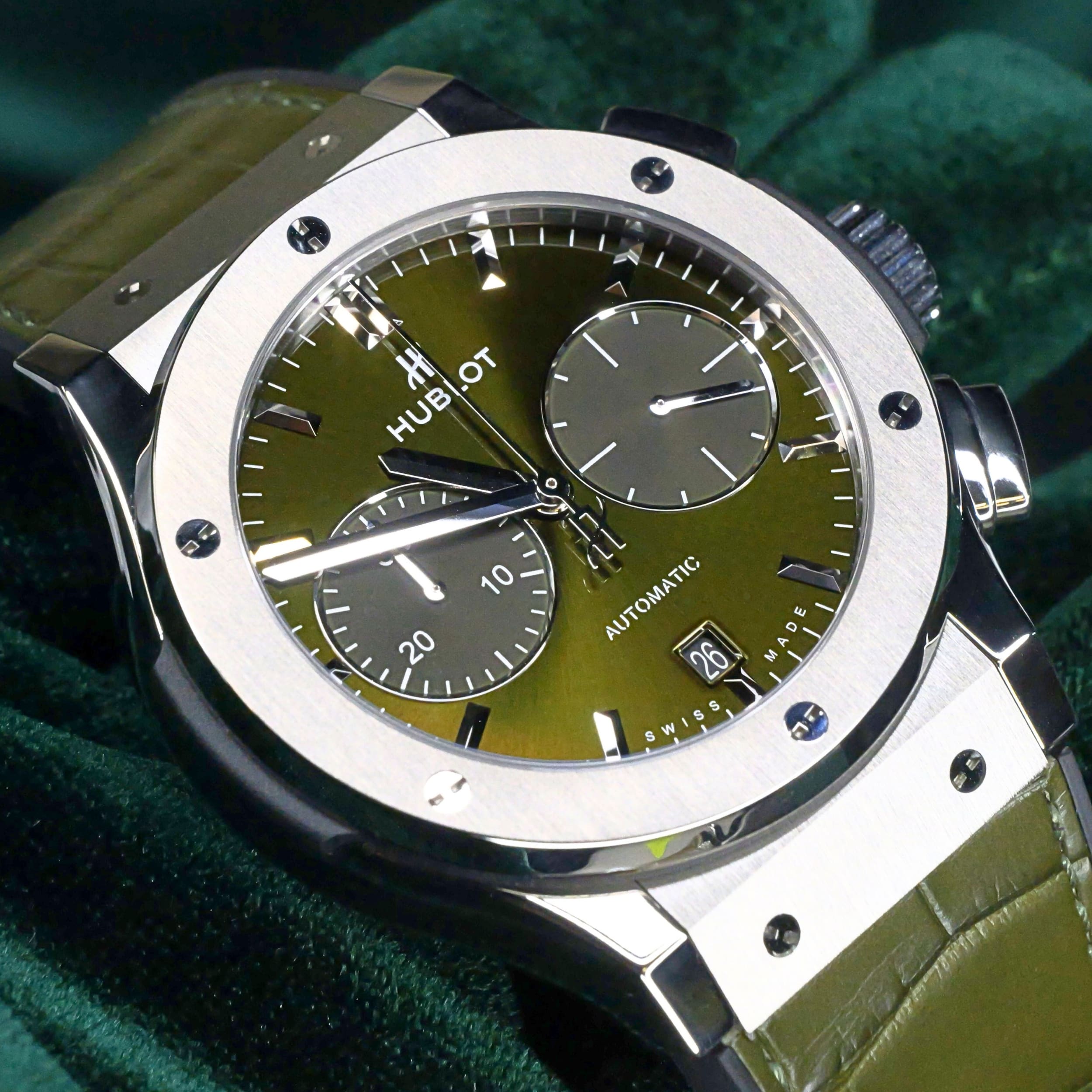 Presents itself in brand new condition with no signs of wear. Showcases a satin-finished and polished titanium bezel that is immaculate, while the transparent caseback remains pristine. Its pushers and crown are smooth and operate perfectly. Both the green alligator strap and green rubber strap are in great shape, with the stainless steel deployant buckle clasp providing a secure and comfortable fit.