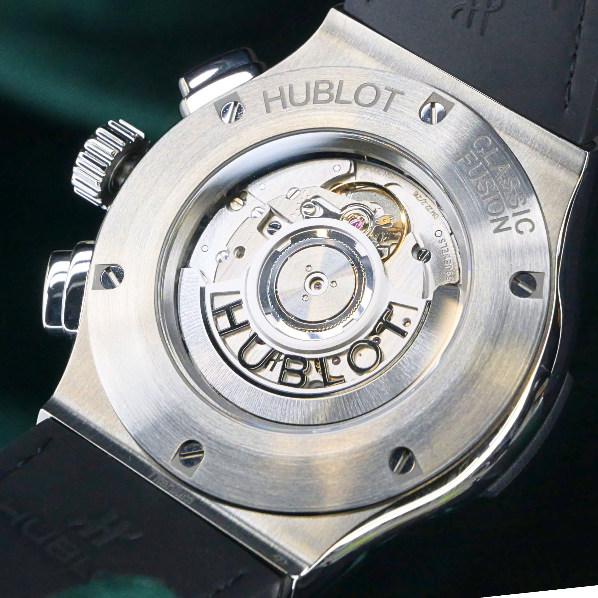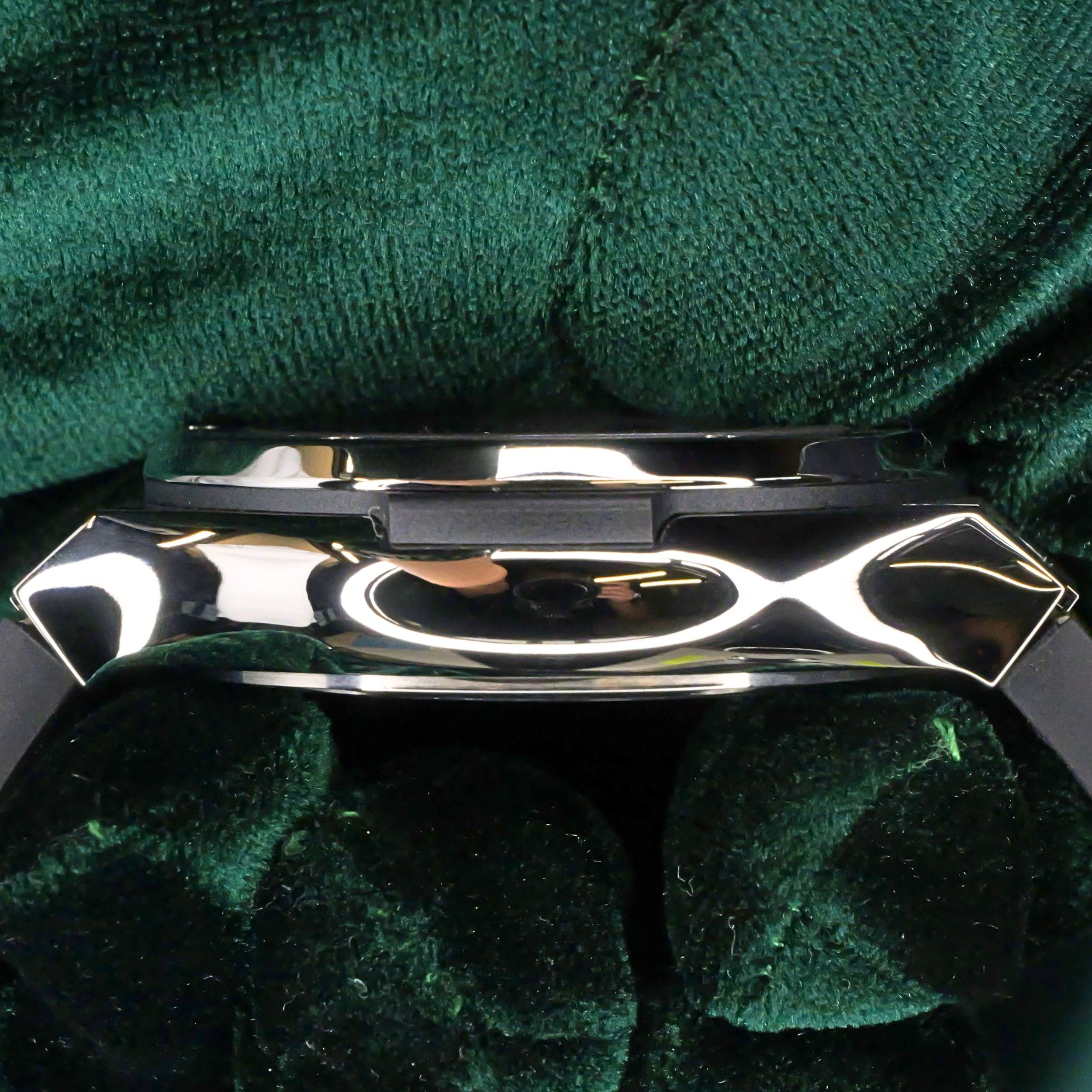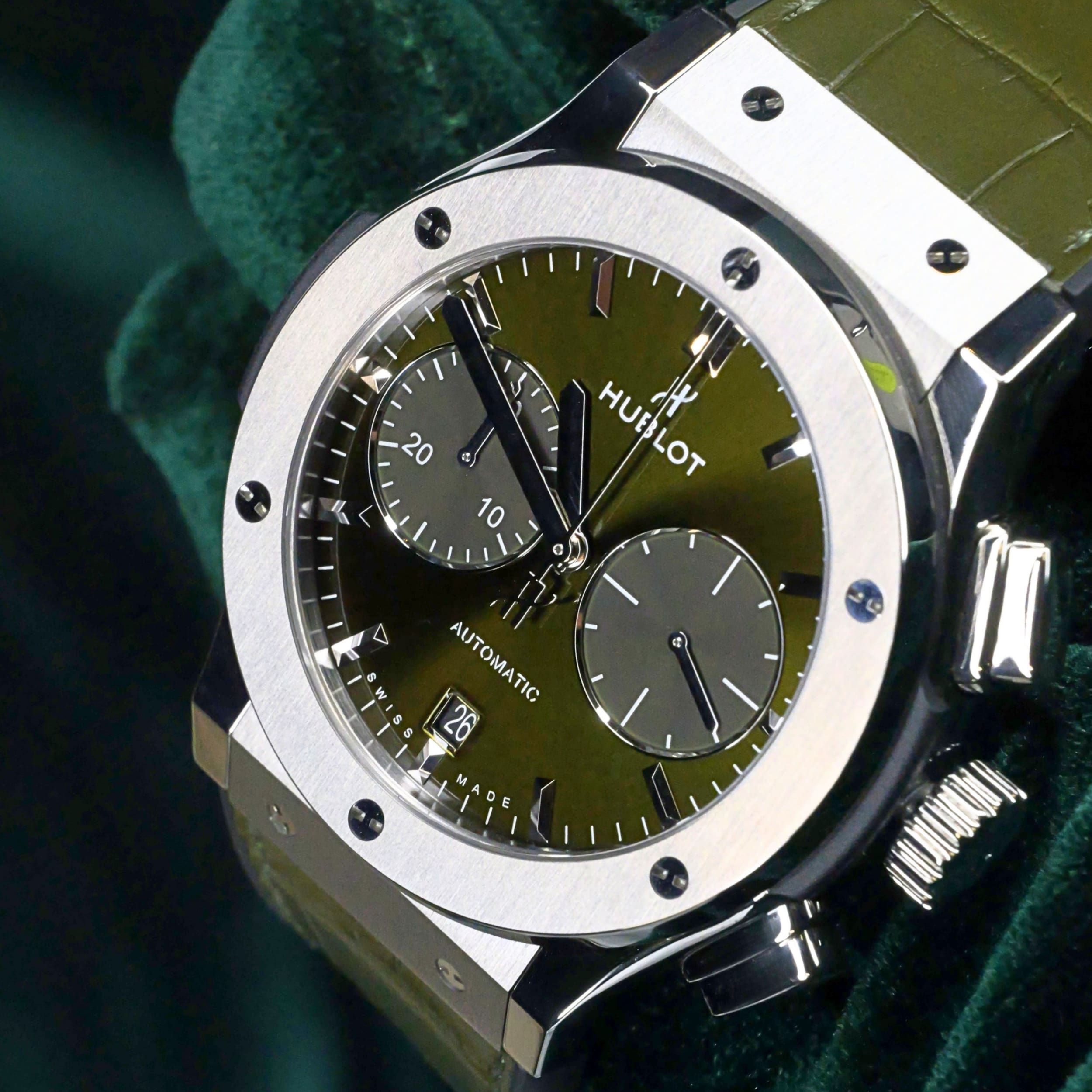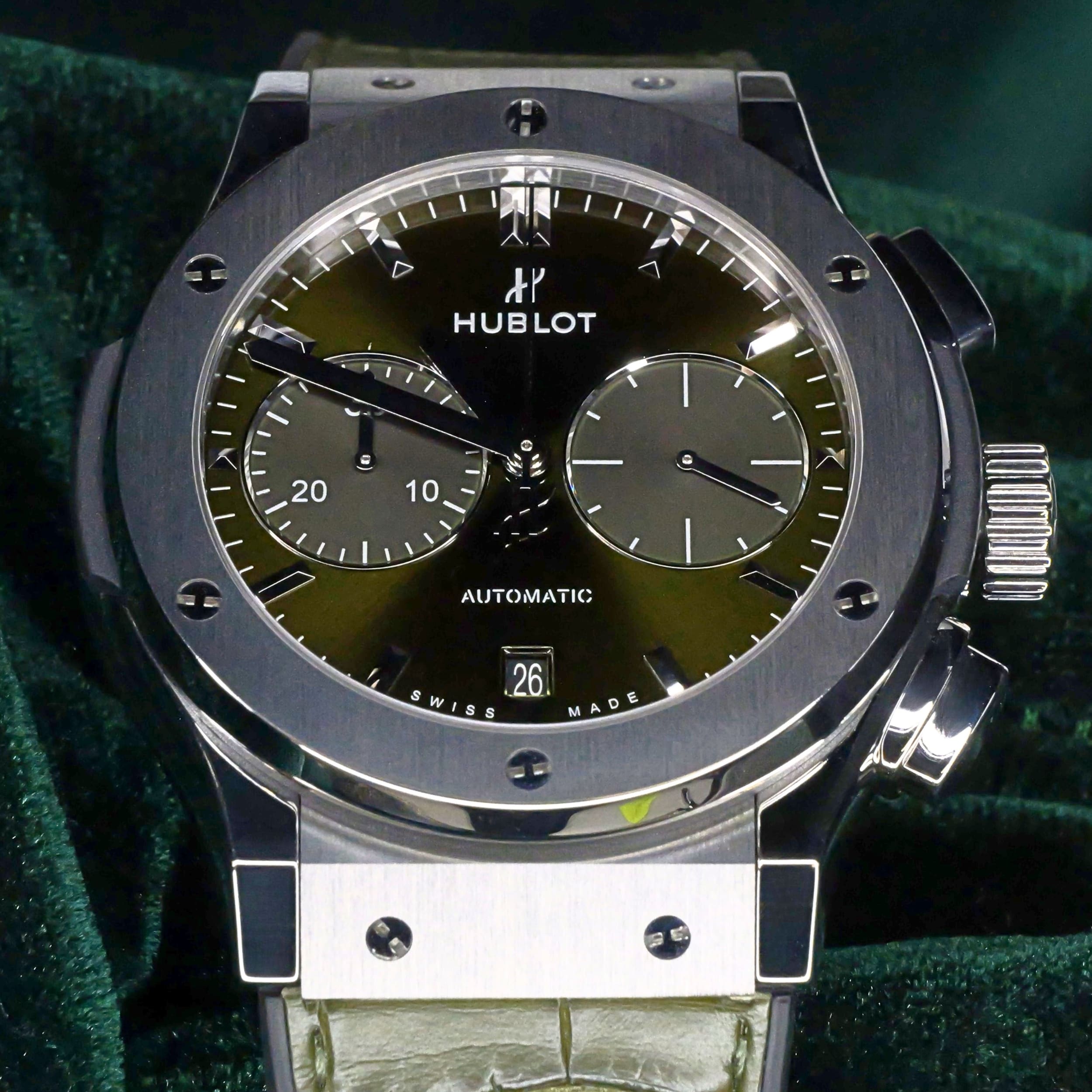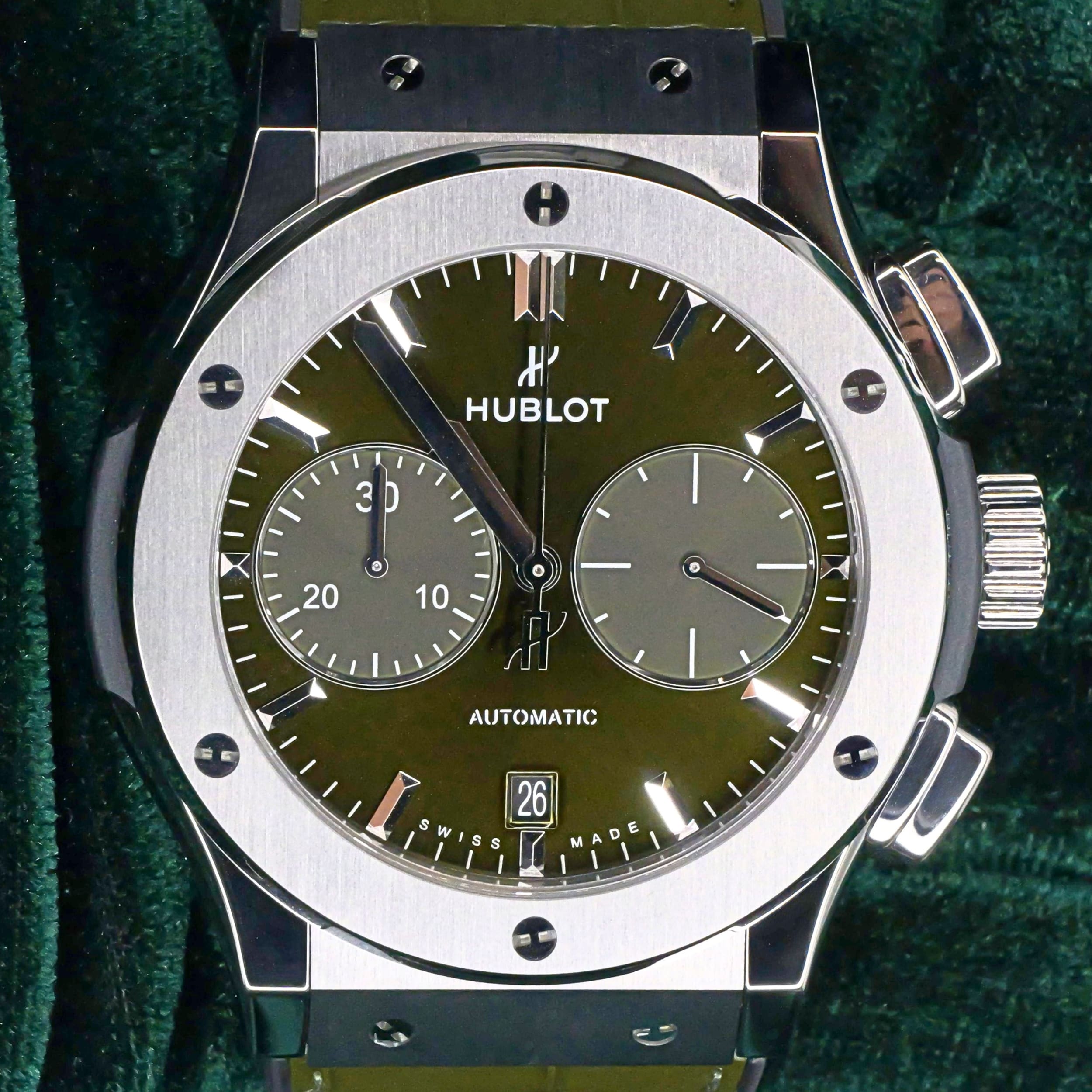Presents itself in brand new condition with no signs of wear. Showcases a satin-finished and polished titanium bezel that is immaculate, while the transparent caseback remains pristine. Its pushers and crown are smooth and operate perfectly. Both the green alligator strap and green rubber strap are in great shape, with the stainless steel deployant buckle clasp providing a secure and comfortable fit.