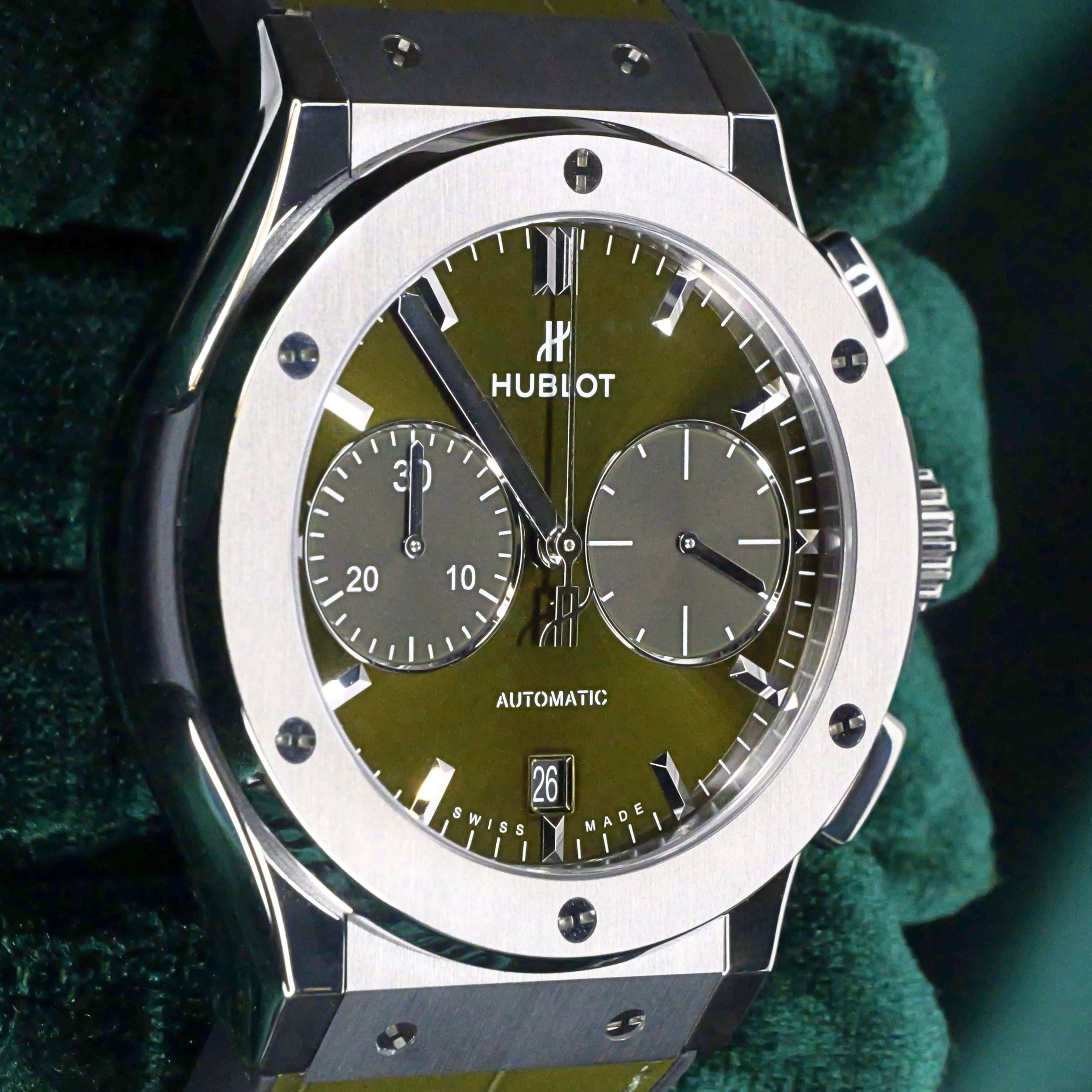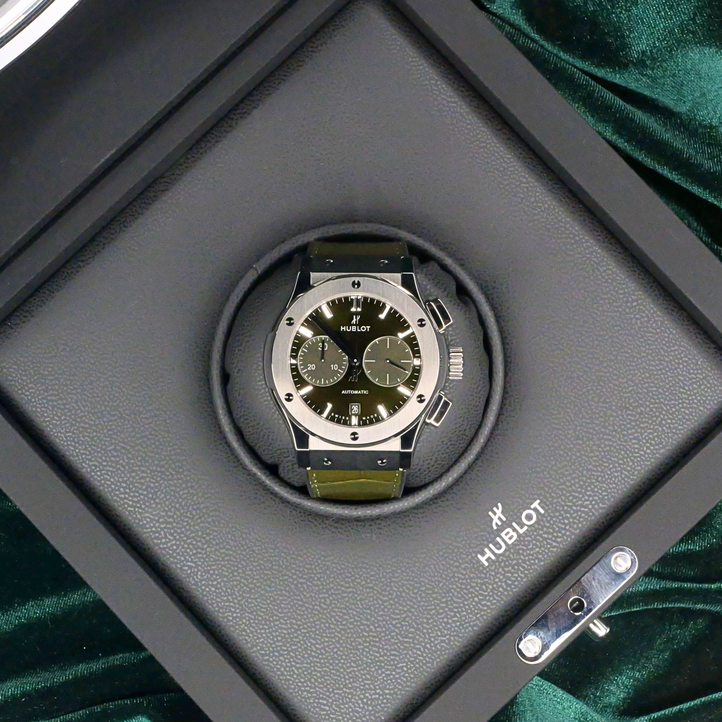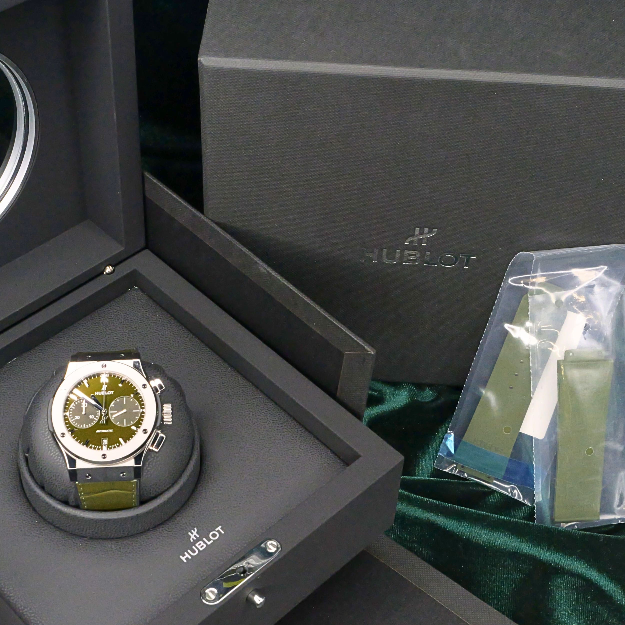 Comes as a full set in its presentation box including the watch pillow, warranty documentation, and additional green rubber strap.