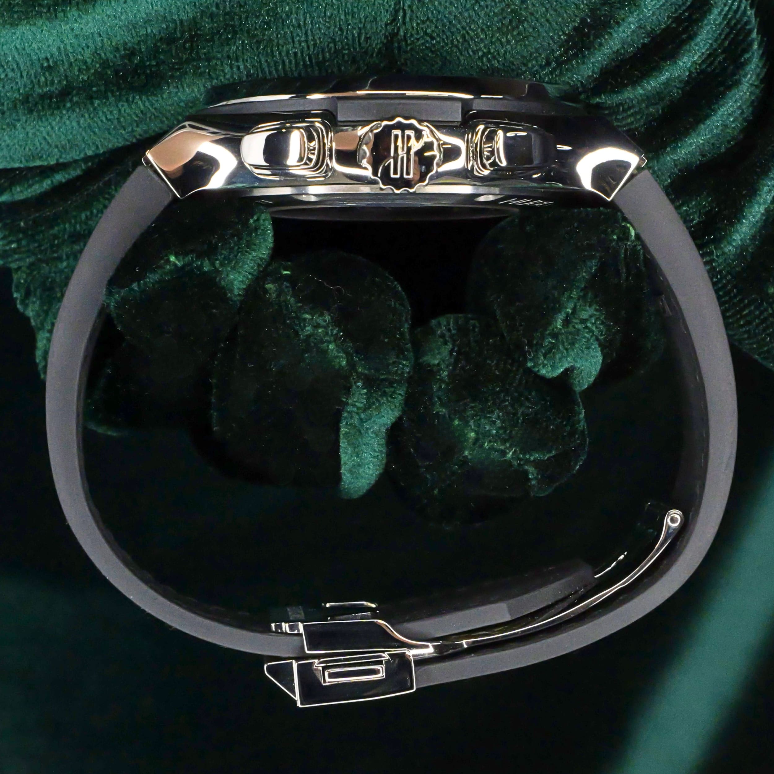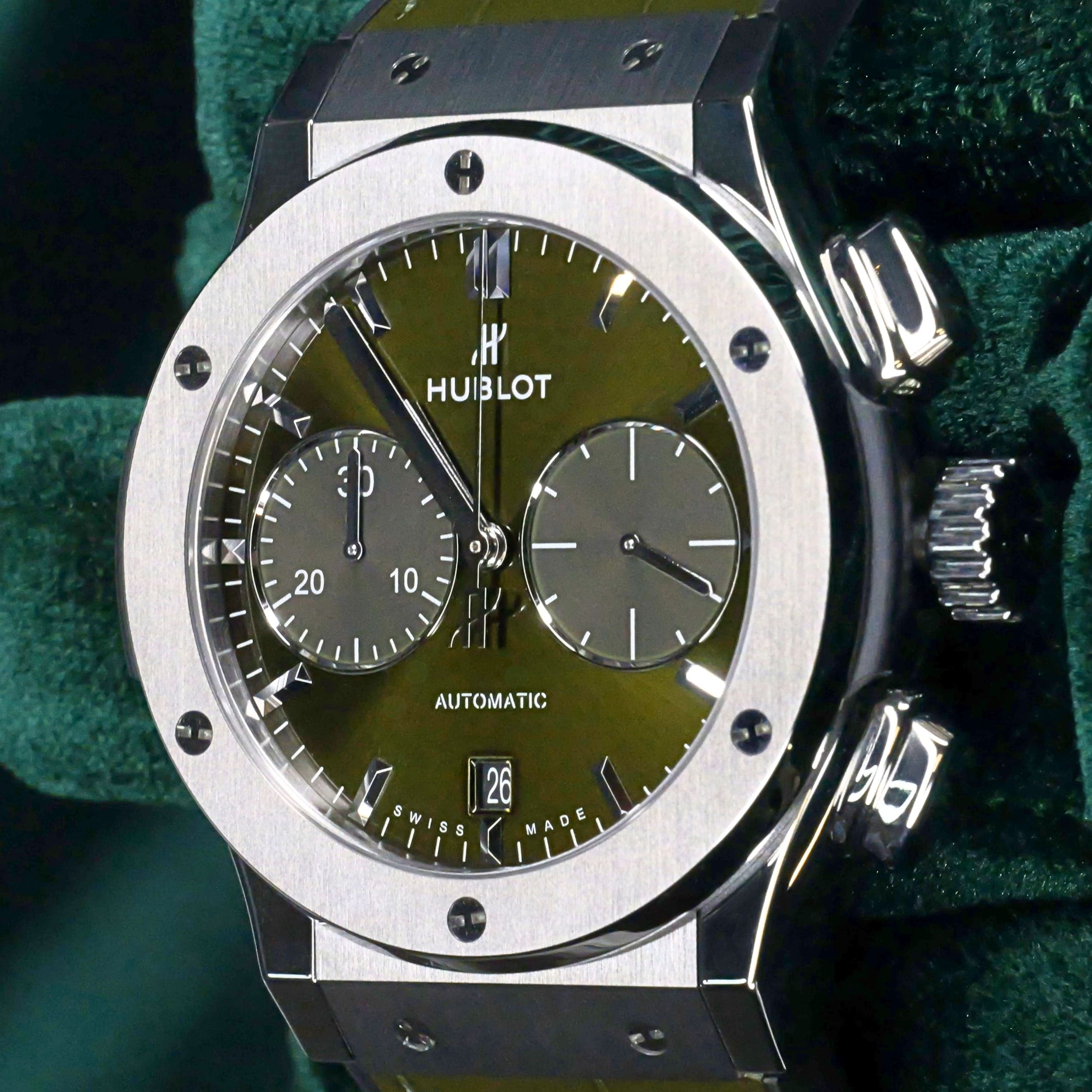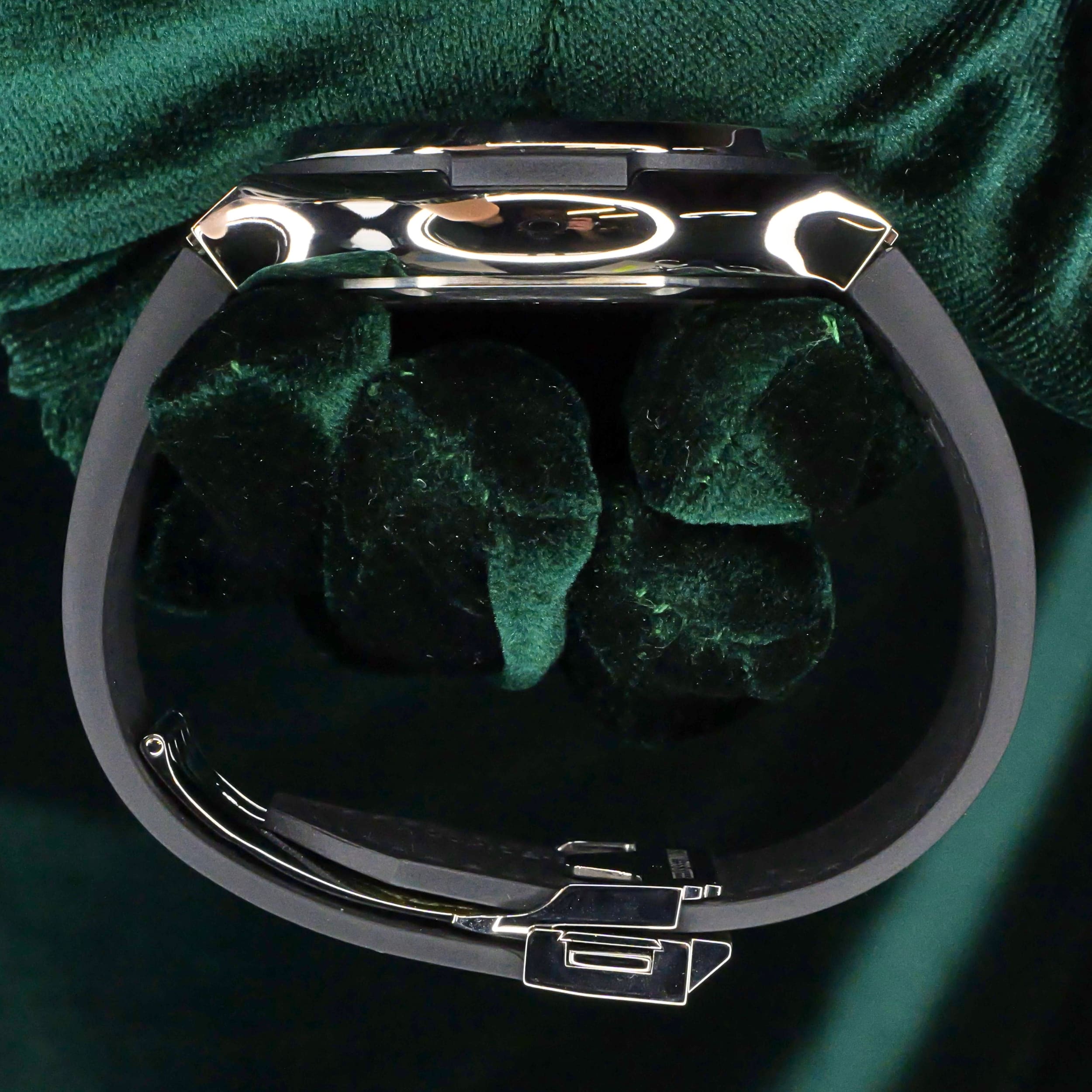 Comes as a full set in its presentation box including the watch pillow, warranty documentation, and additional green rubber strap.
