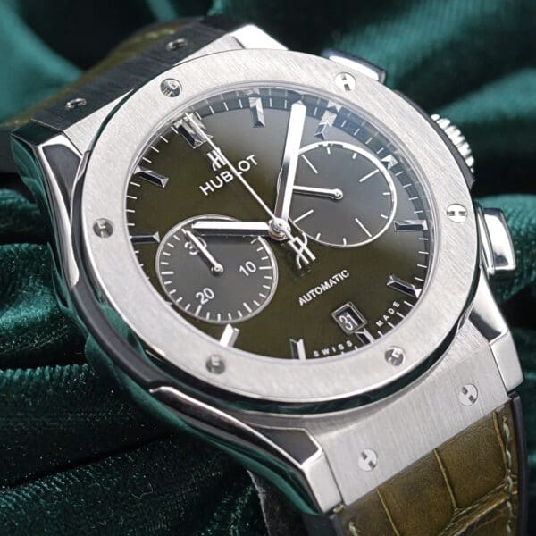 Combination of the green sunray dial, dual strap setup, and titanium case makes this watch visually striking and very light on the wrist, giving a comfortable fit for daily wear. Whether you’re tracking events or simply enjoying the chronograph feature, this piece caters to those who lead an active lifestyle but still desire a watch that radiates luxury.