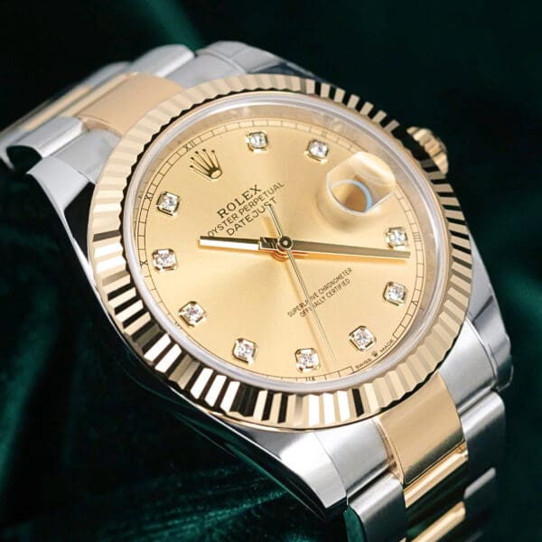 Showcasing a champagne dial with diamond hour markers, the design reflects warm, refined brilliance. Featuring the fluted yellow gold bezel and Oyster case with a balanced mix of polished gold and brushed steel surfaces. Completing the composition, the two-tone Oyster bracelet reinforces its timeless and confident presence.