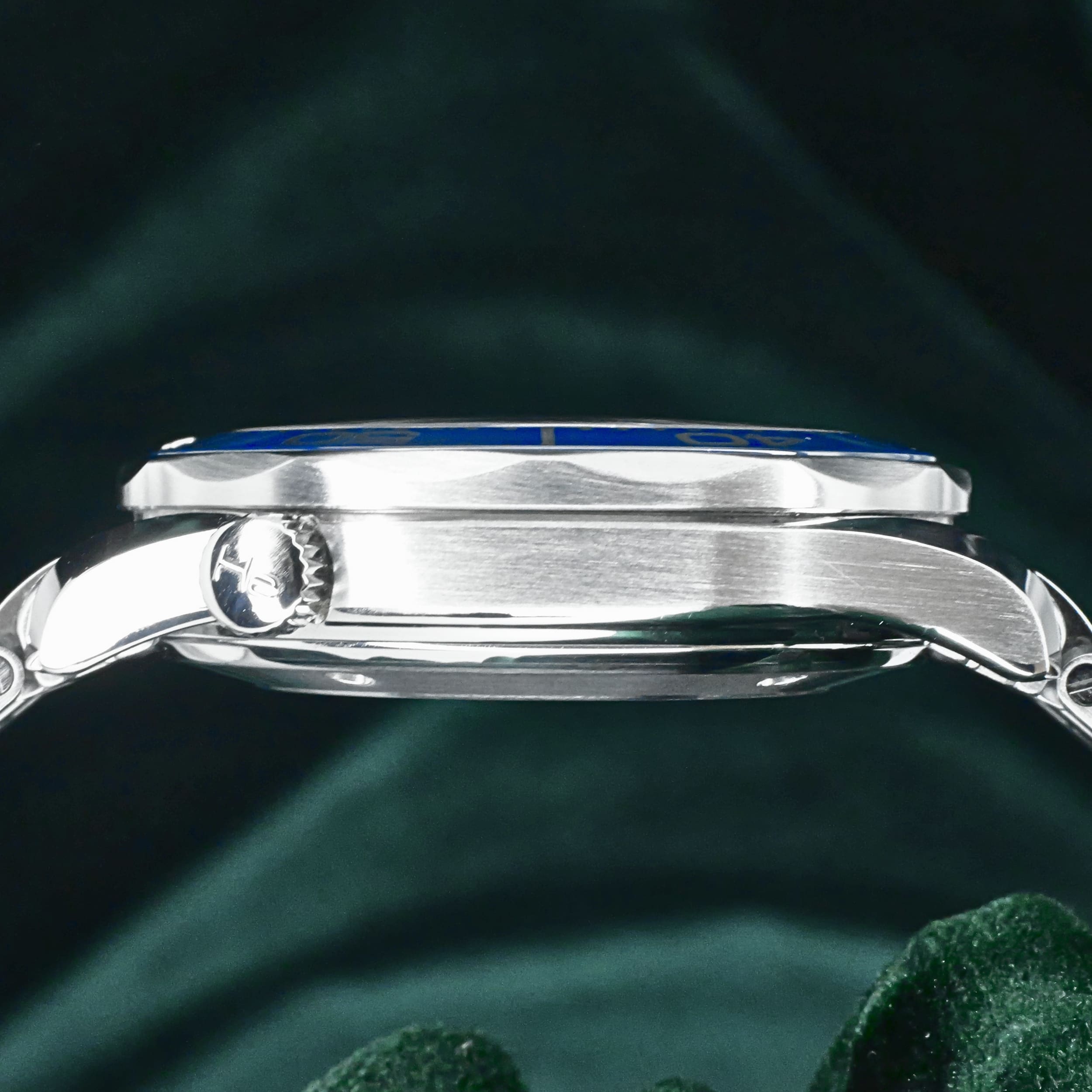 Presents itself in mint condition with little to no signs of wear. Showcases a blue dial that appears smooth and rich in color, creating a clean and bold visual presence. Features a blue ceramic bezel that remains glossy and sharp, with clear numerals and strong contrast. Stainless steel case and bracelet show a refined mix of brushed and polished finishes that feel solid and comfortable on the wrist.