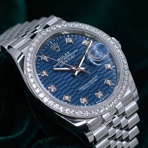 Rooted in the enduring legacy of the Datejust, this configuration elevates everyday elegance through refined texture and factory gem-setting. A blue motif dial paired with diamond hour markers and a brilliant diamond bezel creates a balance of sophistication and unmistakable presence.
