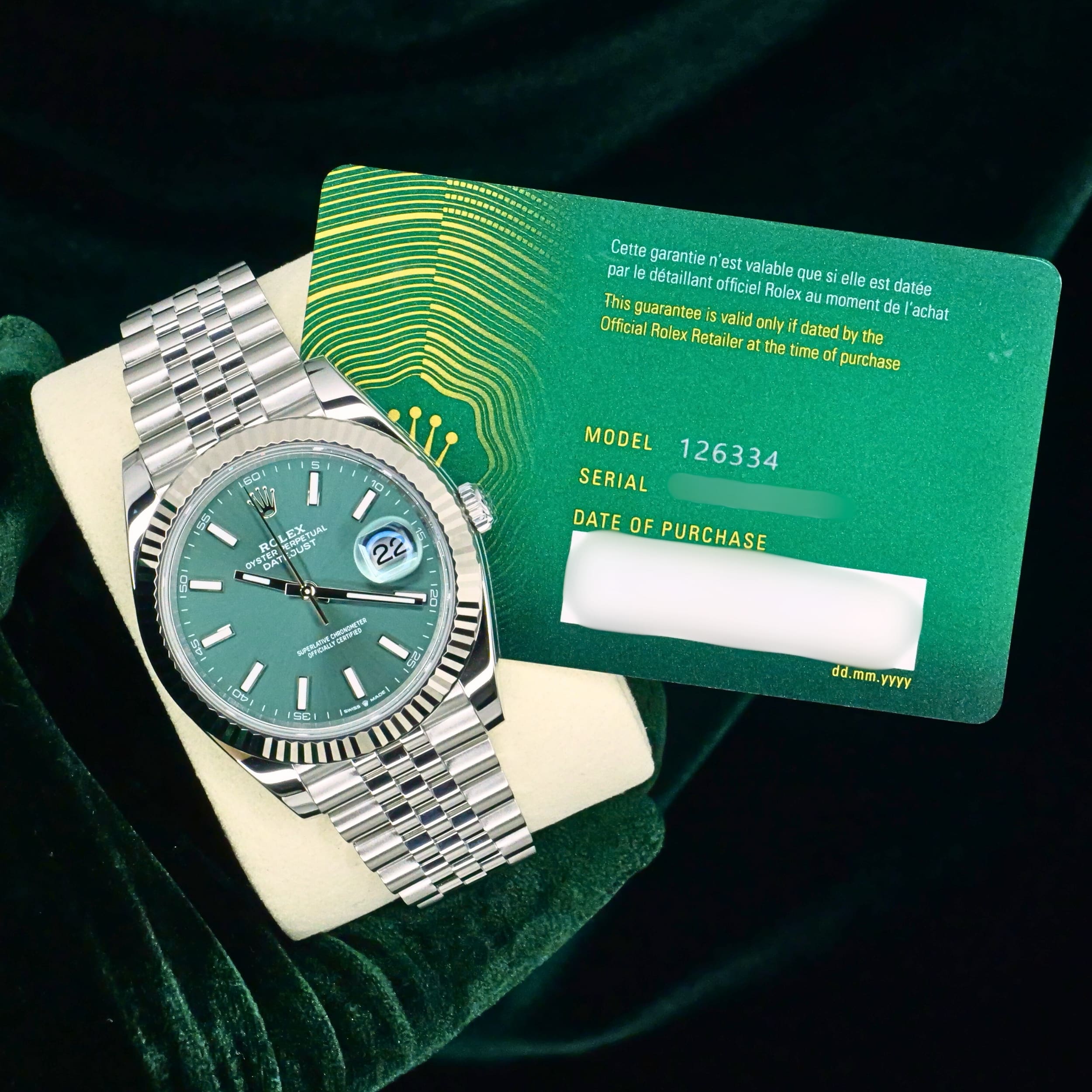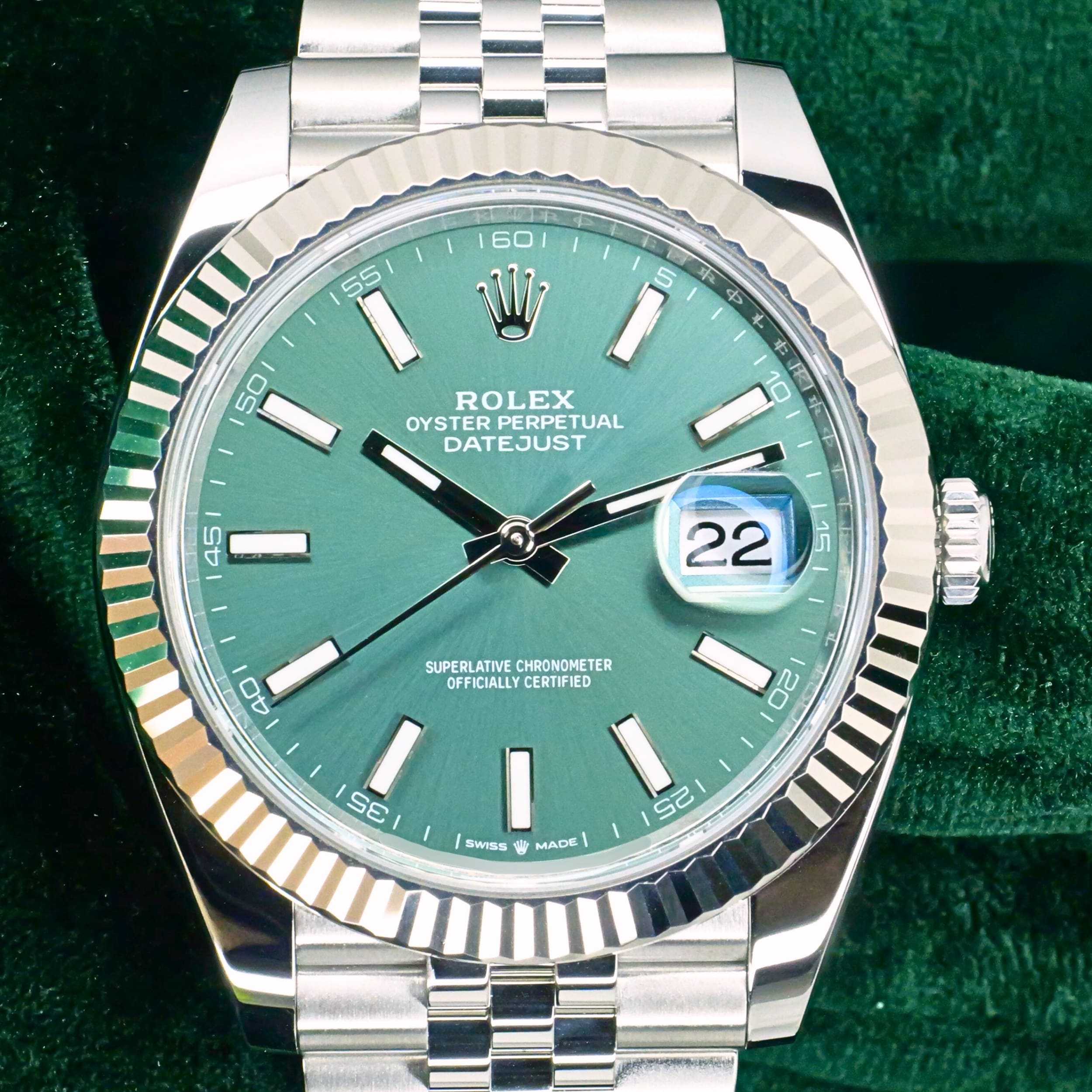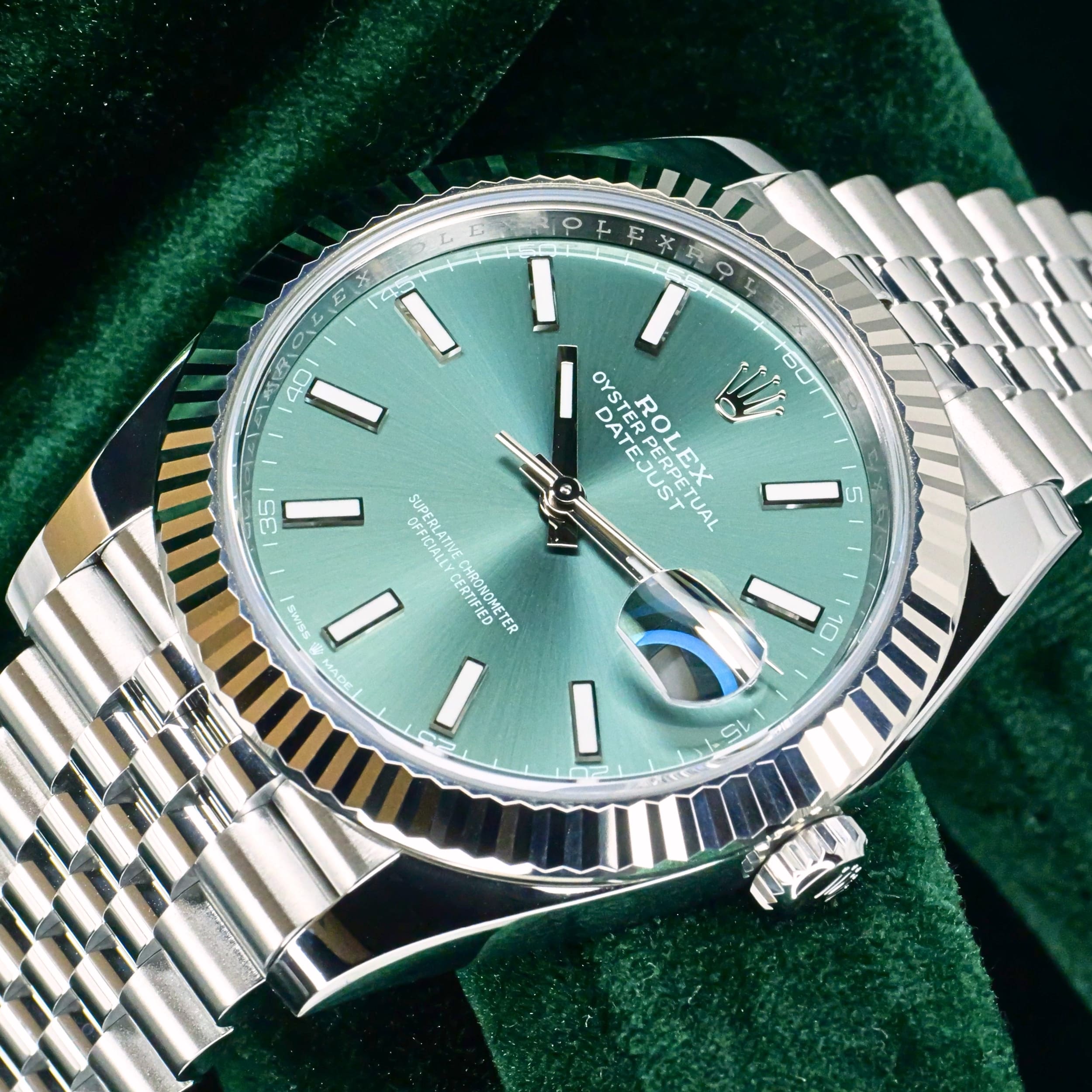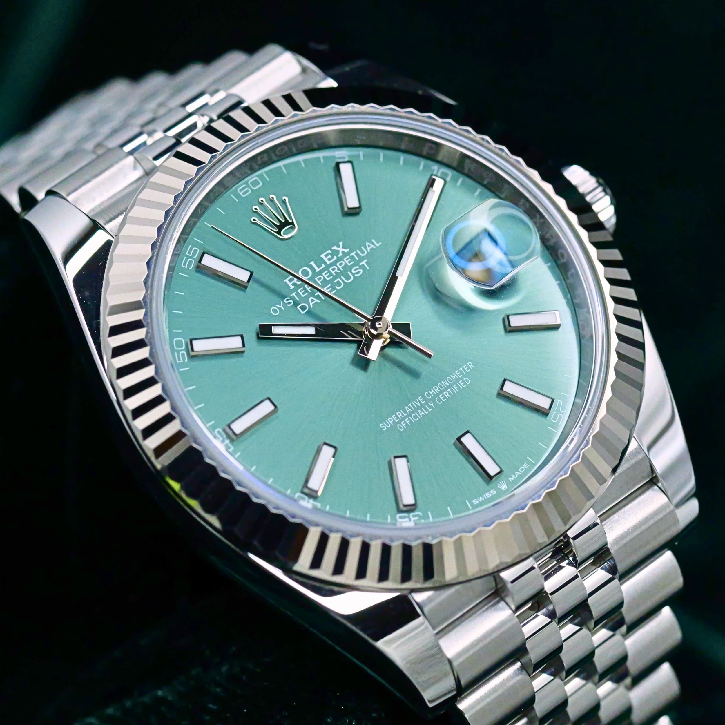 Mint green dial execution brings a fresh and modern twist to the classic Datejust design, paired perfectly with the white gold fluted bezel and Jubilee bracelet. Ideal for collectors who want a refined everyday timepiece with strong visual identity and timeless appeal, this reference delivers elegance with modern presence.