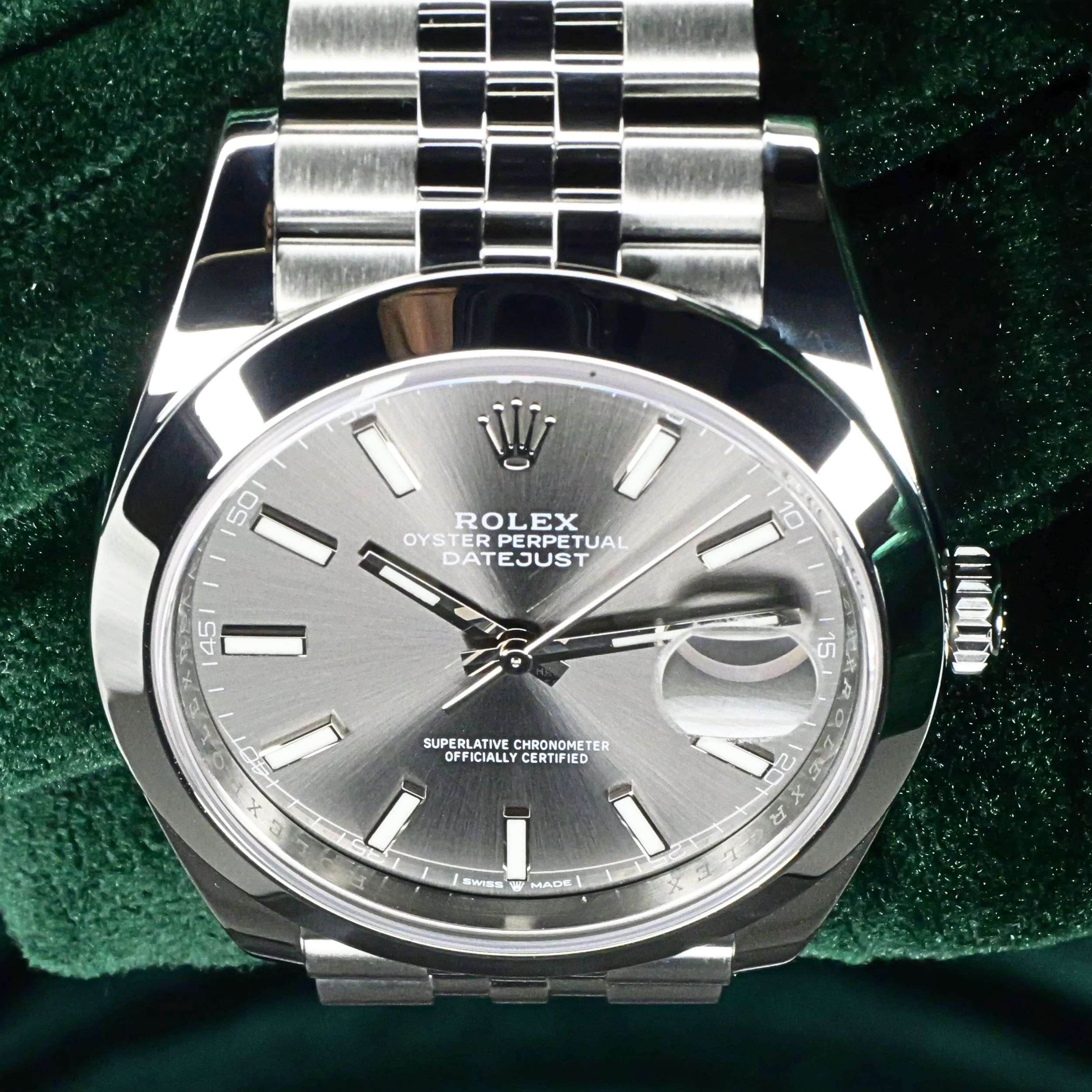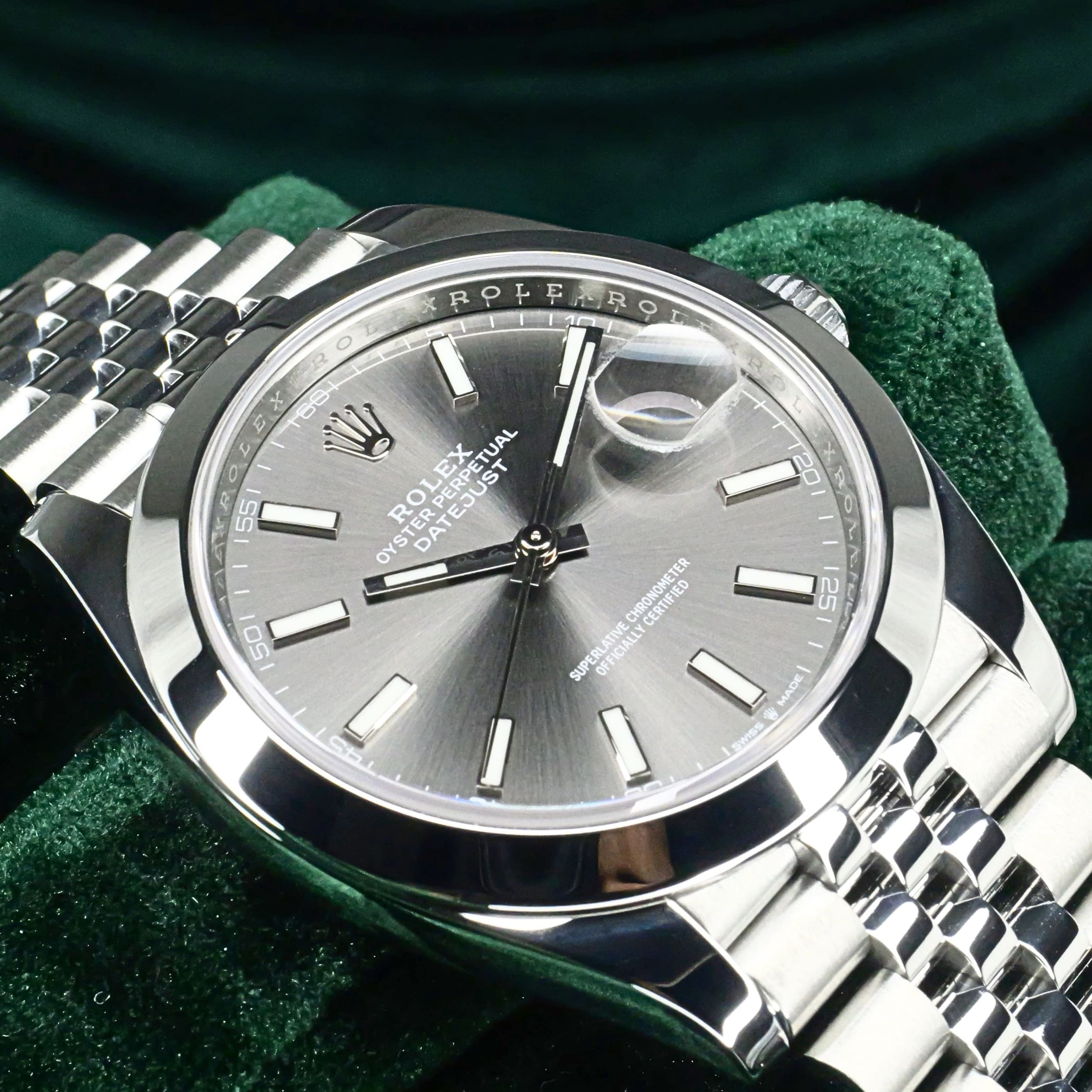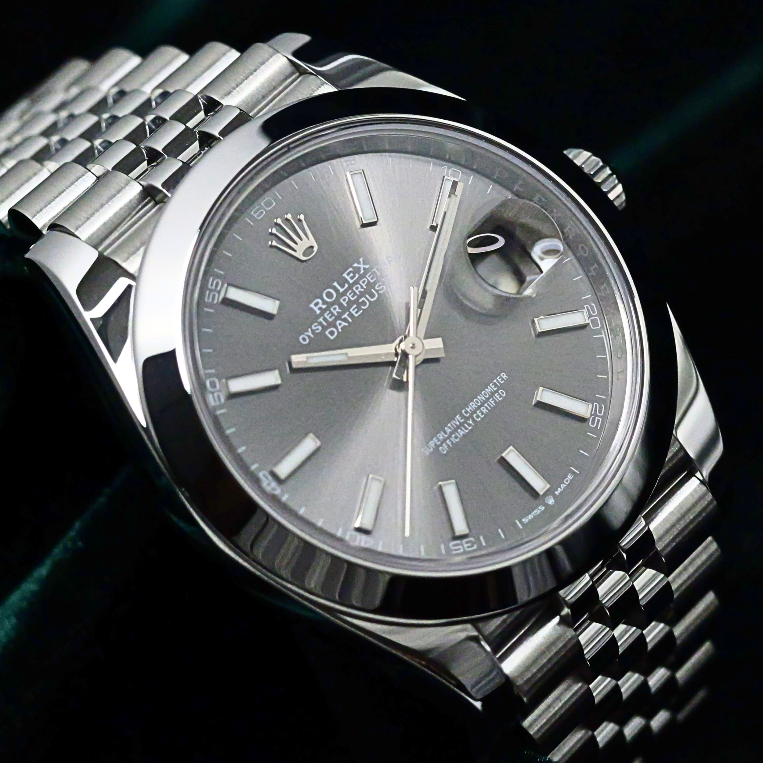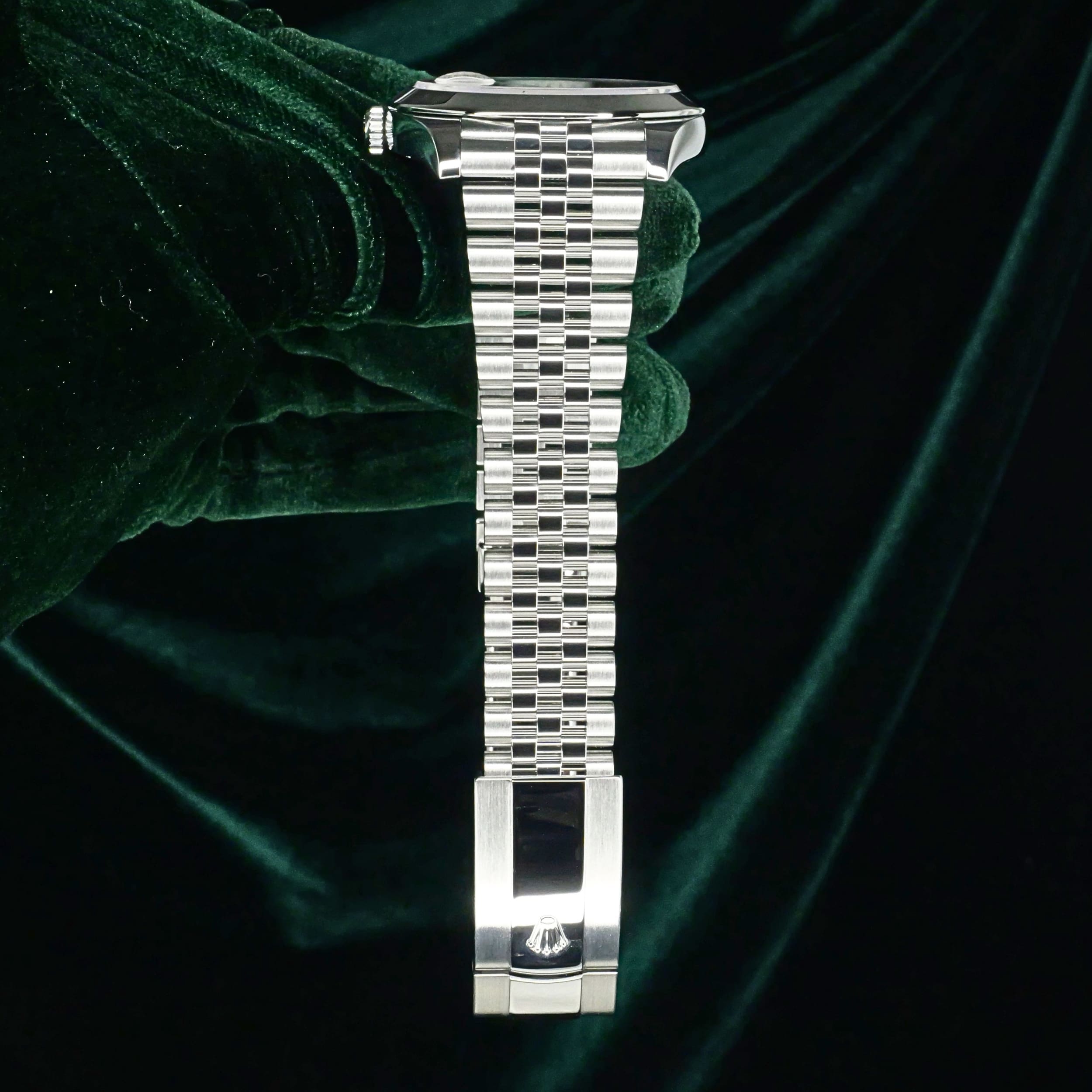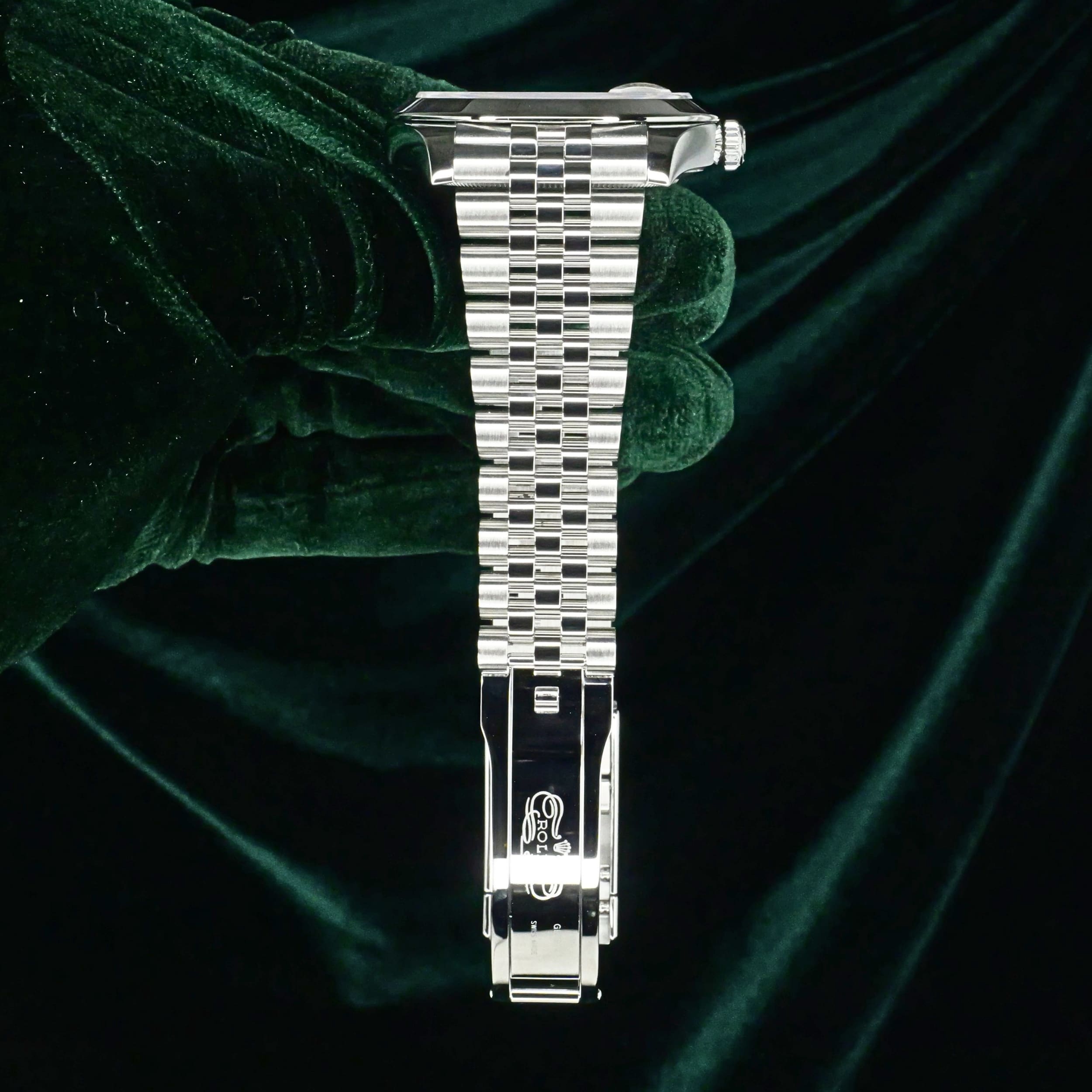 Presents itself in mint condition with little to no signs of wear. A rhodium grey sunray dial gives the front a calm, sophisticated depth, shifting beautifully in tone as light moves across its surface. Surrounding it, the smooth Oystersteel bezel creates a crisp and uninterrupted profile that feels sleek, modern, and especially refined. Completing the composition, the Jubilee bracelet adds texture, fluidity, and comfort through its elegant five-piece link design.