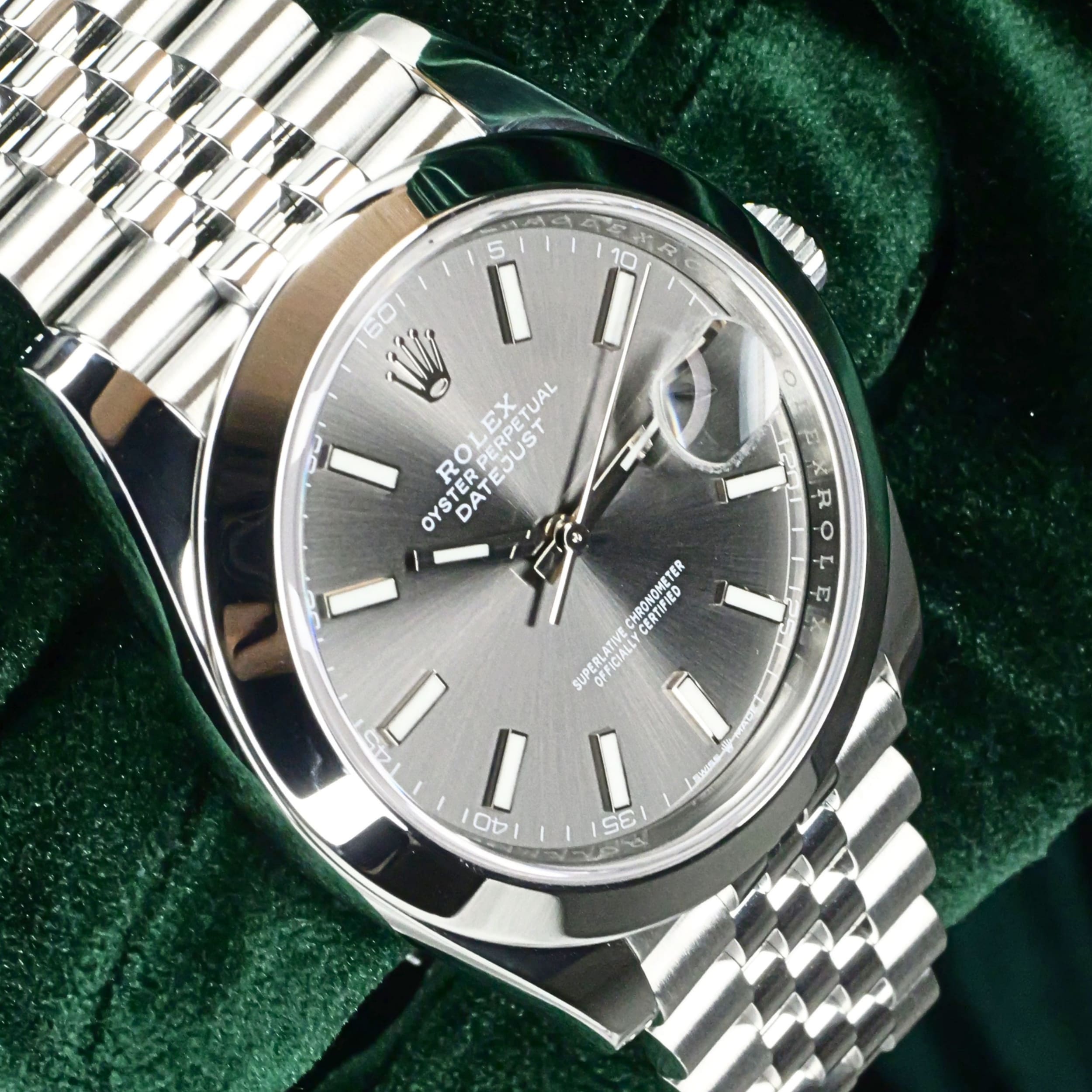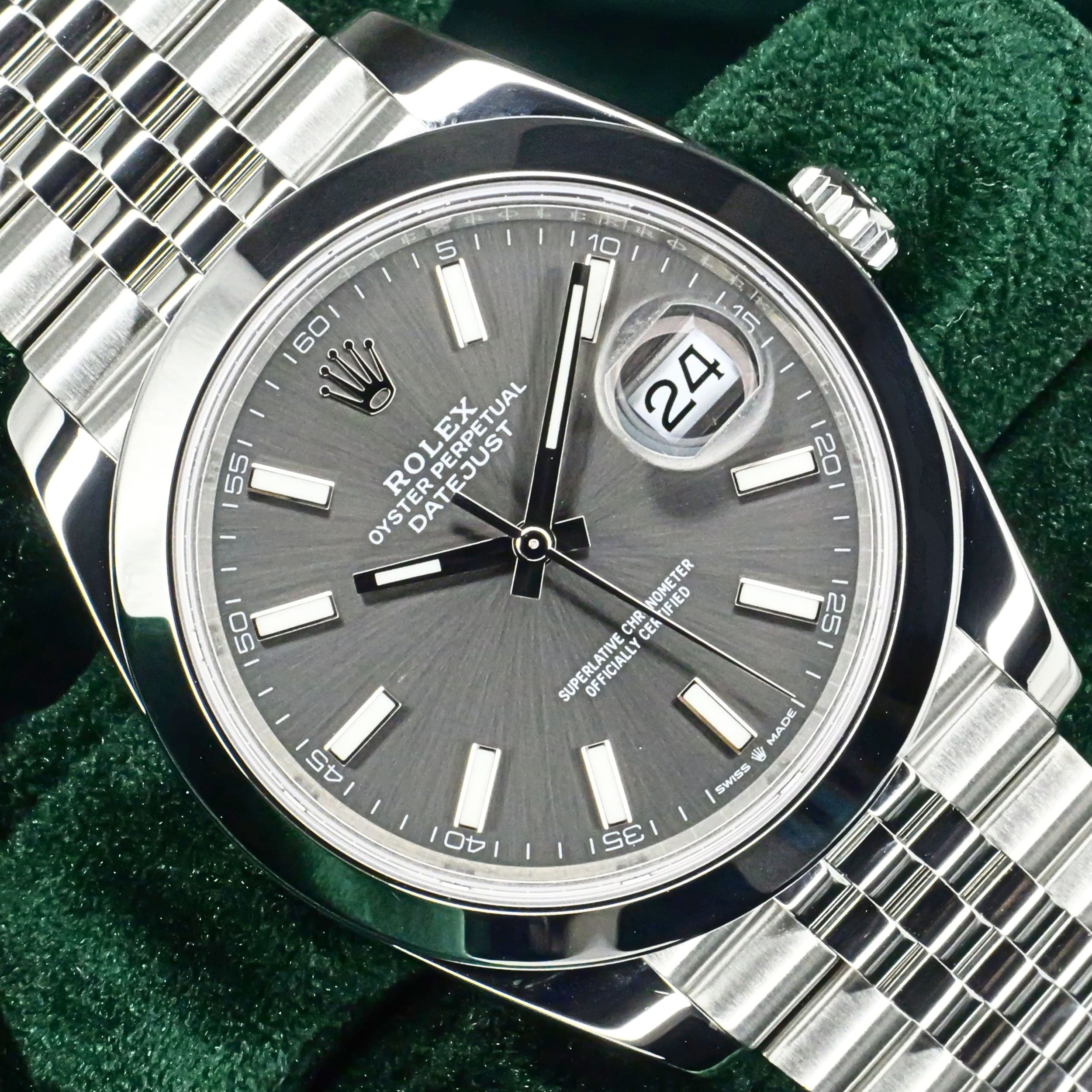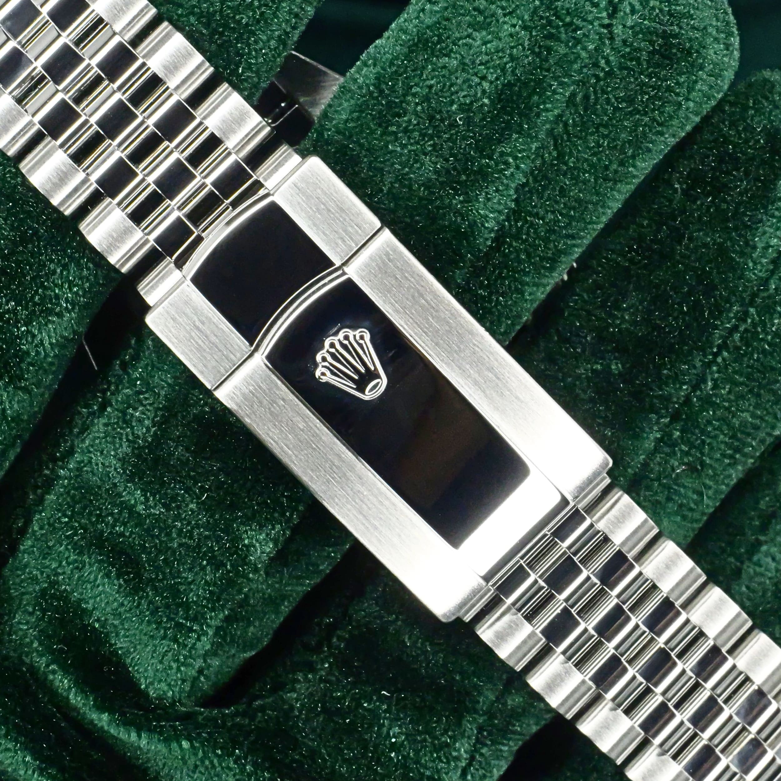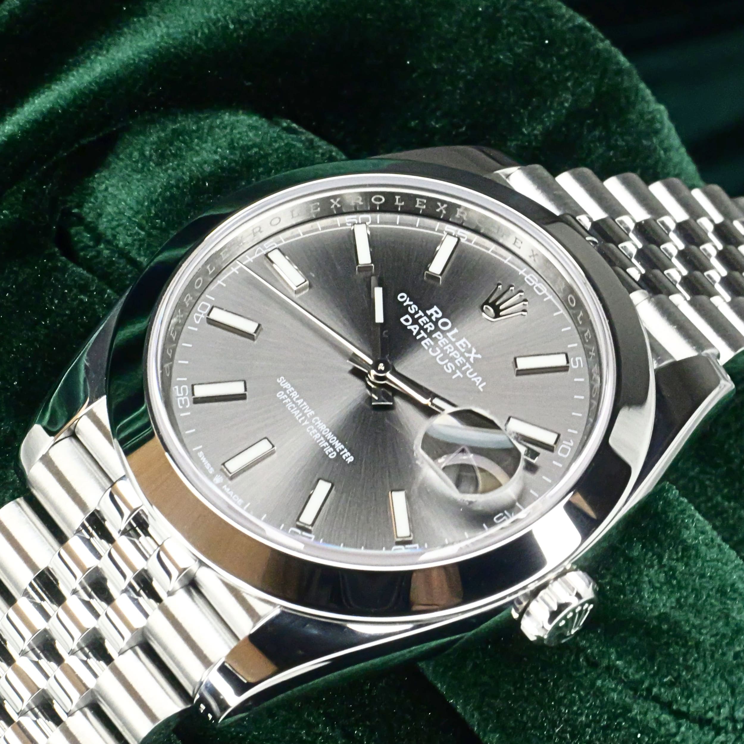 Presents itself in mint condition with little to no signs of wear. A rhodium grey sunray dial gives the front a calm, sophisticated depth, shifting beautifully in tone as light moves across its surface. Surrounding it, the smooth Oystersteel bezel creates a crisp and uninterrupted profile that feels sleek, modern, and especially refined. Completing the composition, the Jubilee bracelet adds texture, fluidity, and comfort through its elegant five-piece link design.