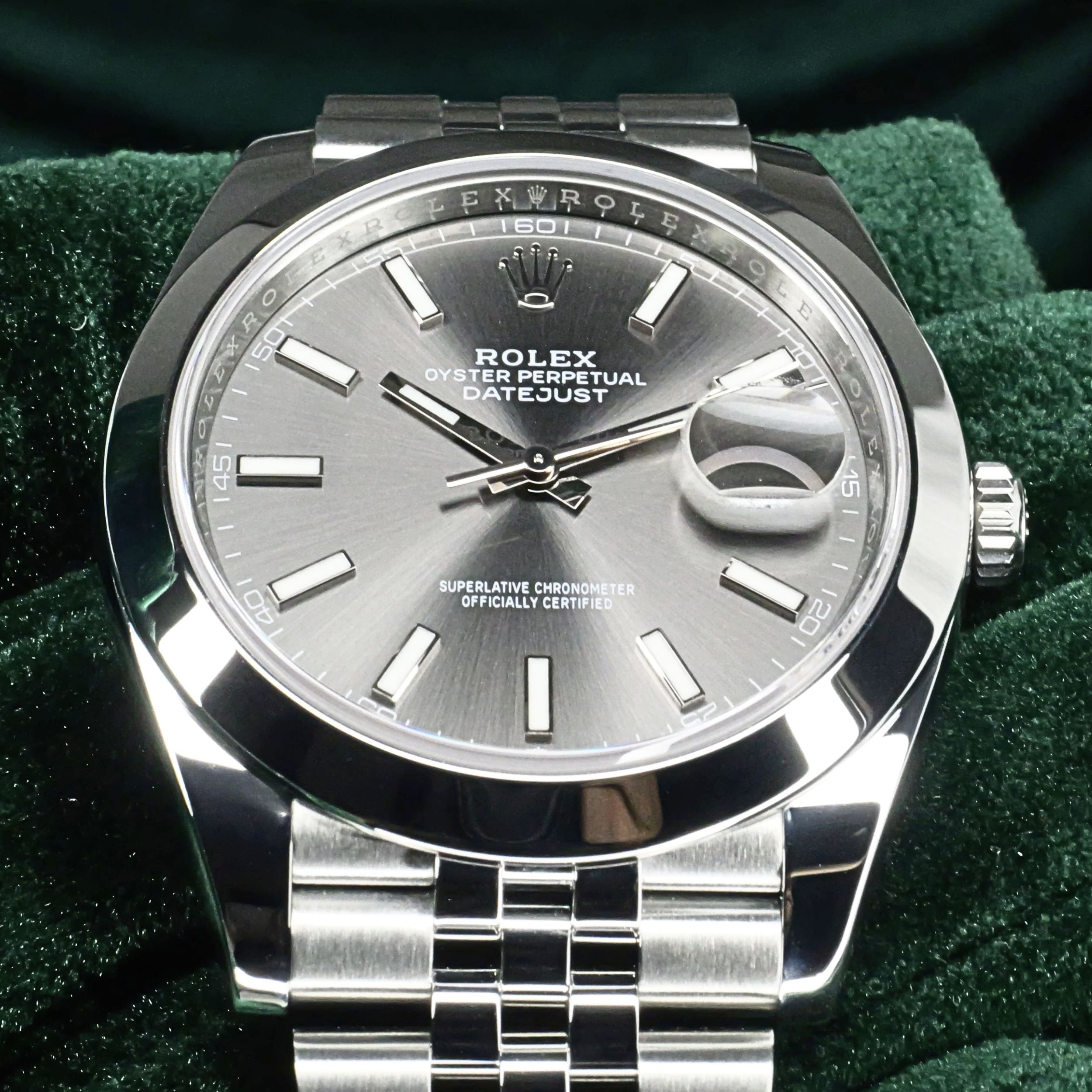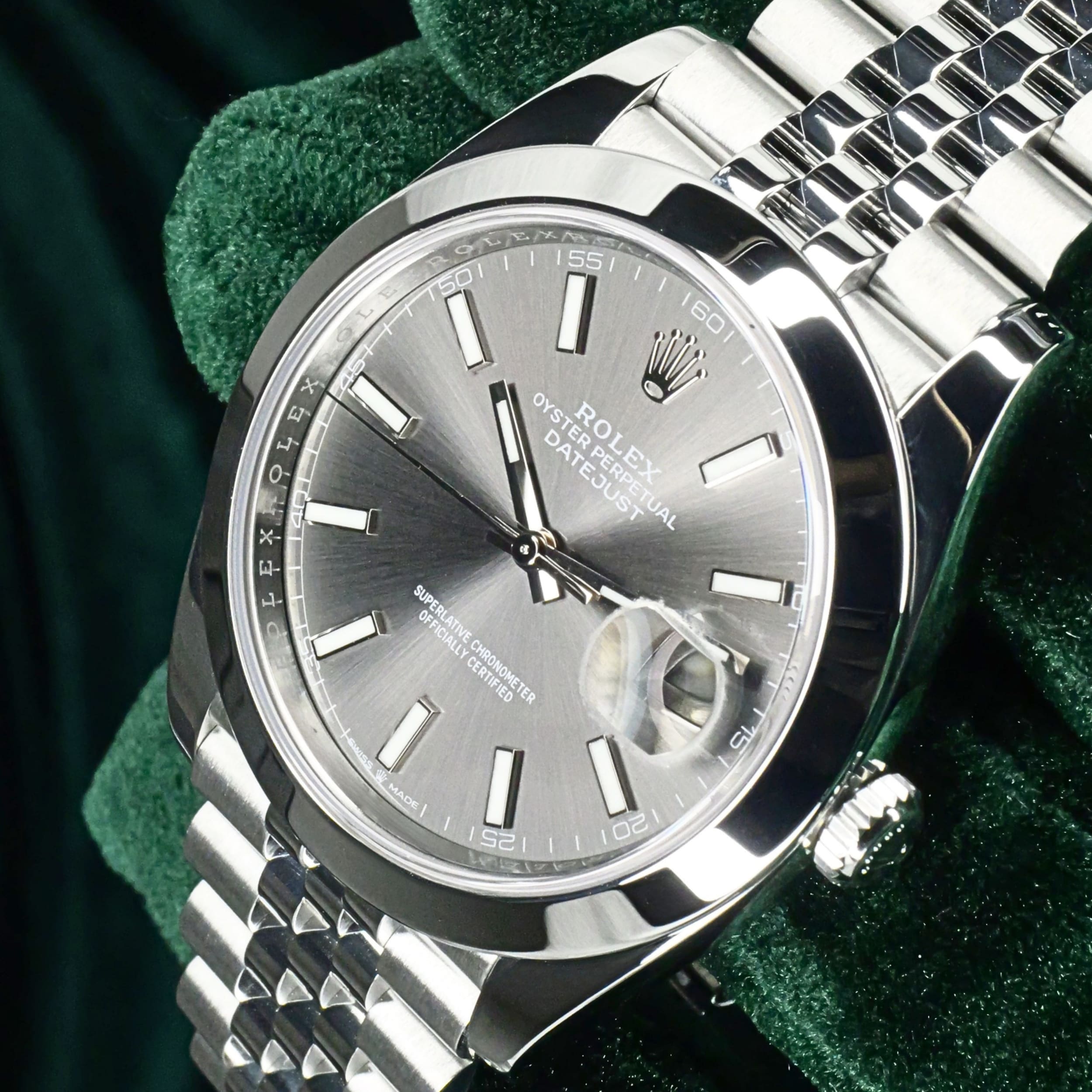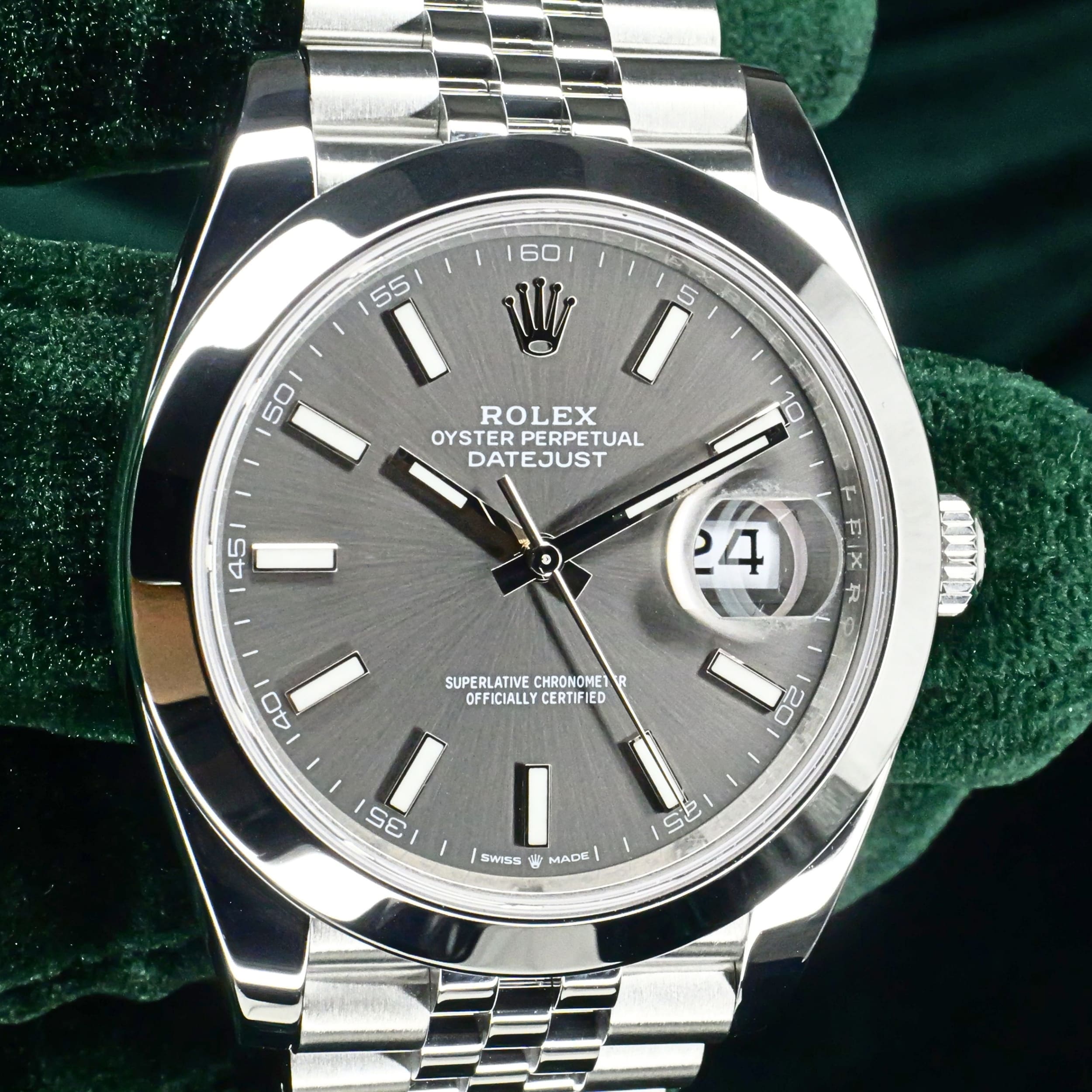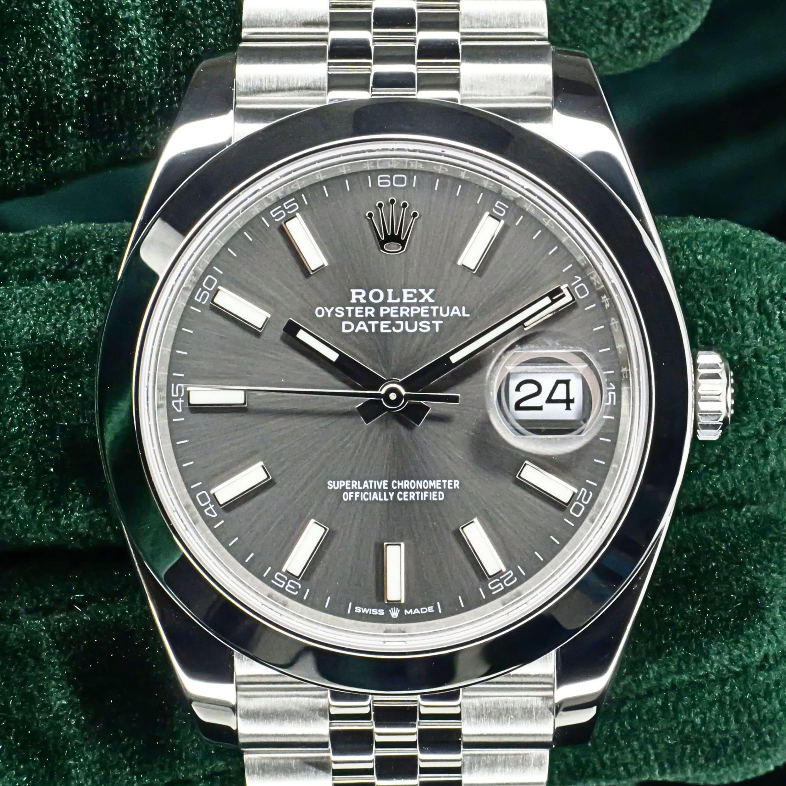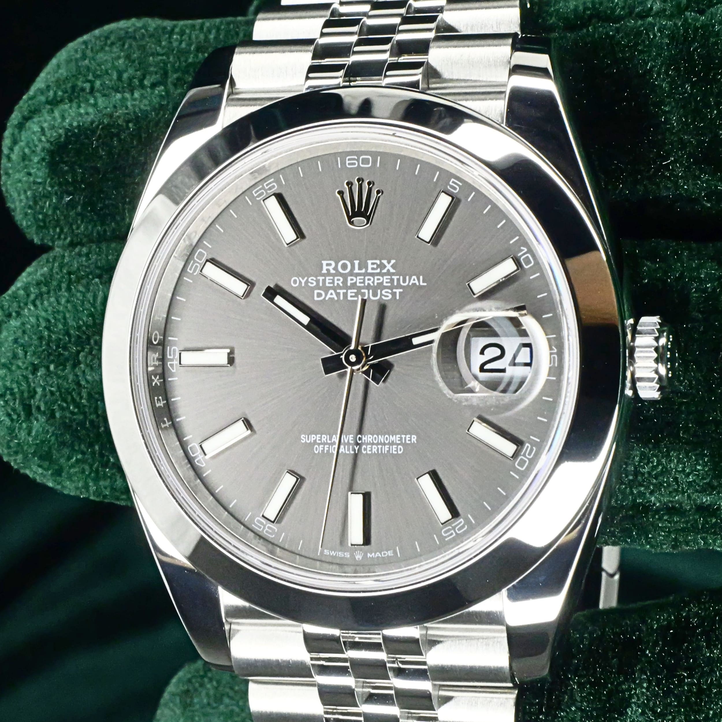 Presents itself in mint condition with little to no signs of wear. A rhodium grey sunray dial gives the front a calm, sophisticated depth, shifting beautifully in tone as light moves across its surface. Surrounding it, the smooth Oystersteel bezel creates a crisp and uninterrupted profile that feels sleek, modern, and especially refined. Completing the composition, the Jubilee bracelet adds texture, fluidity, and comfort through its elegant five-piece link design.