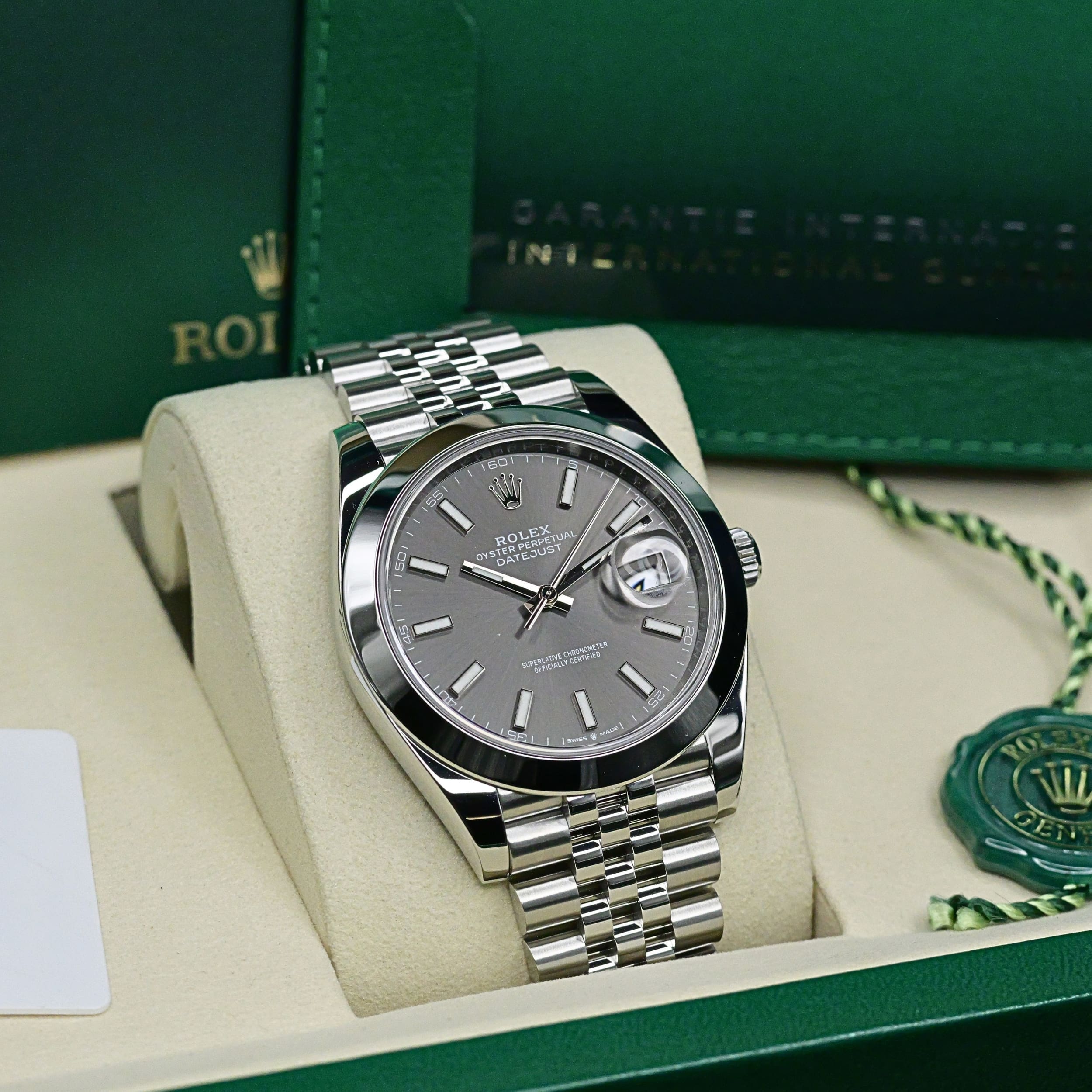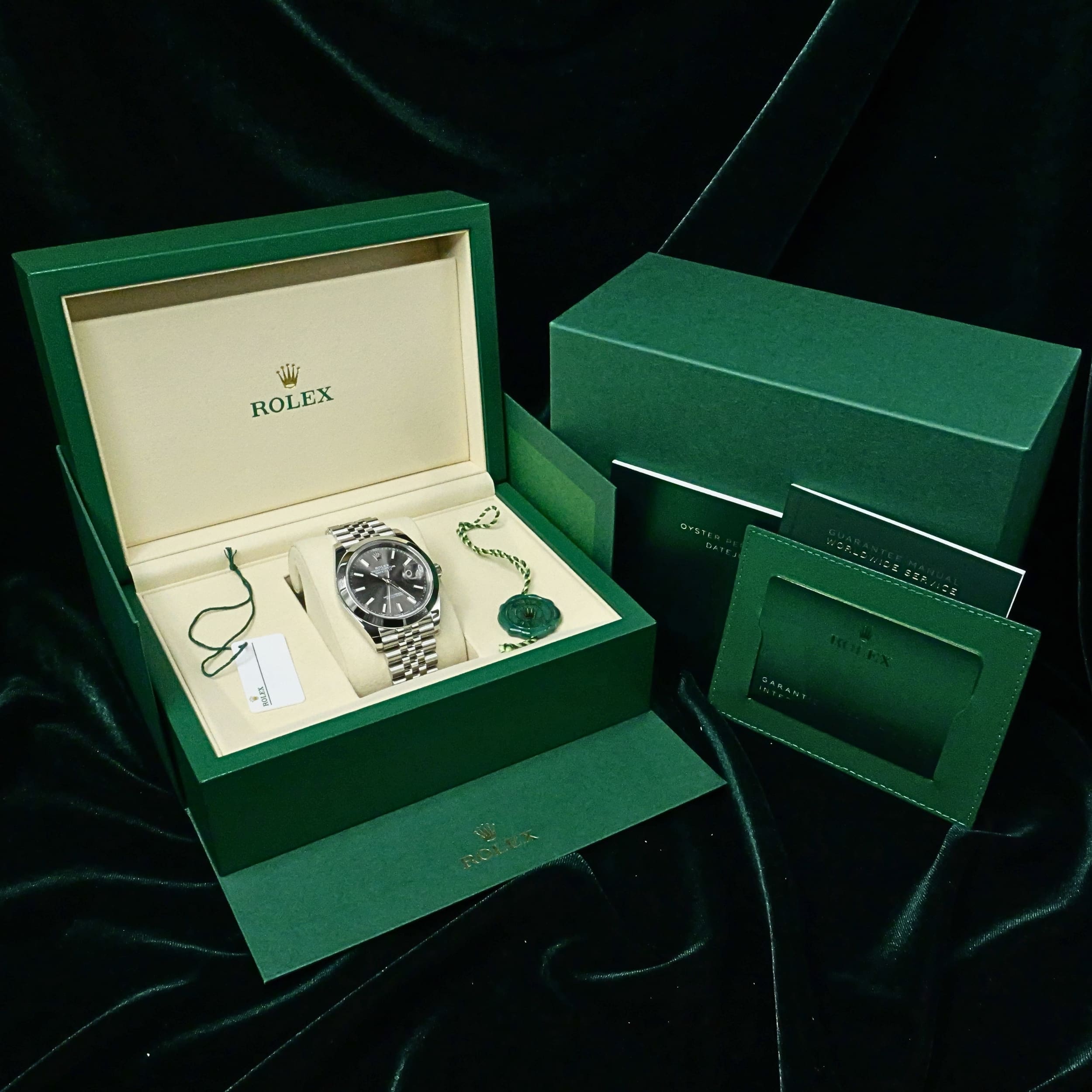 Comes as a full set, boxed with a watch pillow, warranty wallet with card, manual booklet, Perpetual Datejust booklet, and Rolex green-and-white hang tag.