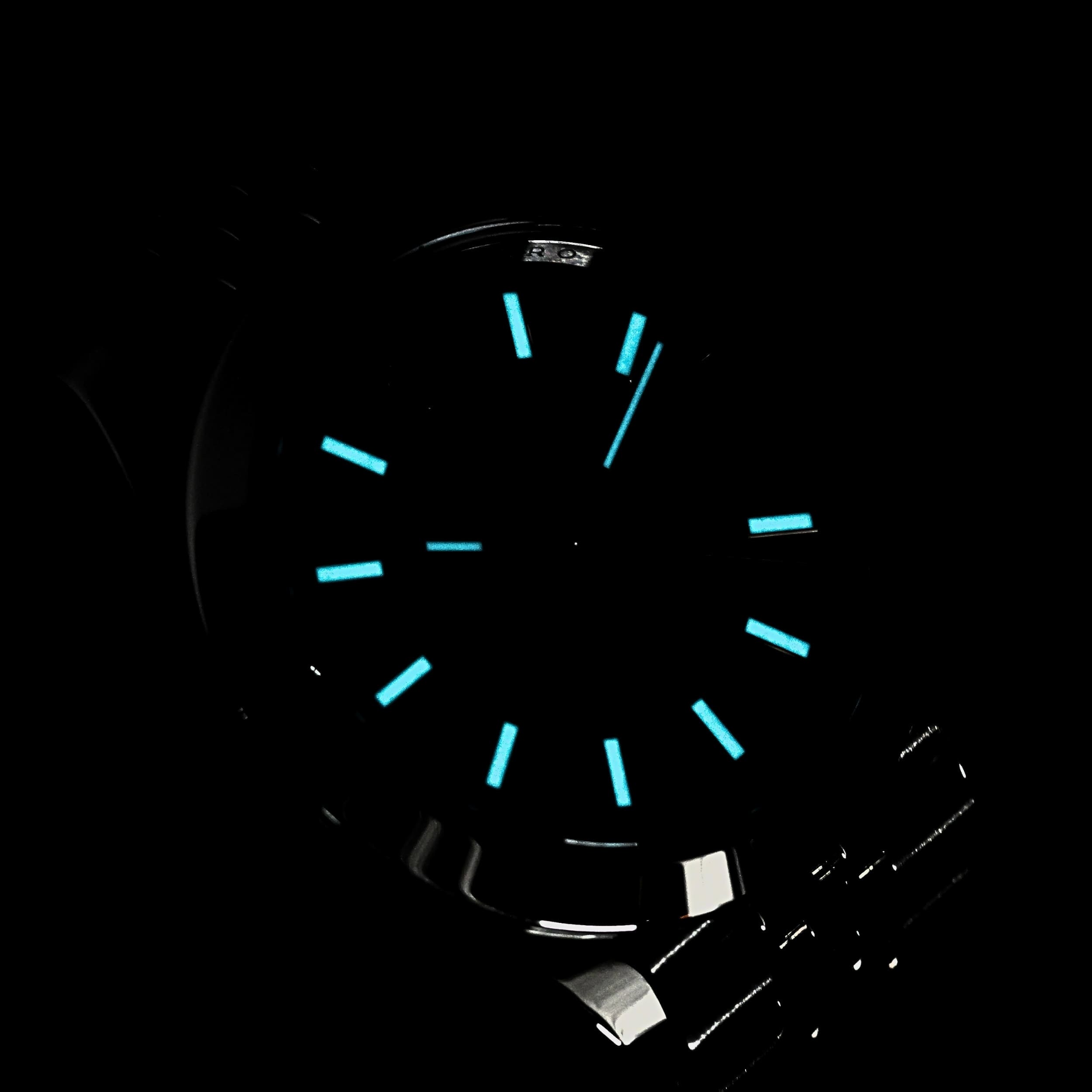 Functions include hours, minutes, seconds, and date. A screw-down crown operates winding, time-setting, and quick-setting of the date, while the stop-seconds function allows precise synchronization. Chromalight-filled hands and markers provide a long-lasting blue glow for strong legibility in low light.