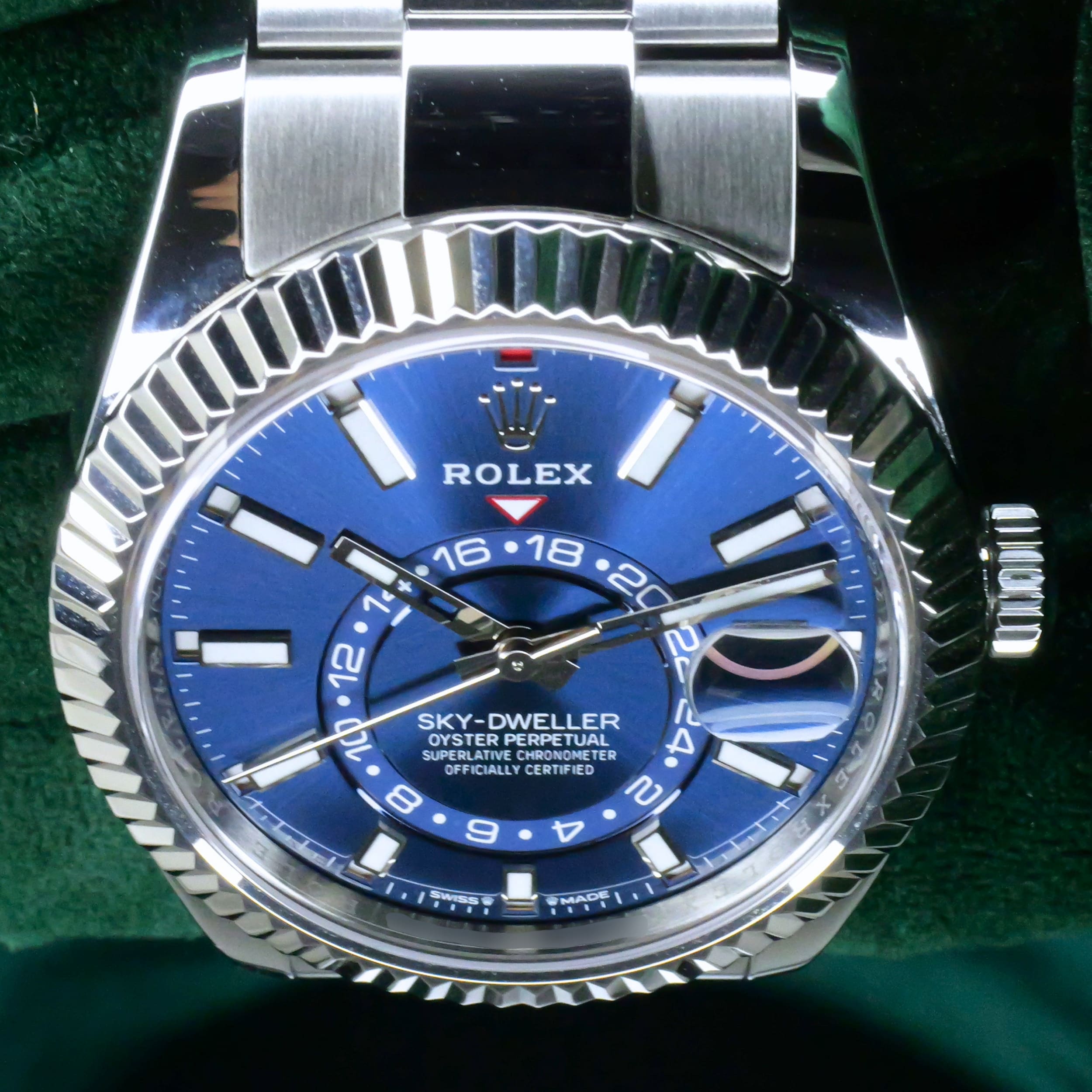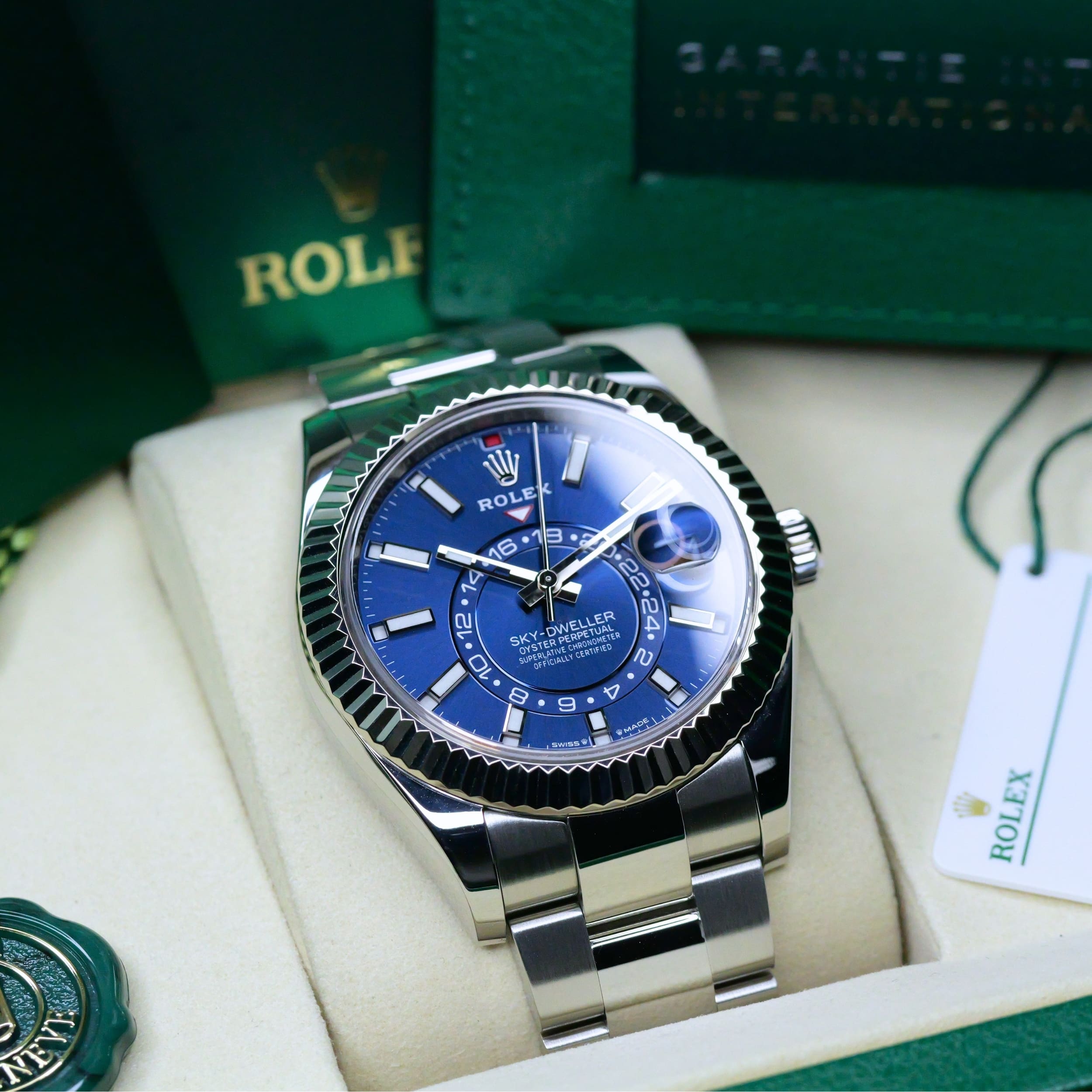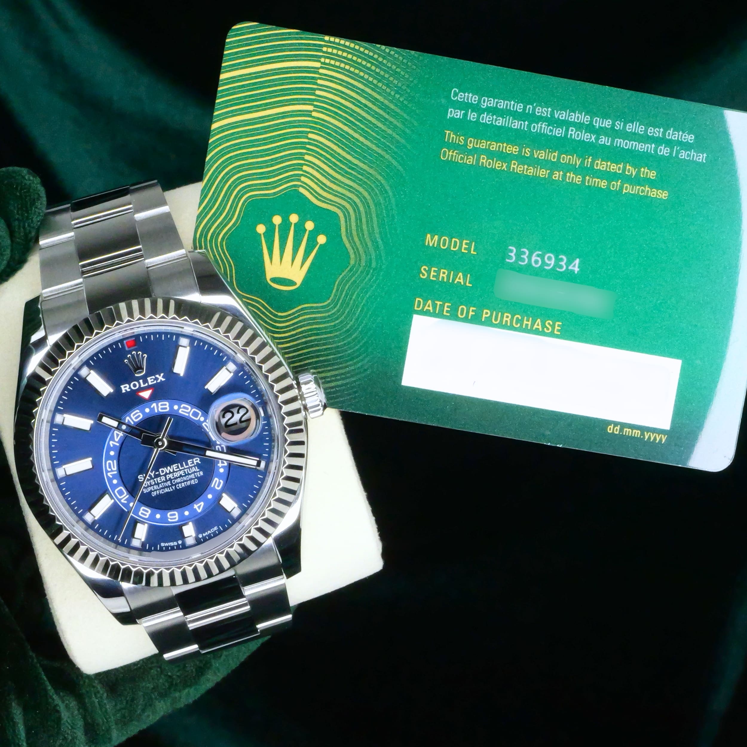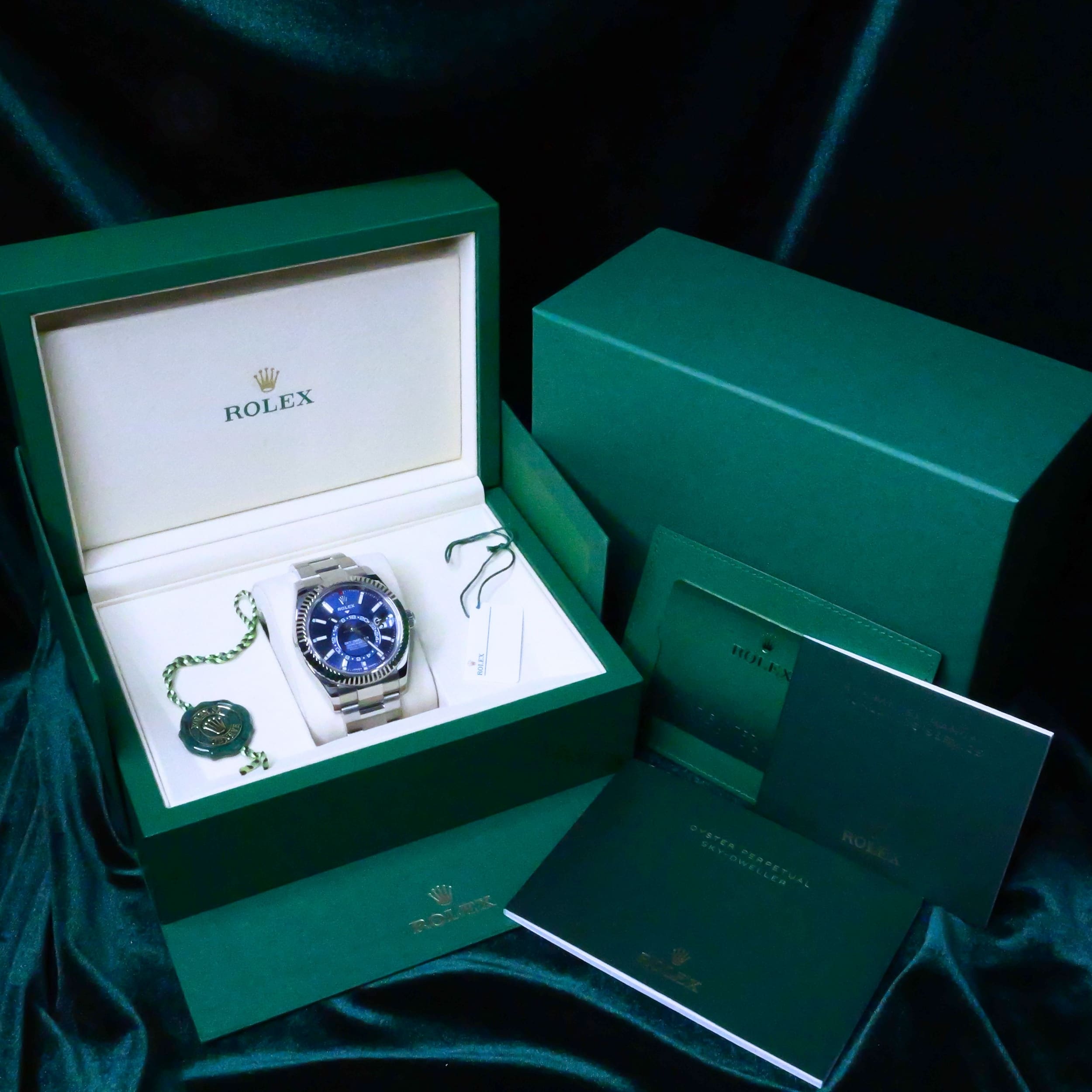Comes as a full set, double-boxed with warranty card, warranty wallet, sky-dweller manual, Rolex white tag and Rolex green tag.