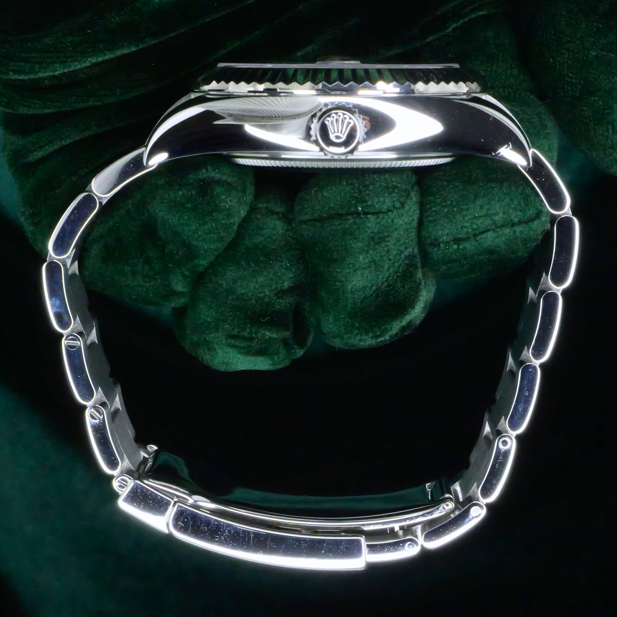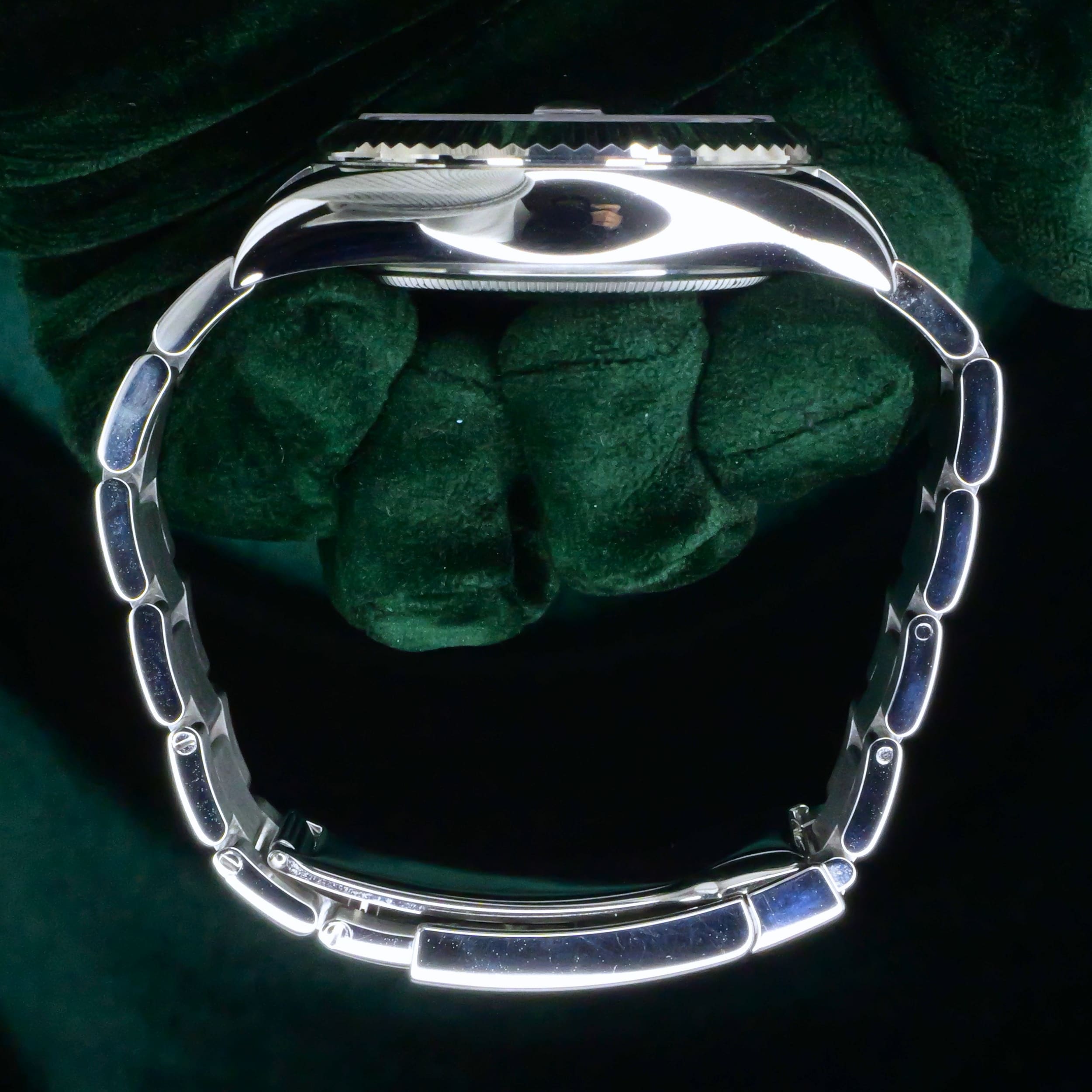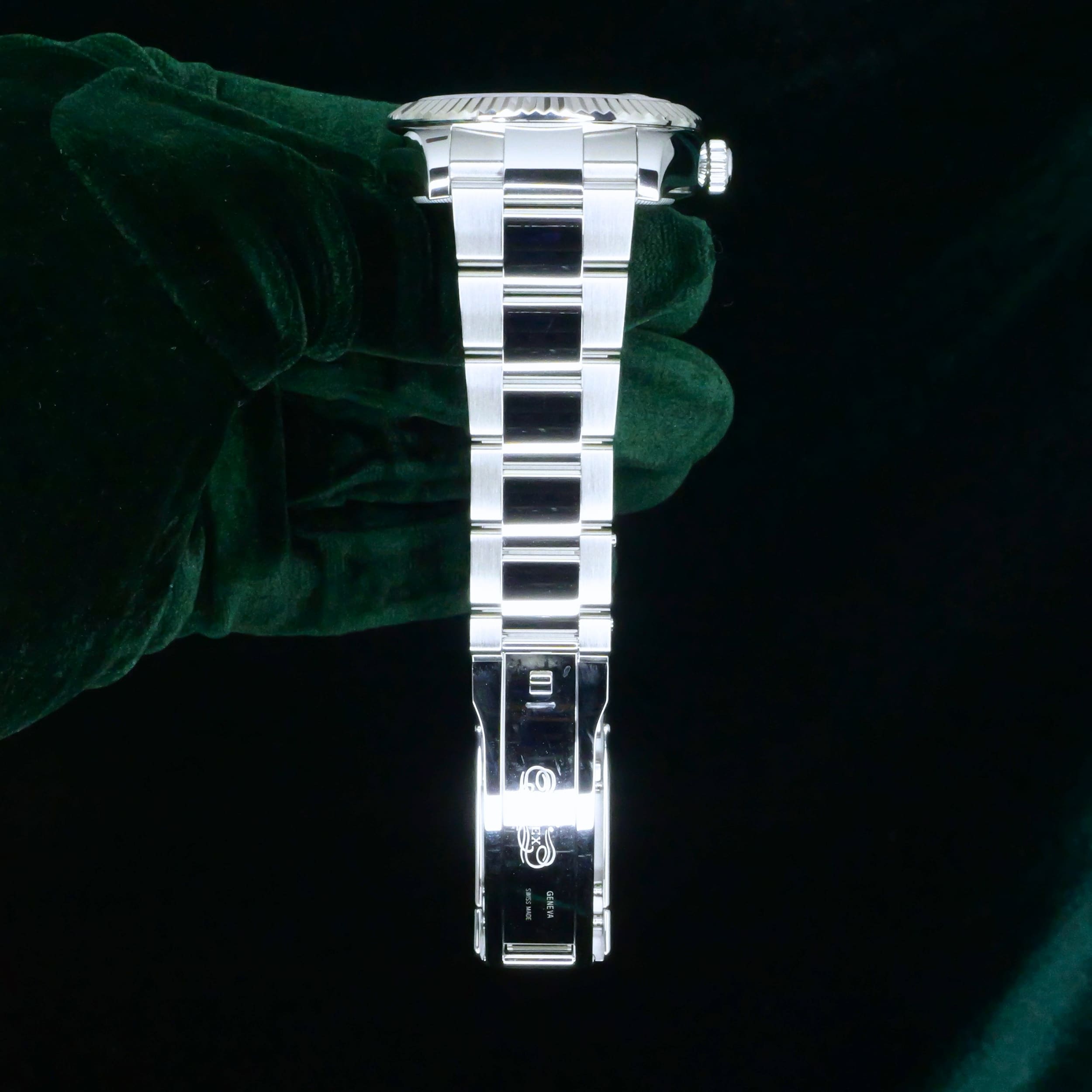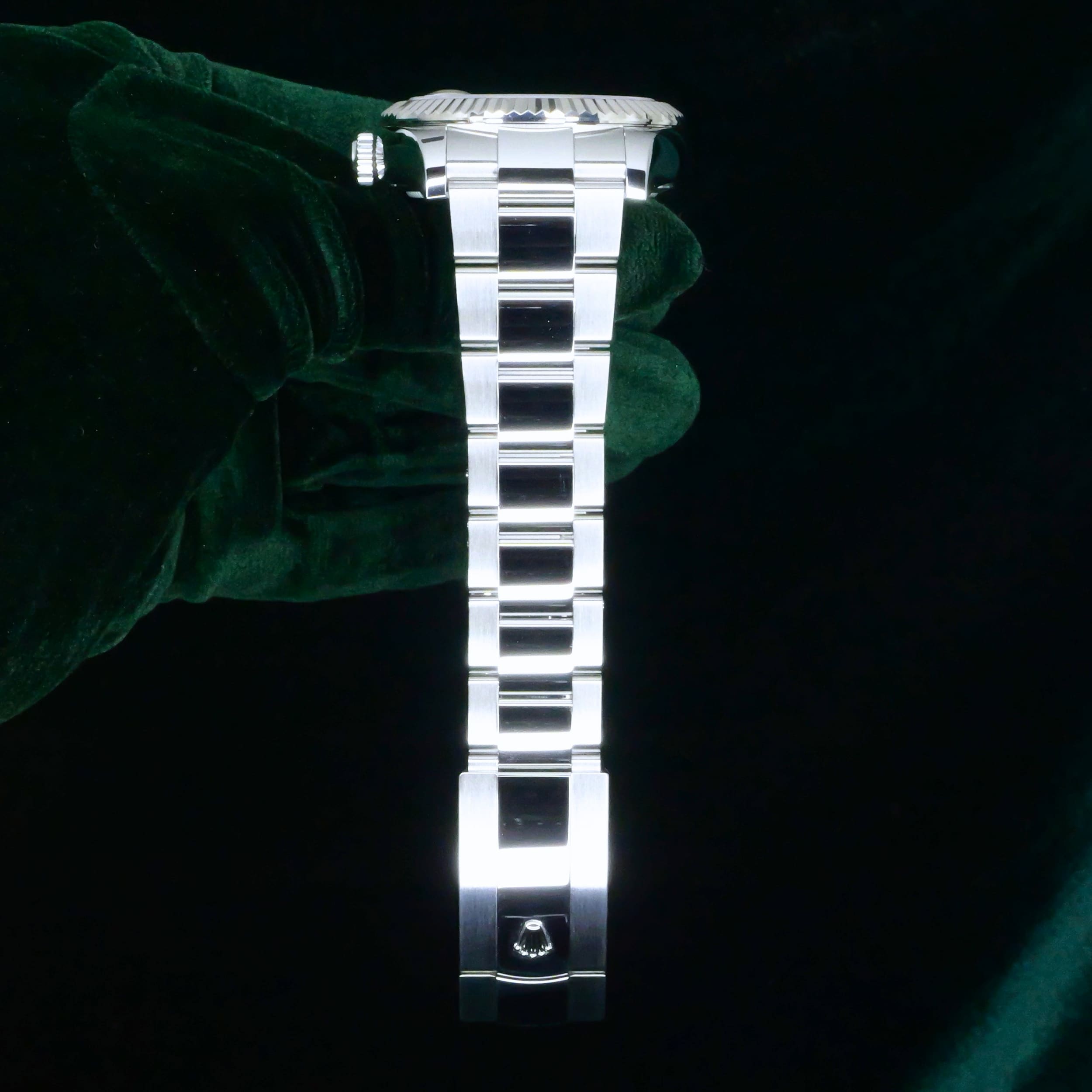 Presents itself in mint condition with little to no signs of wear. Blue dial gives the watch a rich, vivid look that stands out beautifully against the steel case. White gold fluted bezel catches the light with sharp, elegant detail and gives the watch one of its most recognizable features. Oyster bracelet adds a clean, sporty finish and flows smoothly into the case for a strong and refined look on the wrist.