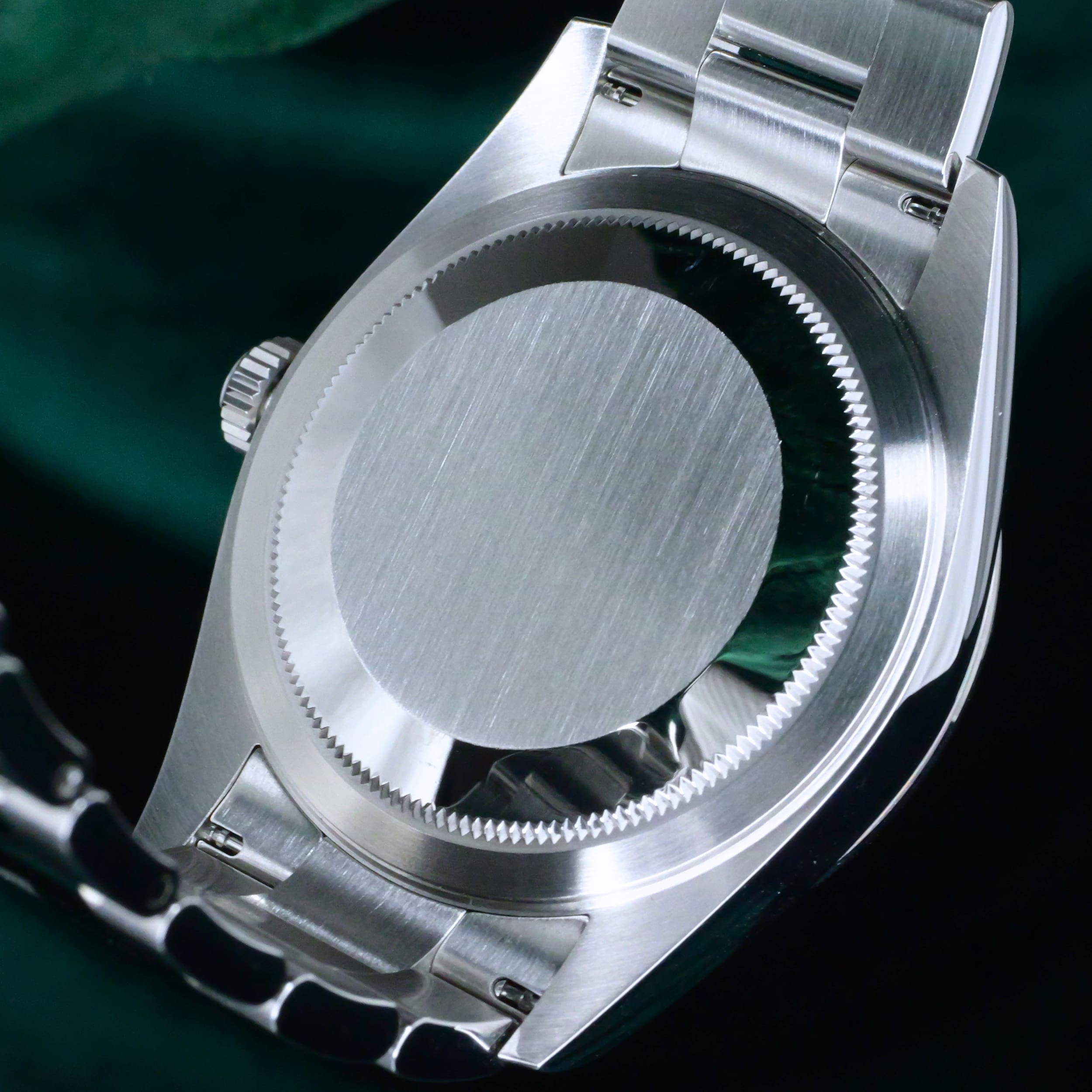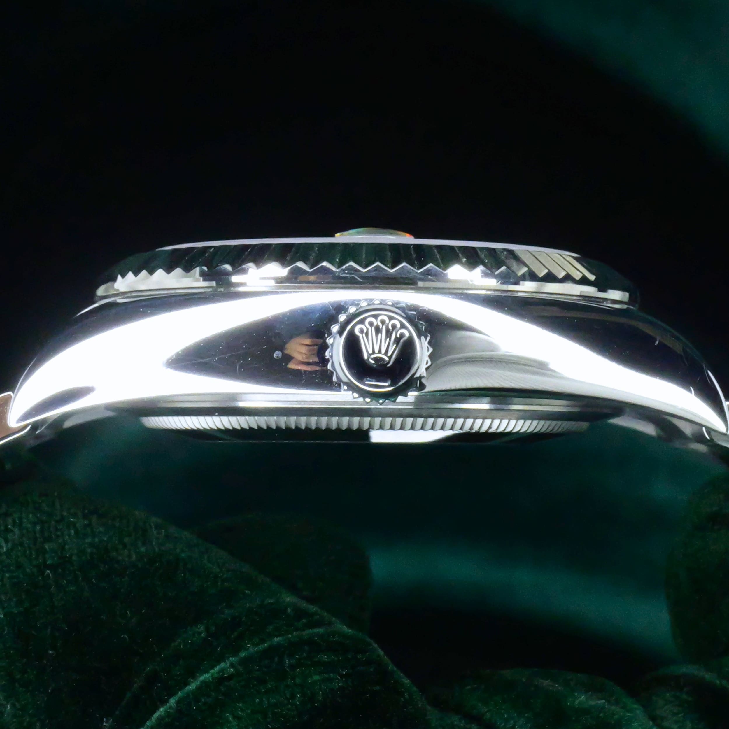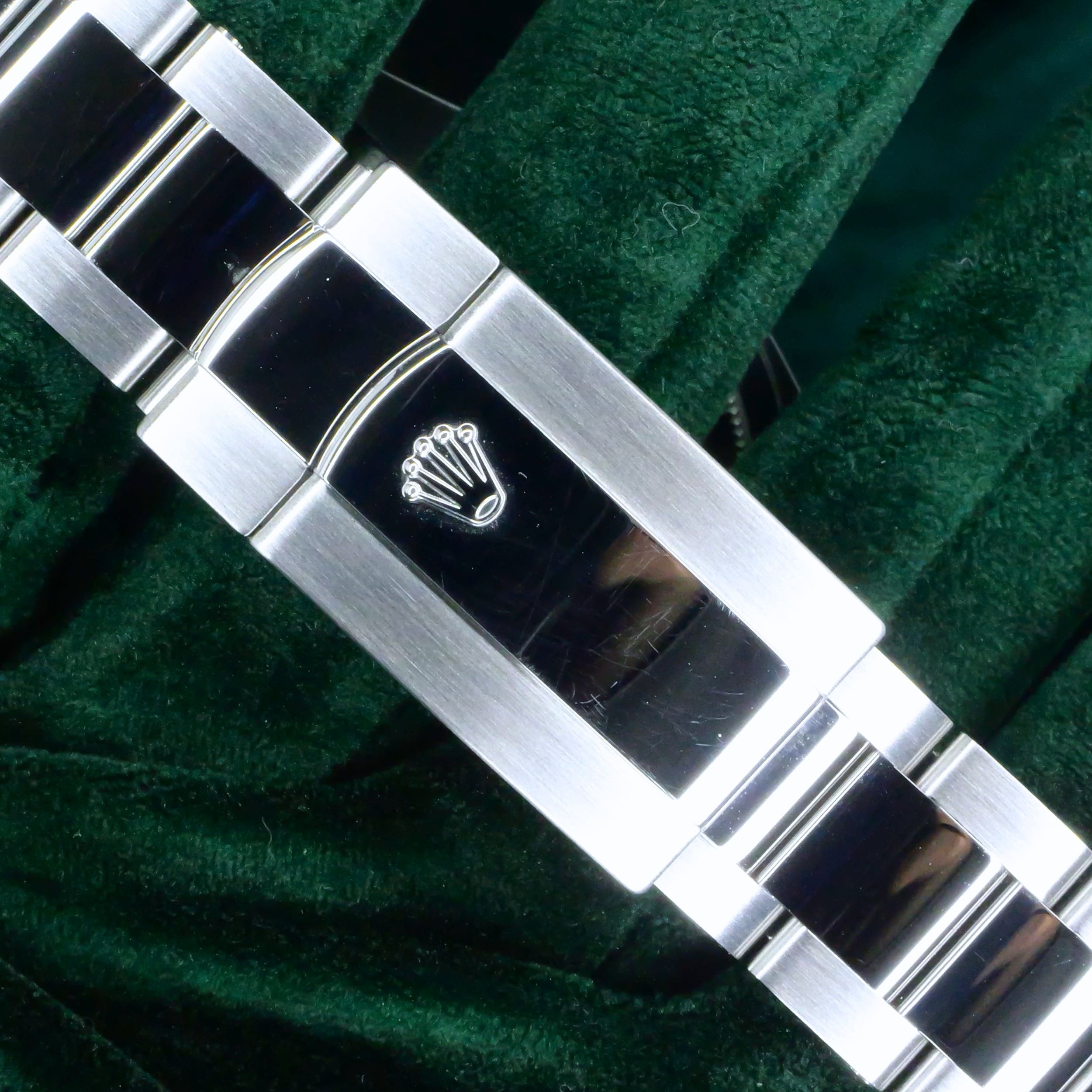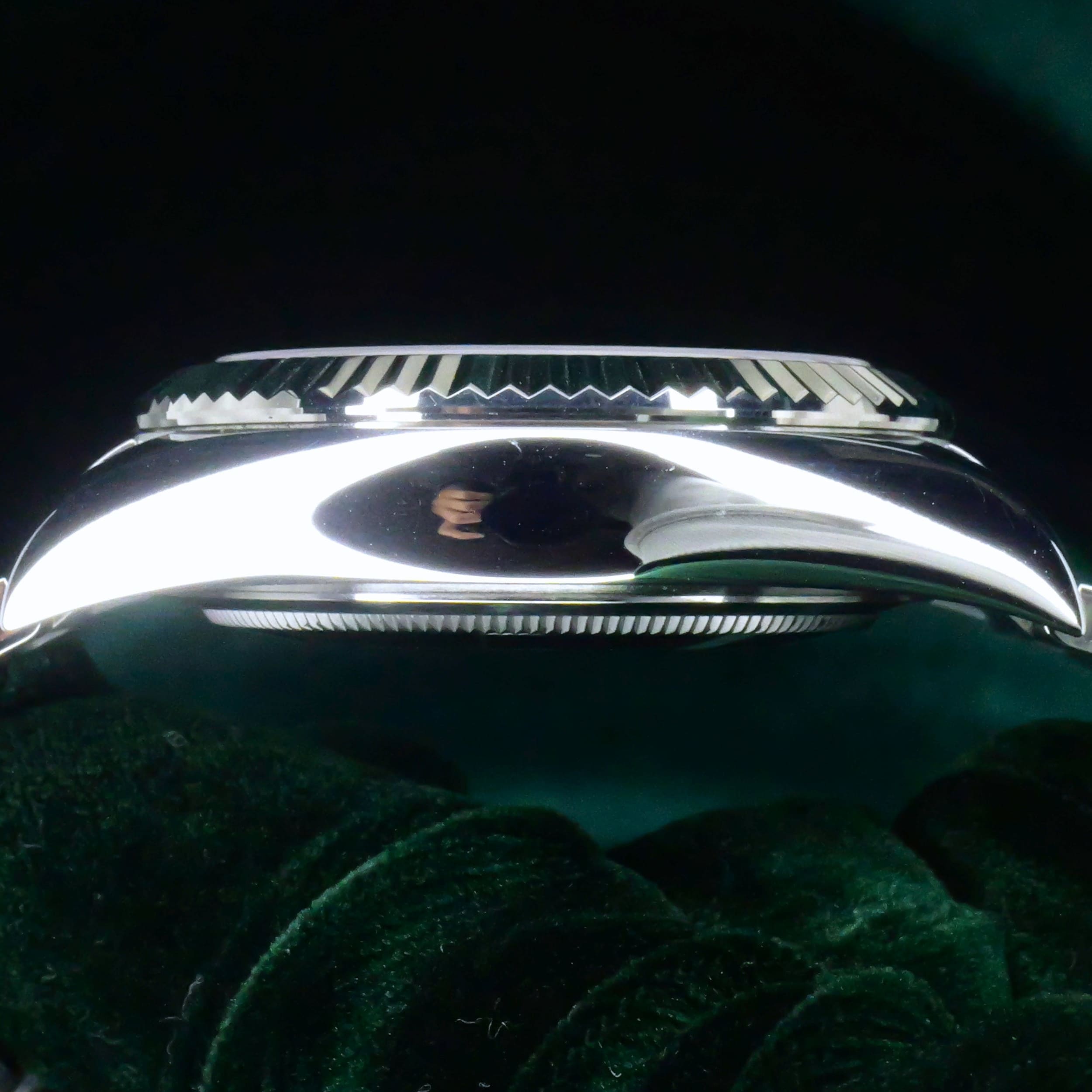 Presents itself in mint condition with little to no signs of wear. Blue dial gives the watch a rich, vivid look that stands out beautifully against the steel case. White gold fluted bezel catches the light with sharp, elegant detail and gives the watch one of its most recognizable features. Oyster bracelet adds a clean, sporty finish and flows smoothly into the case for a strong and refined look on the wrist.