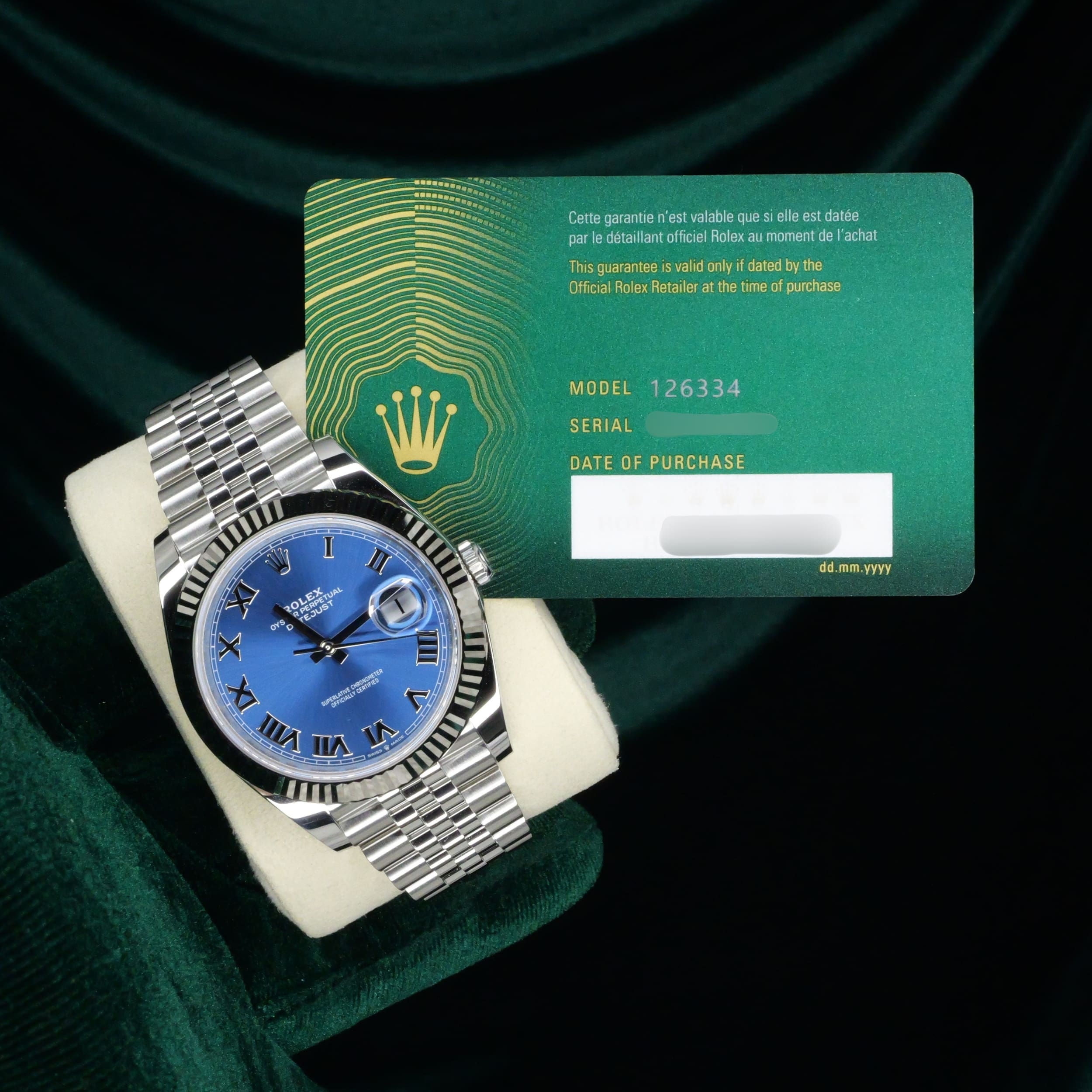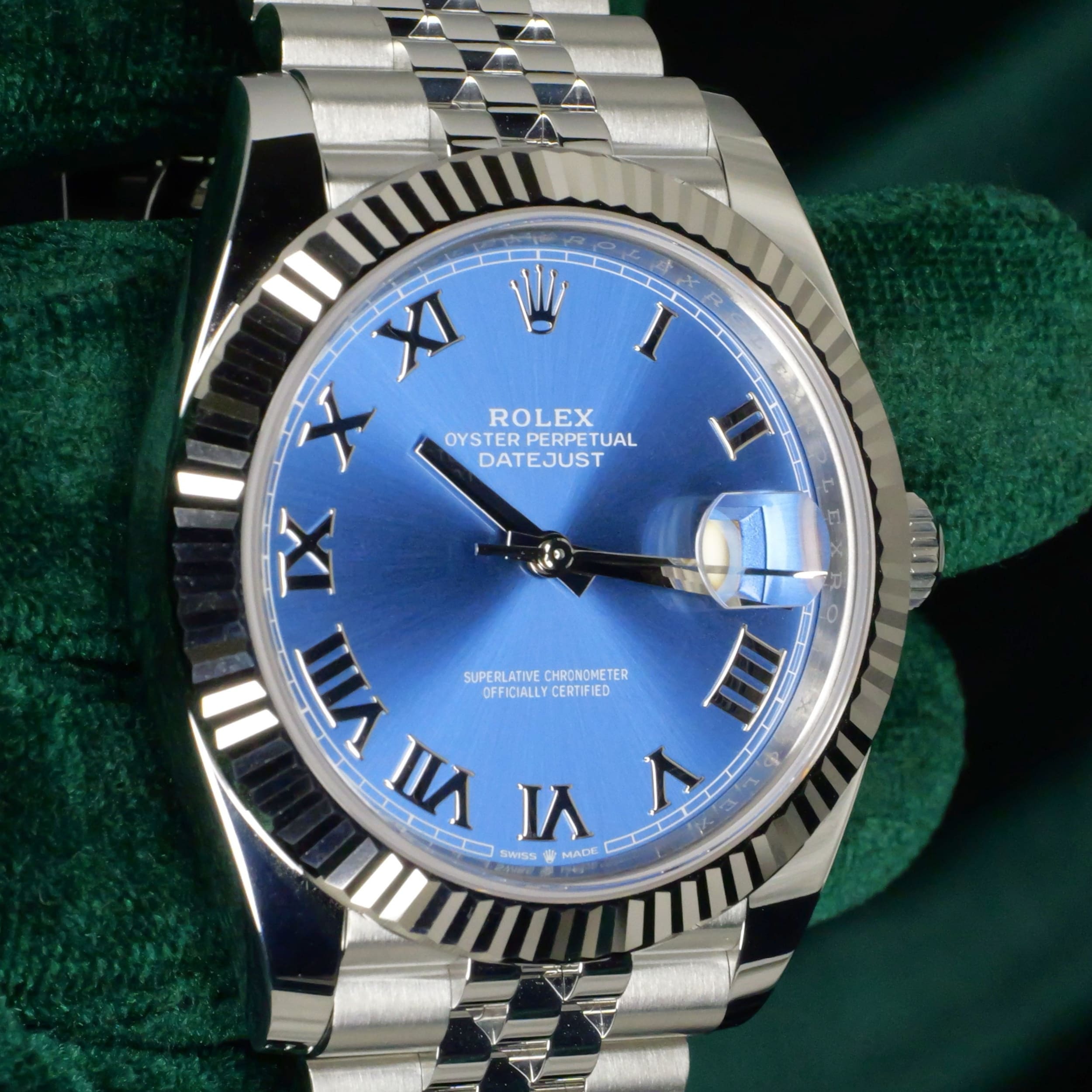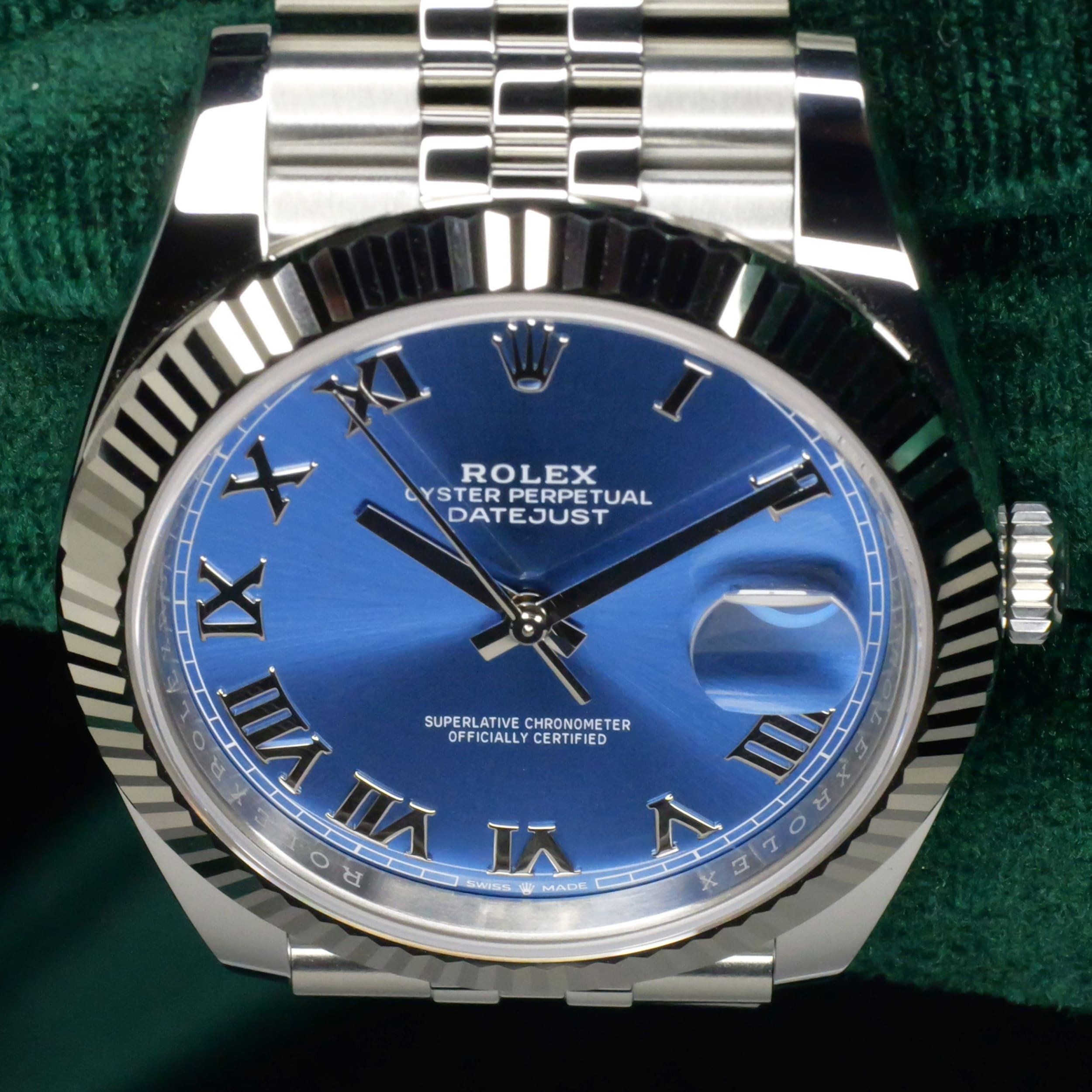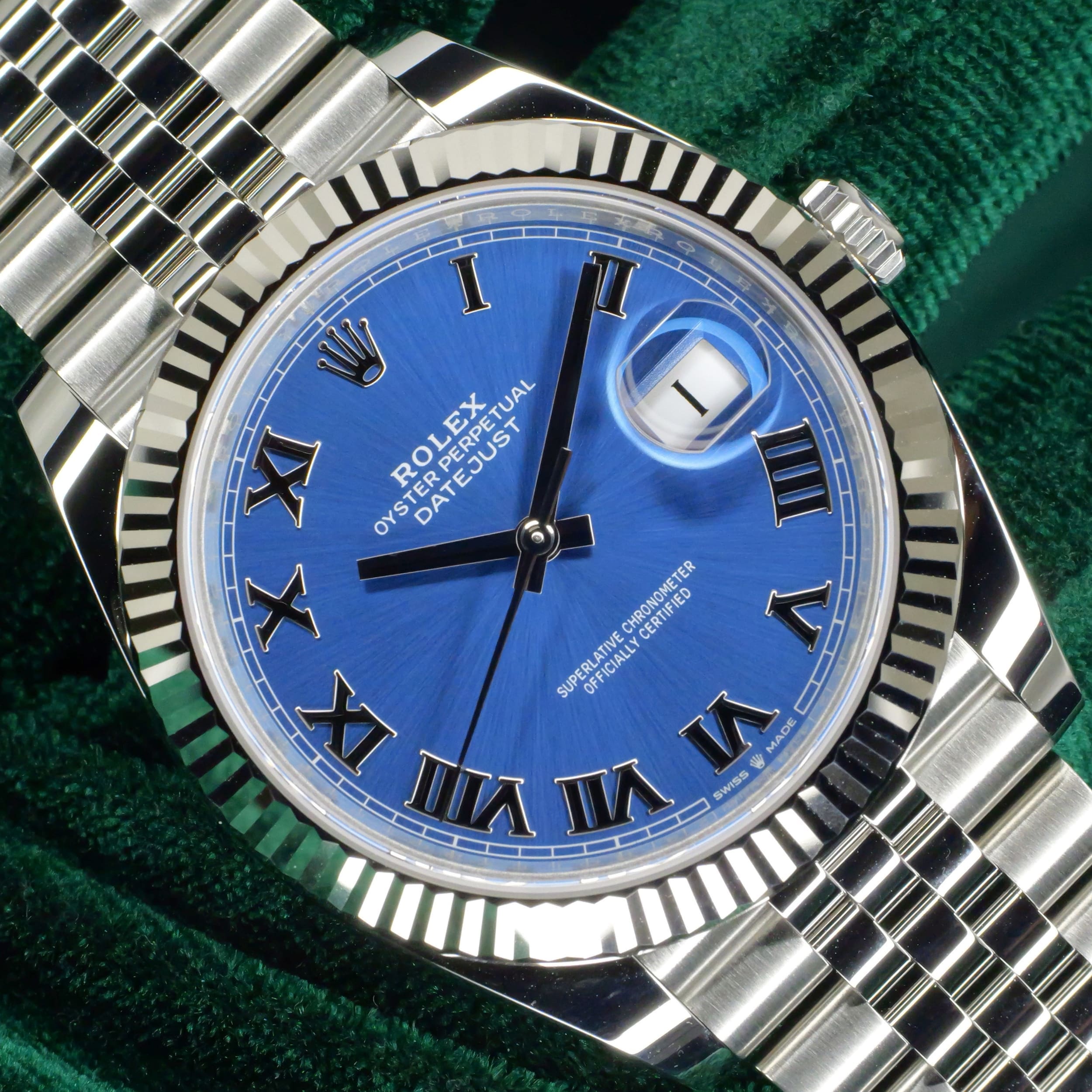 Presents itself in brand new condition with no signs of wear. With the brushed finish of the sunray dial, dynamic hues of the azzurro-blue can be seen with different types of light. White gold roman numerals at the hour markers distinctively sets itself from other dial variants. Two-tone elements of stainless steel and white gold used throughout the case and bracelet easily adapts this timepiece from everyday use to formal engagements.