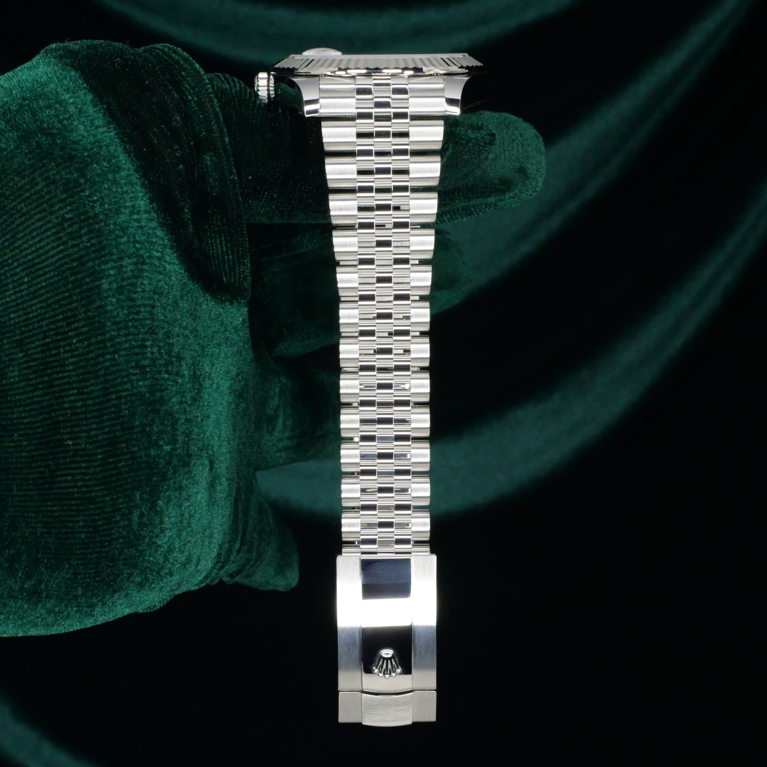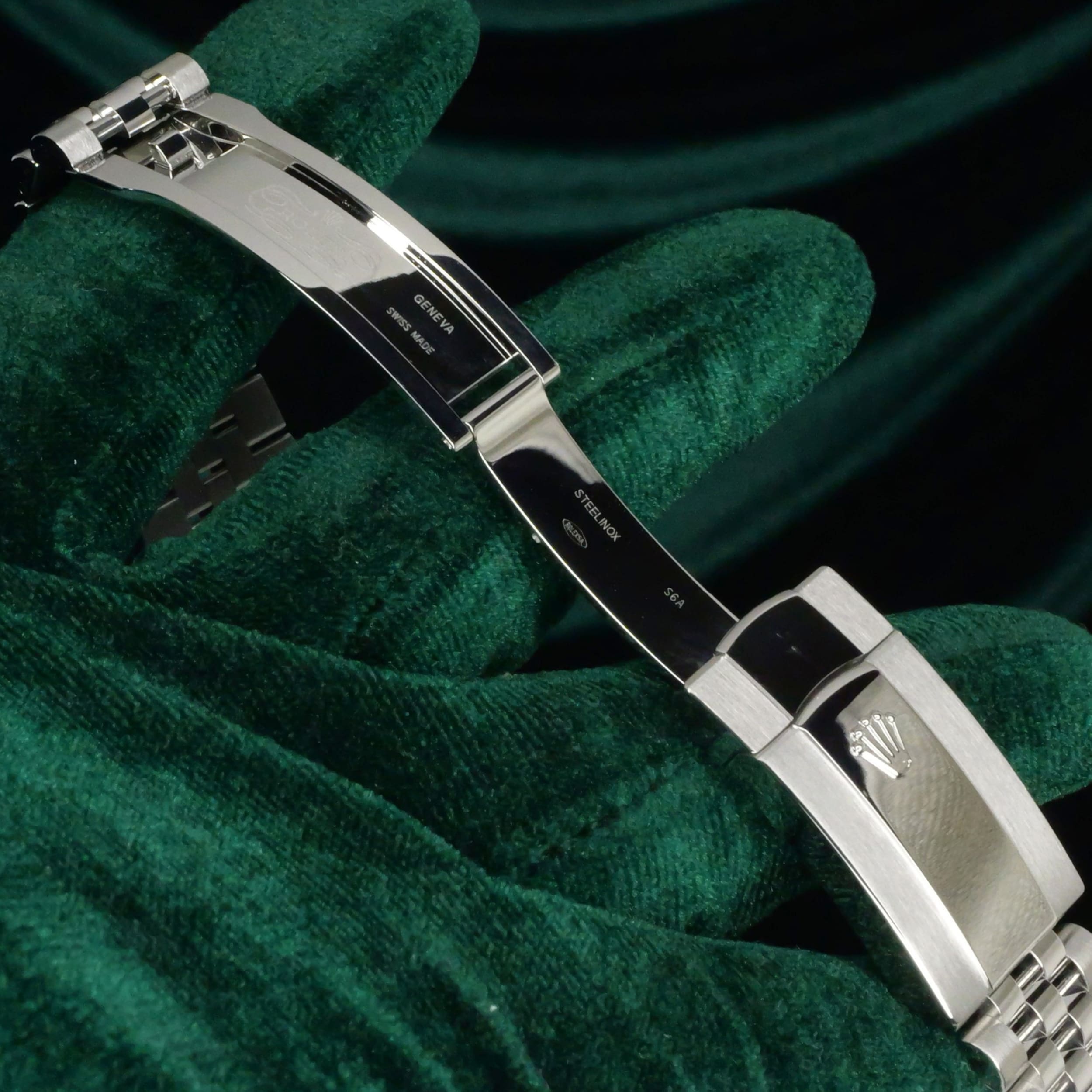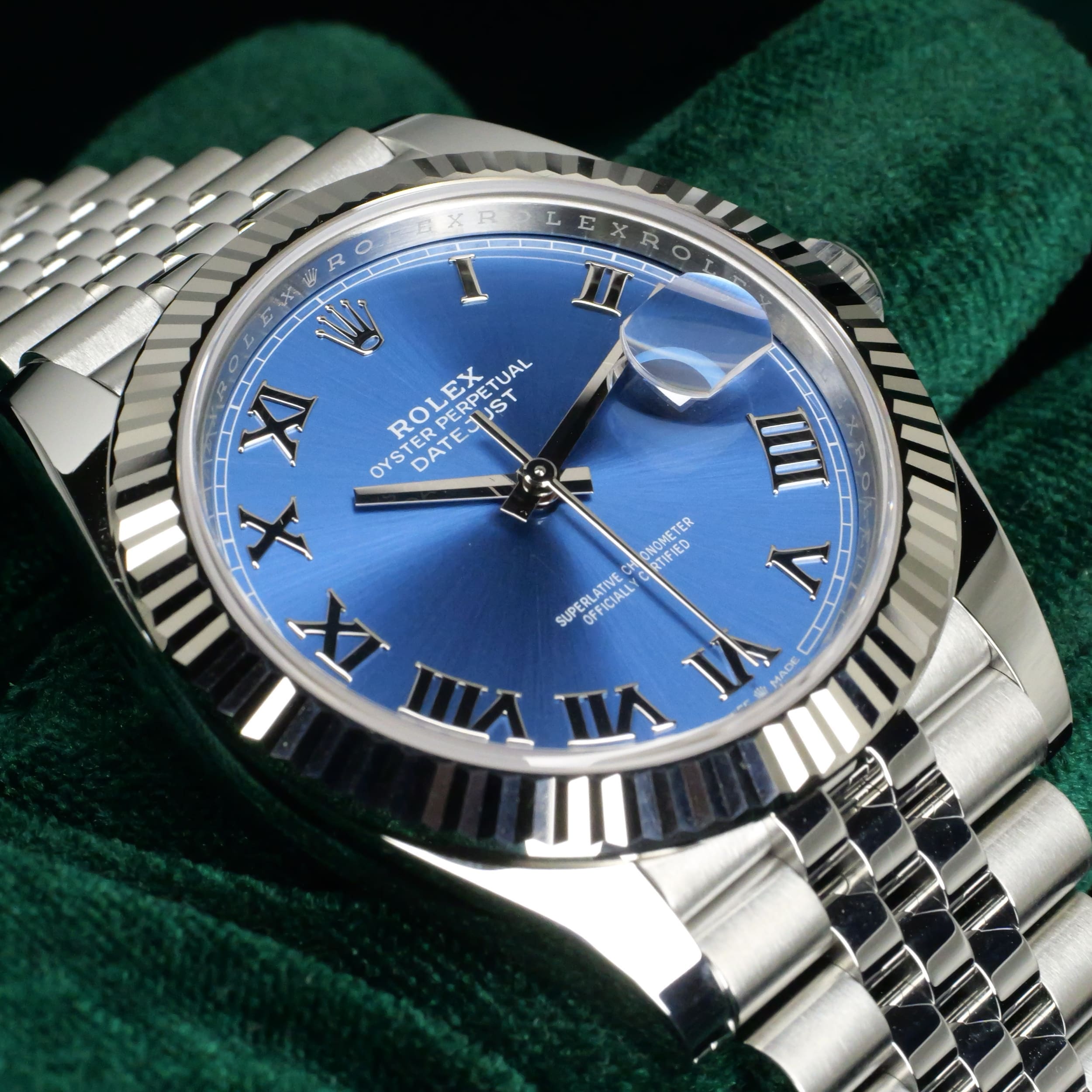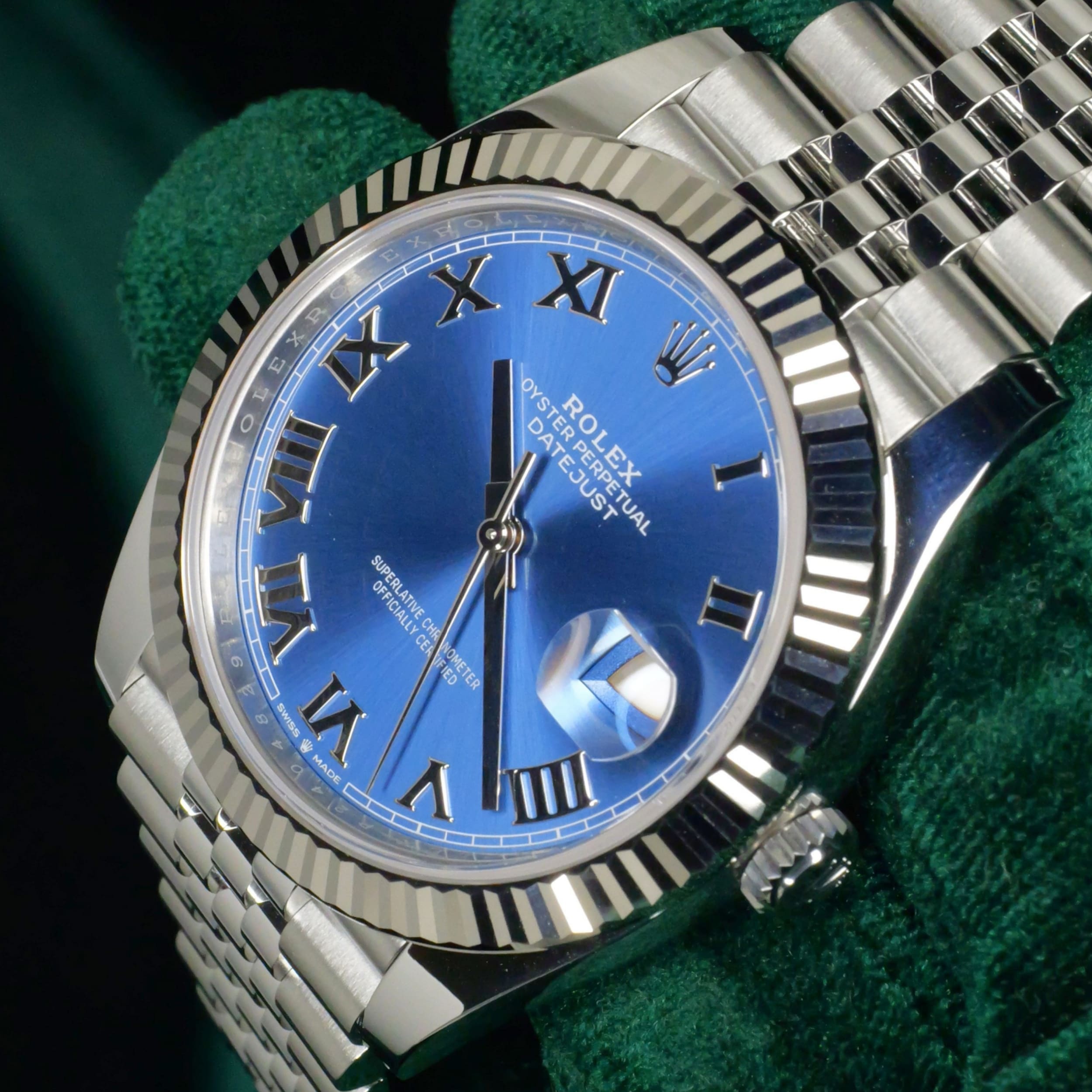 Dazzling to the eye, the white gold fluted bezel paired with the luster of the azzuro-blue dial can draw attention without being ostentatious. Paired with the two-tone white gold stainless steel Jubilee bracelet, this a combination that balances old-world Rolex elegance with modern proportions.