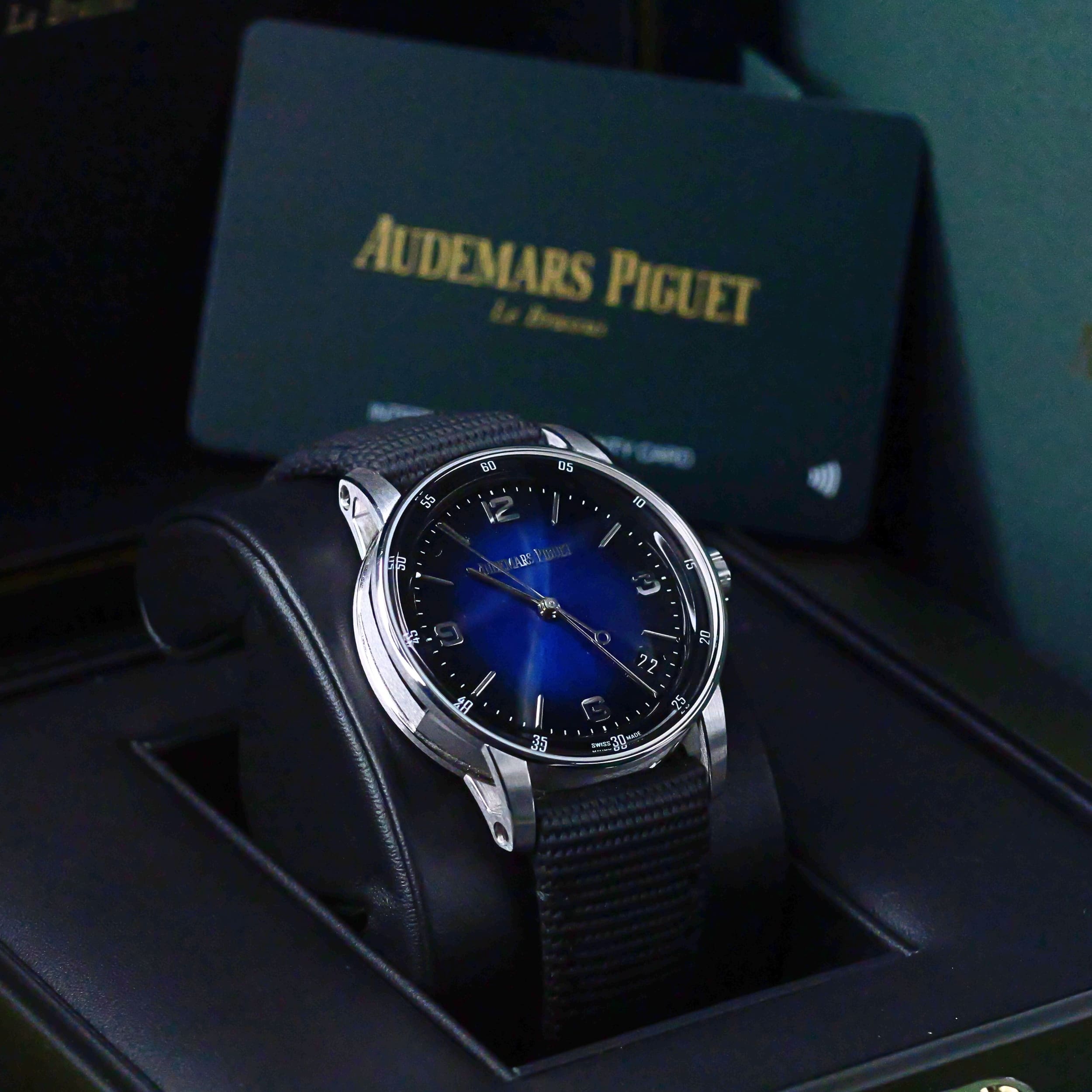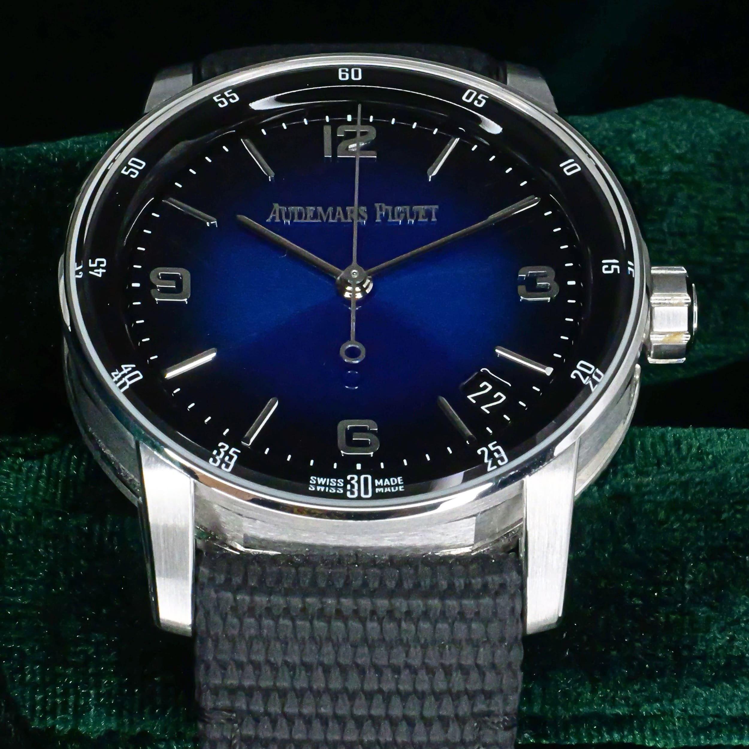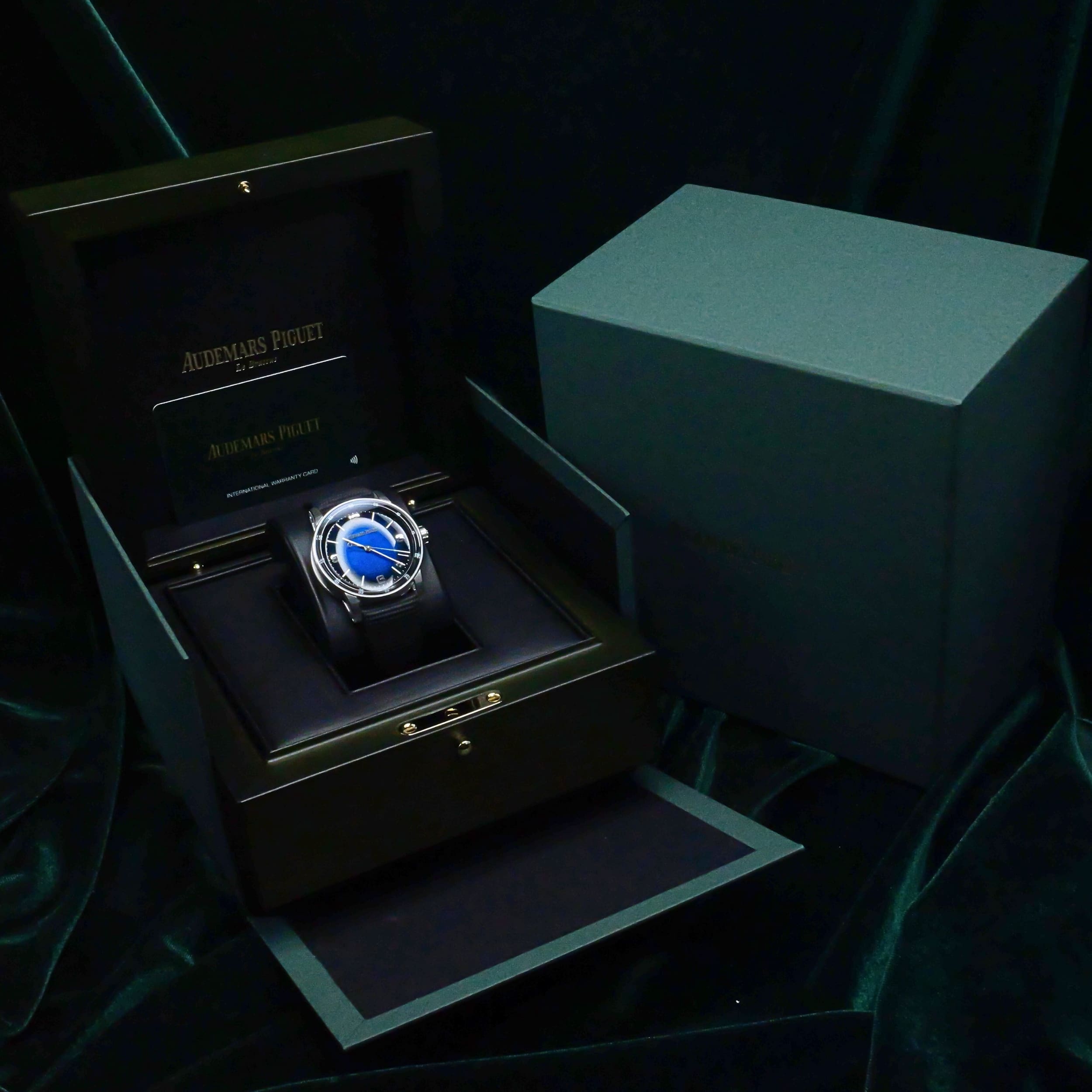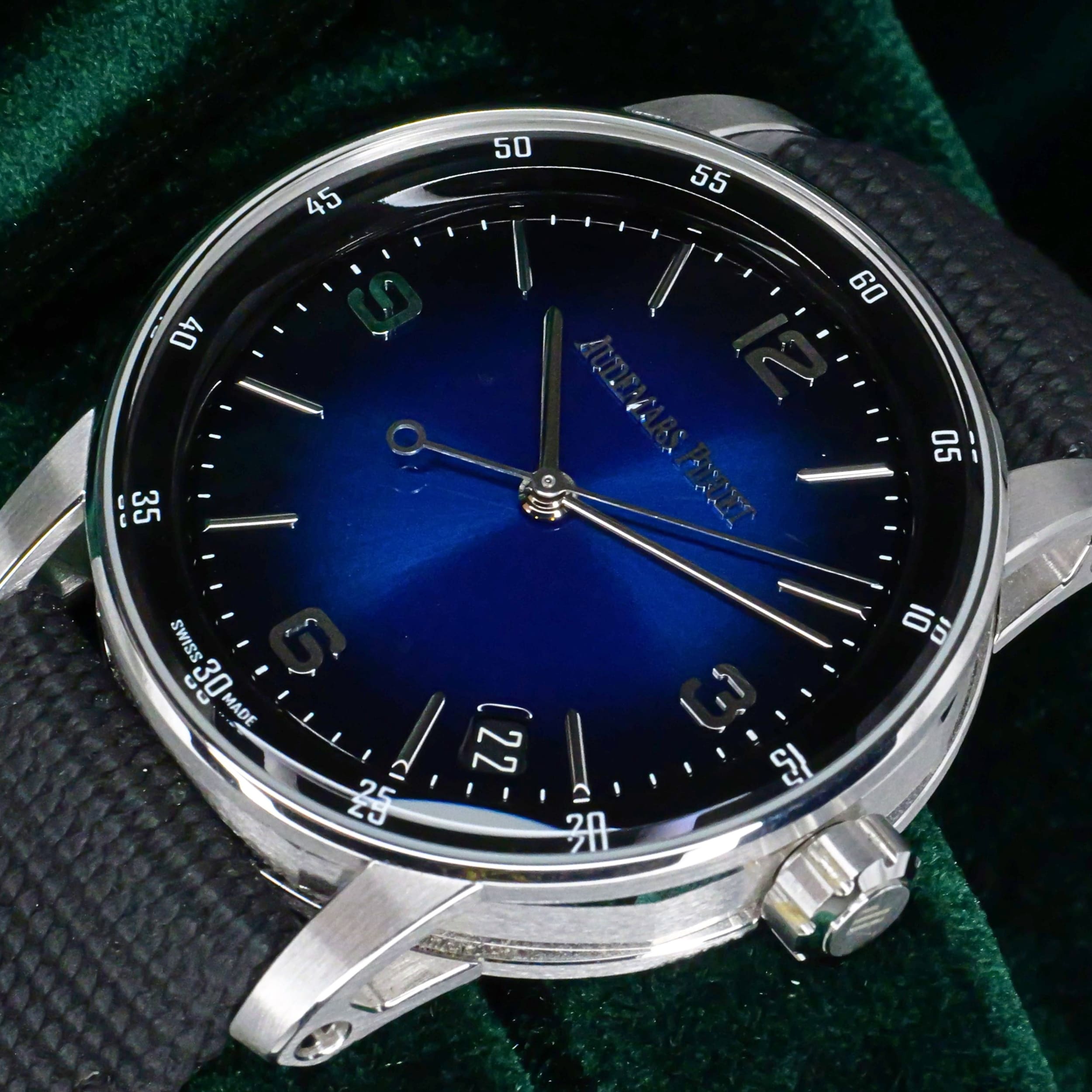 Presents itself in mint condition with little to no signs of wear. Showcasing a high-polished white gold bezel and brushed case that retain their crisp finishing. Featuring a smoked blue dial that is both vivid and captivating, it offers a striking contrast against the applied white-gold hands and hour markers. Its sapphire crystal front and exhibition caseback are pristine, revealing the precision of the in-house self-winding movement within.