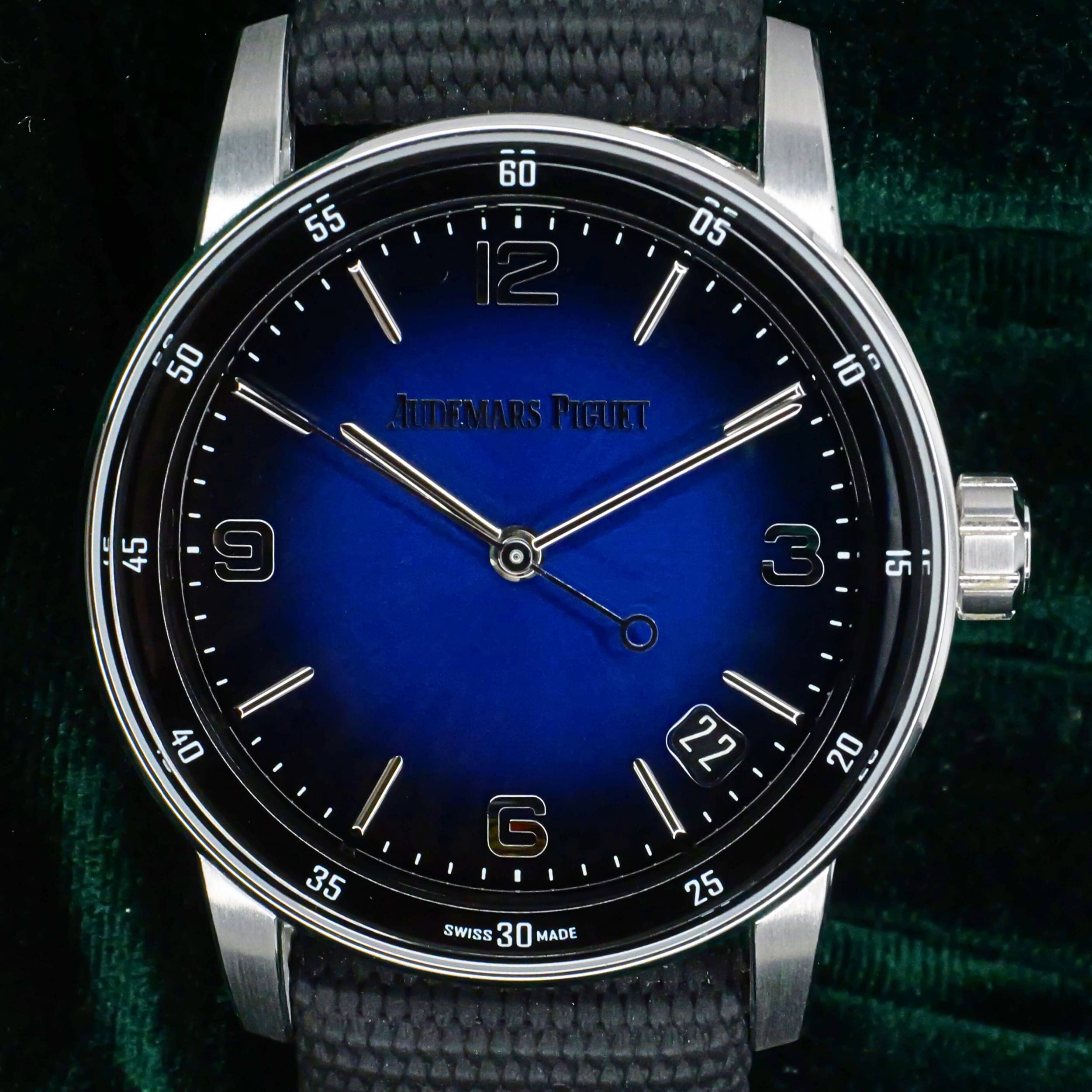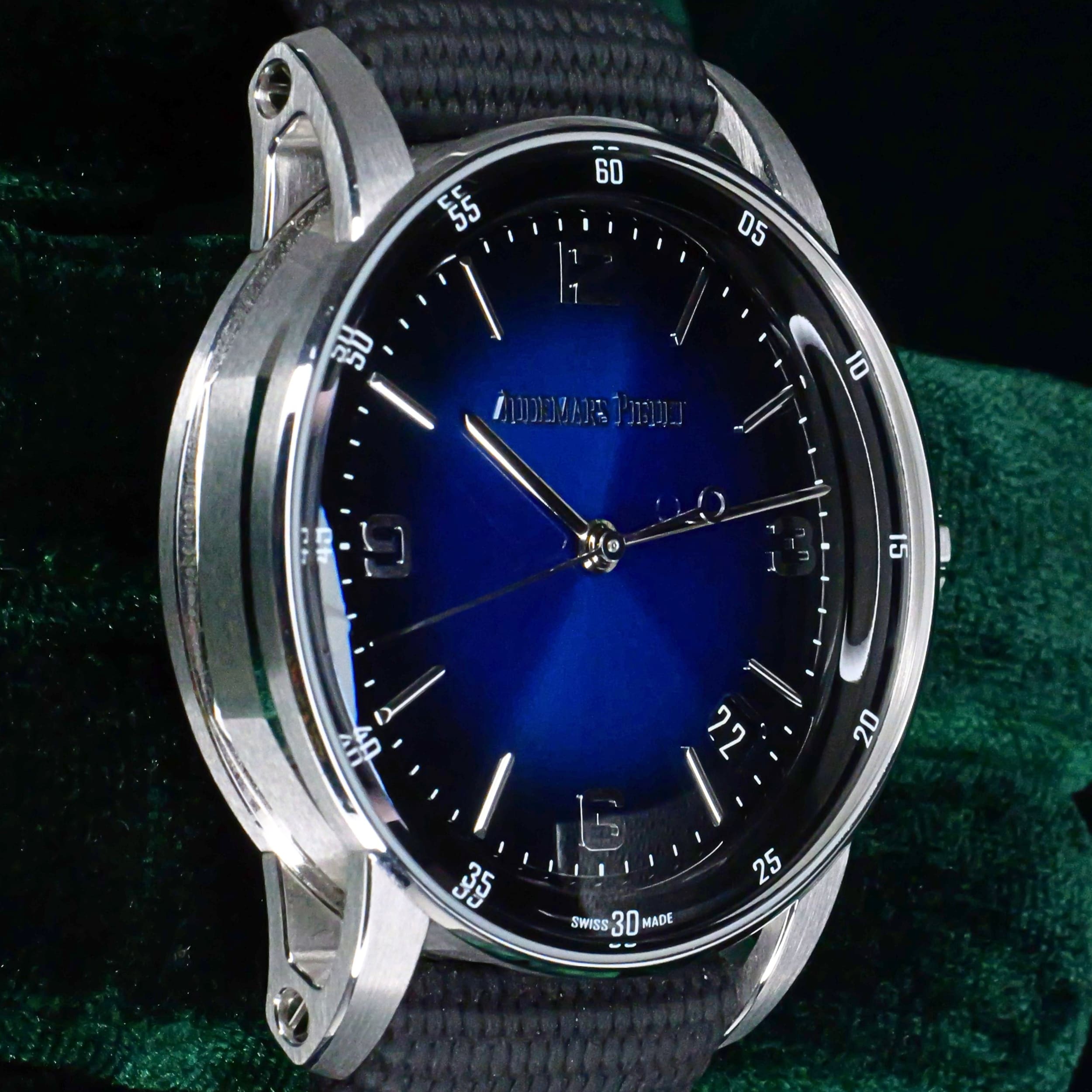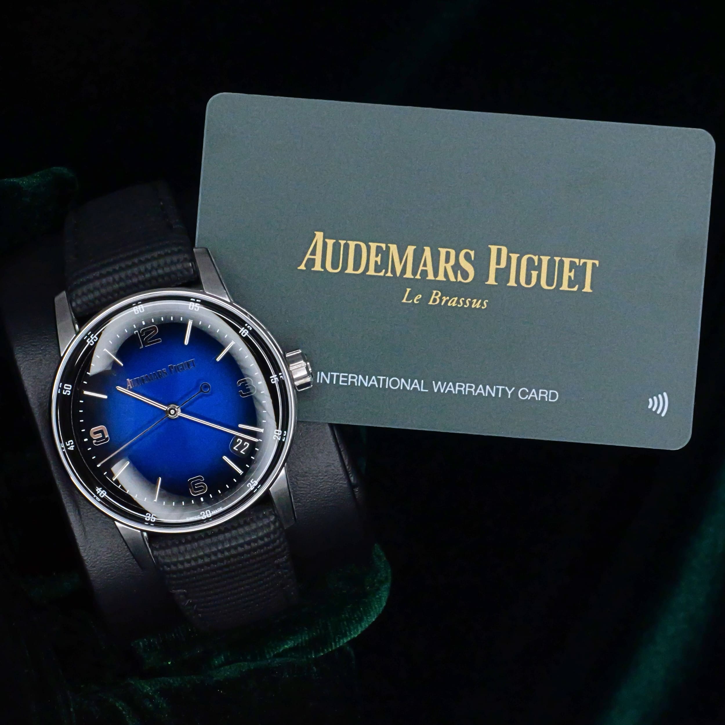 Presents itself in mint condition with little to no signs of wear. Showcasing a high-polished white gold bezel and brushed case that retain their crisp finishing. Featuring a smoked blue dial that is both vivid and captivating, it offers a striking contrast against the applied white-gold hands and hour markers. Its sapphire crystal front and exhibition caseback are pristine, revealing the precision of the in-house self-winding movement within.