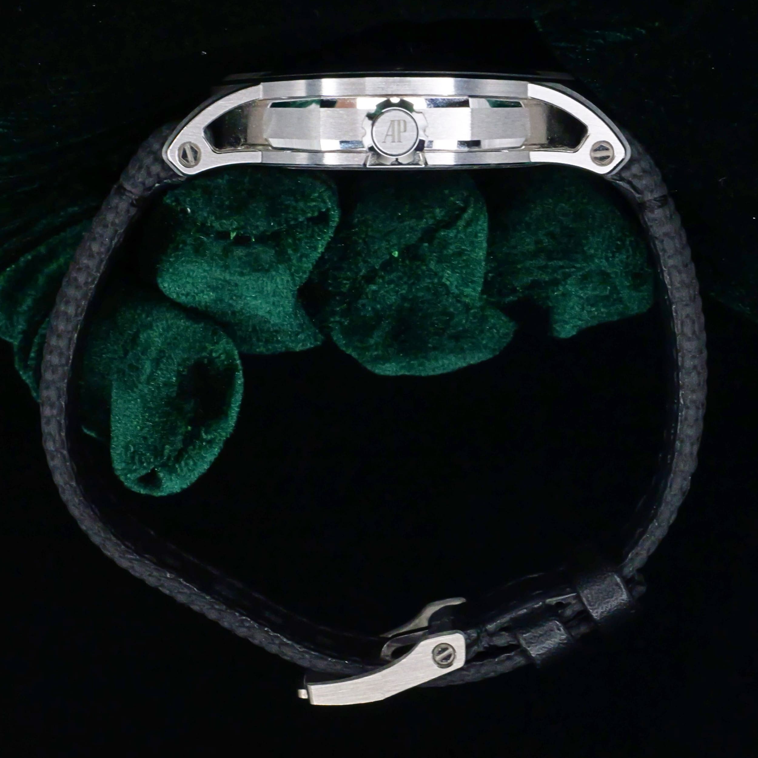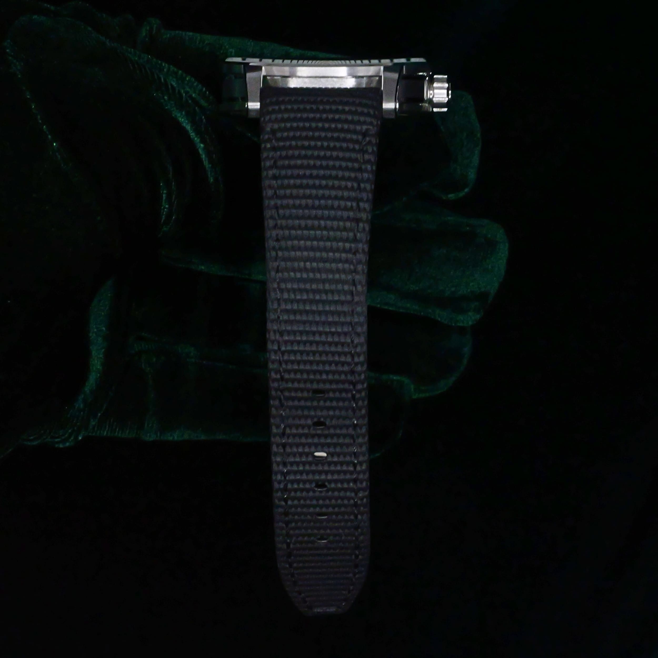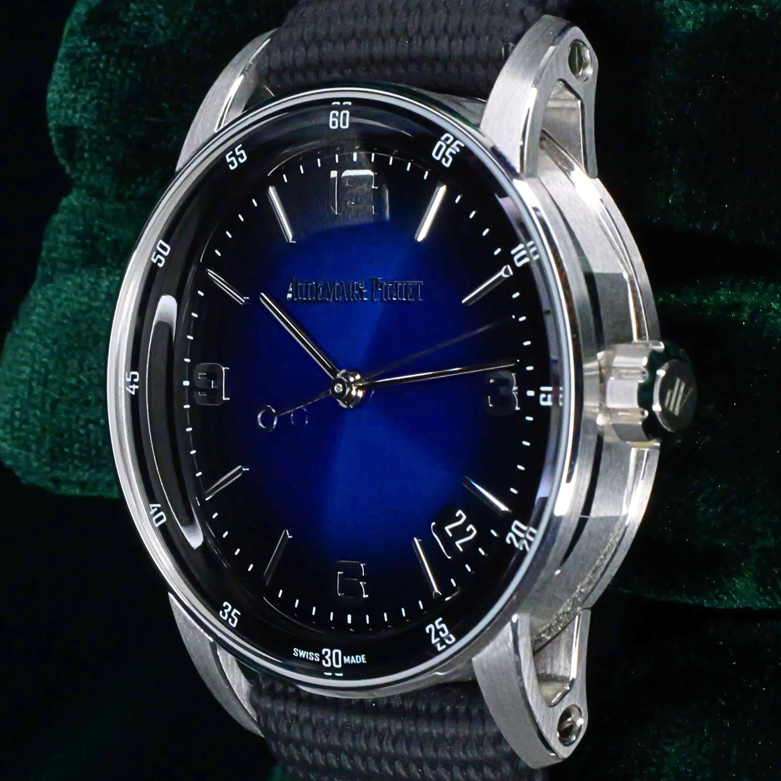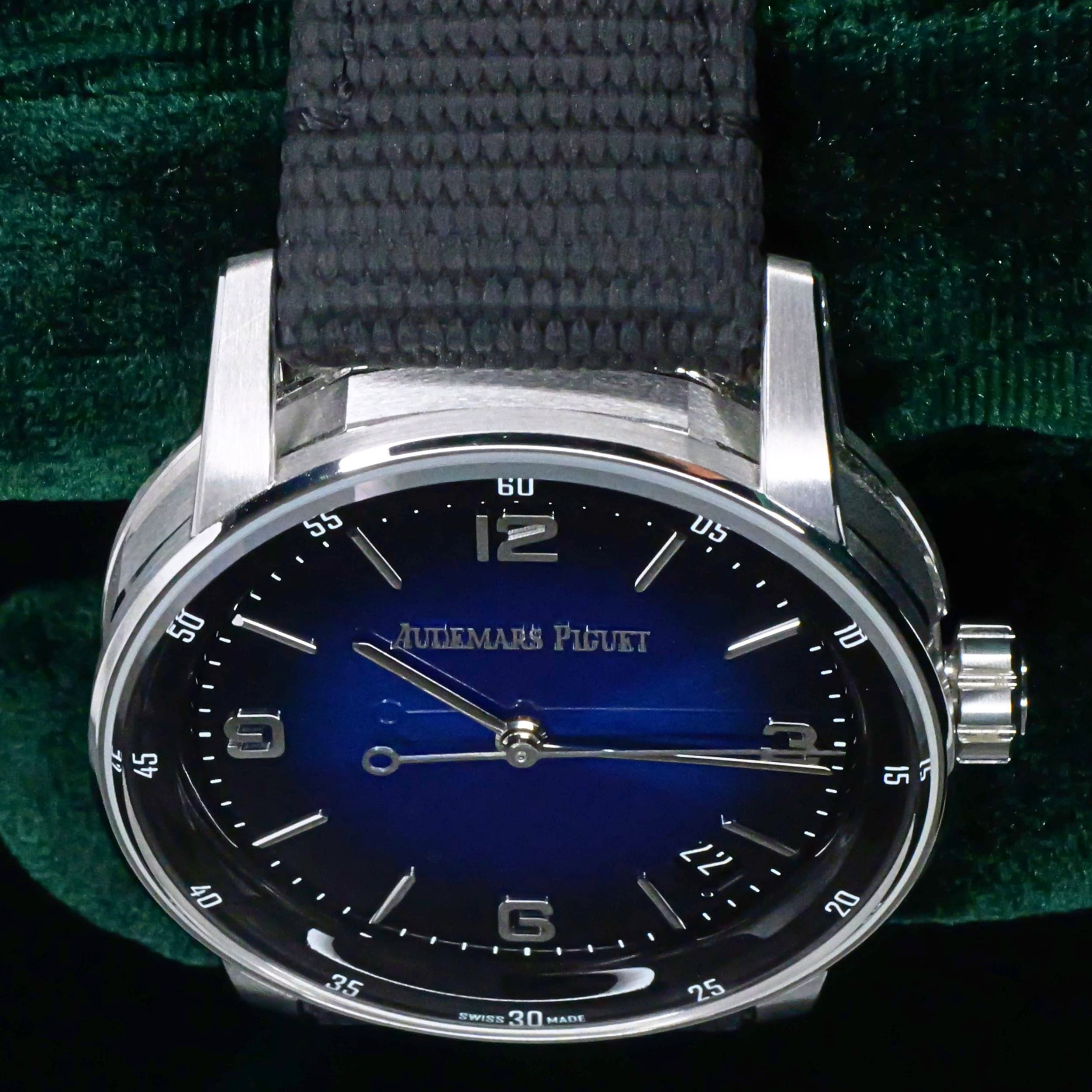 Presents itself in mint condition with little to no signs of wear. Showcasing a high-polished white gold bezel and brushed case that retain their crisp finishing. Featuring a smoked blue dial that is both vivid and captivating, it offers a striking contrast against the applied white-gold hands and hour markers. Its sapphire crystal front and exhibition caseback are pristine, revealing the precision of the in-house self-winding movement within.