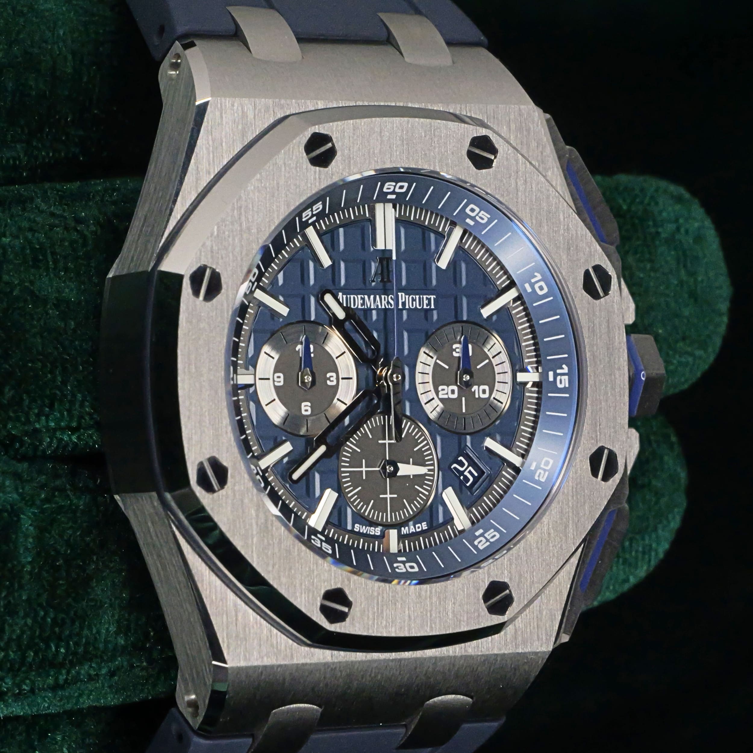 Lightweight titanium meets Offshore muscle in this blue-dialed 42 mm chronograph. Part of a thinner, more wearable Offshore refresh, it pairs the line’s iconic “Méga Tapisserie” texture with a vivid blue tone and matching rubber strap. For collectors who want classic Offshore presence without the weight of steel, this titanium edition hits a perfect sweet spot of sport and comfort.