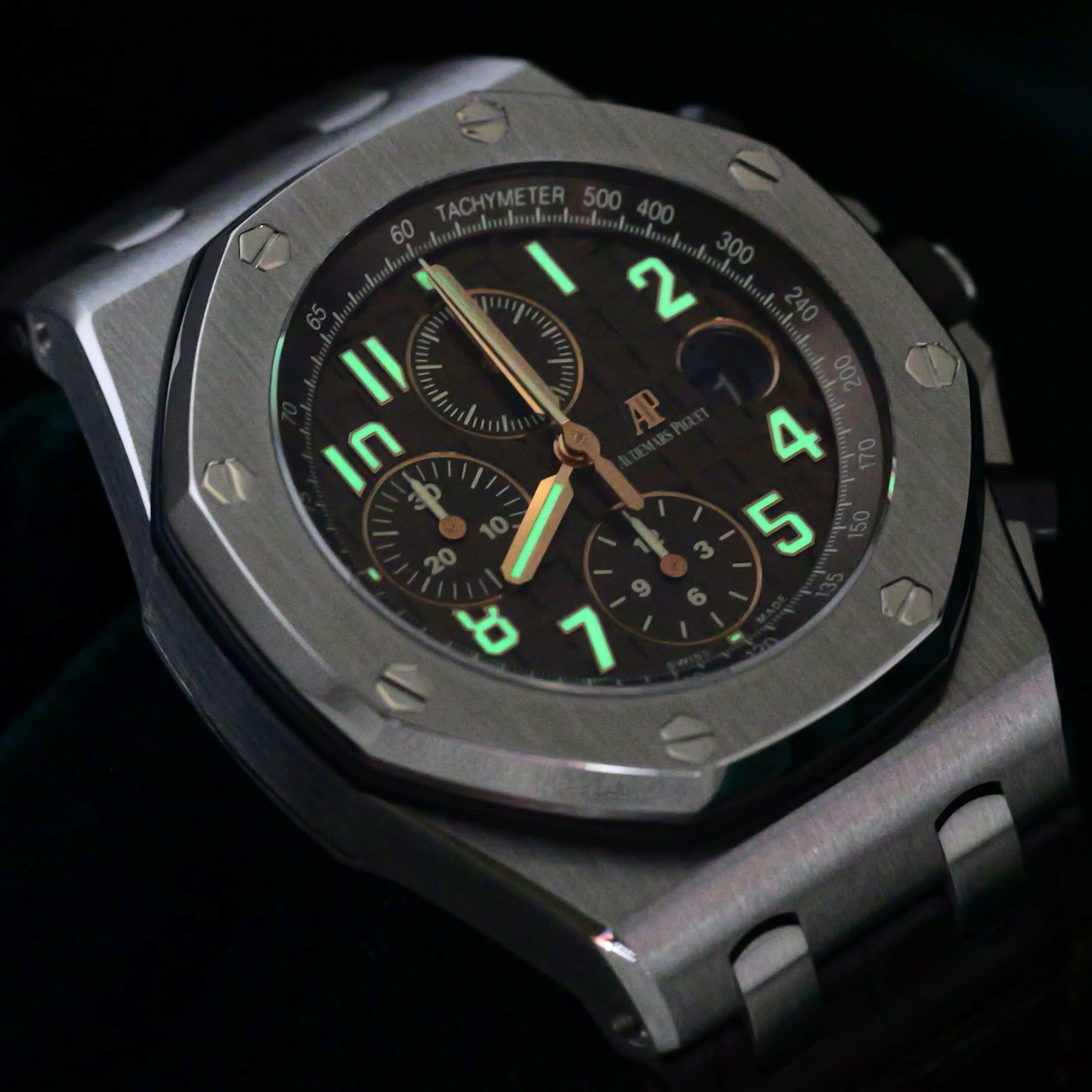 Functions include hours, minutes, seconds, date, and chronograph. The screw-down crown on the right side of the watch quick sets the minute hand and the date wheel. The top right pusher starts/stops the chronograph function while the bottom right pusher resets the chronograph function. Green luminous markers and hands glow in low light conditions, allowing the time to remain clearly visible even in the dark.