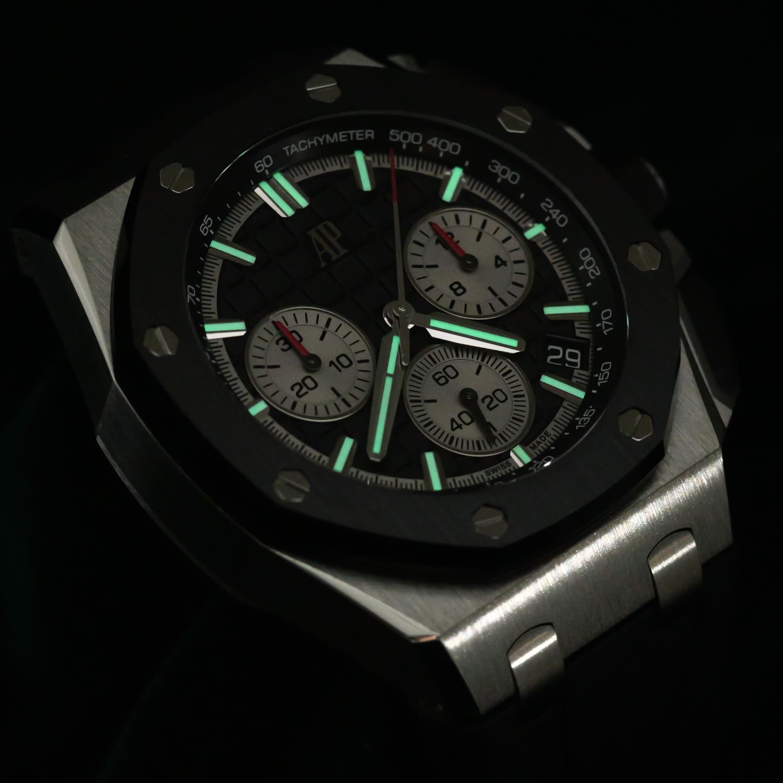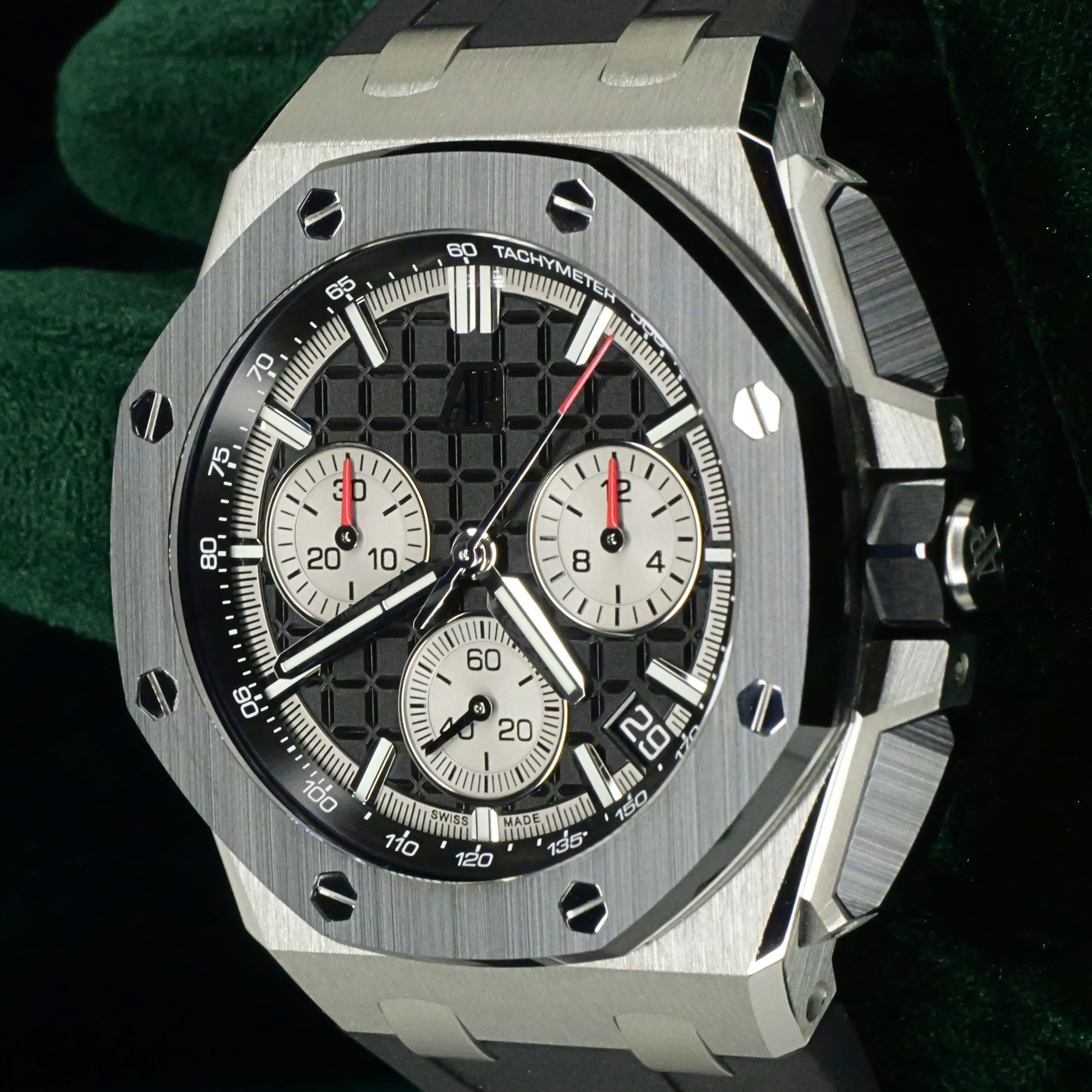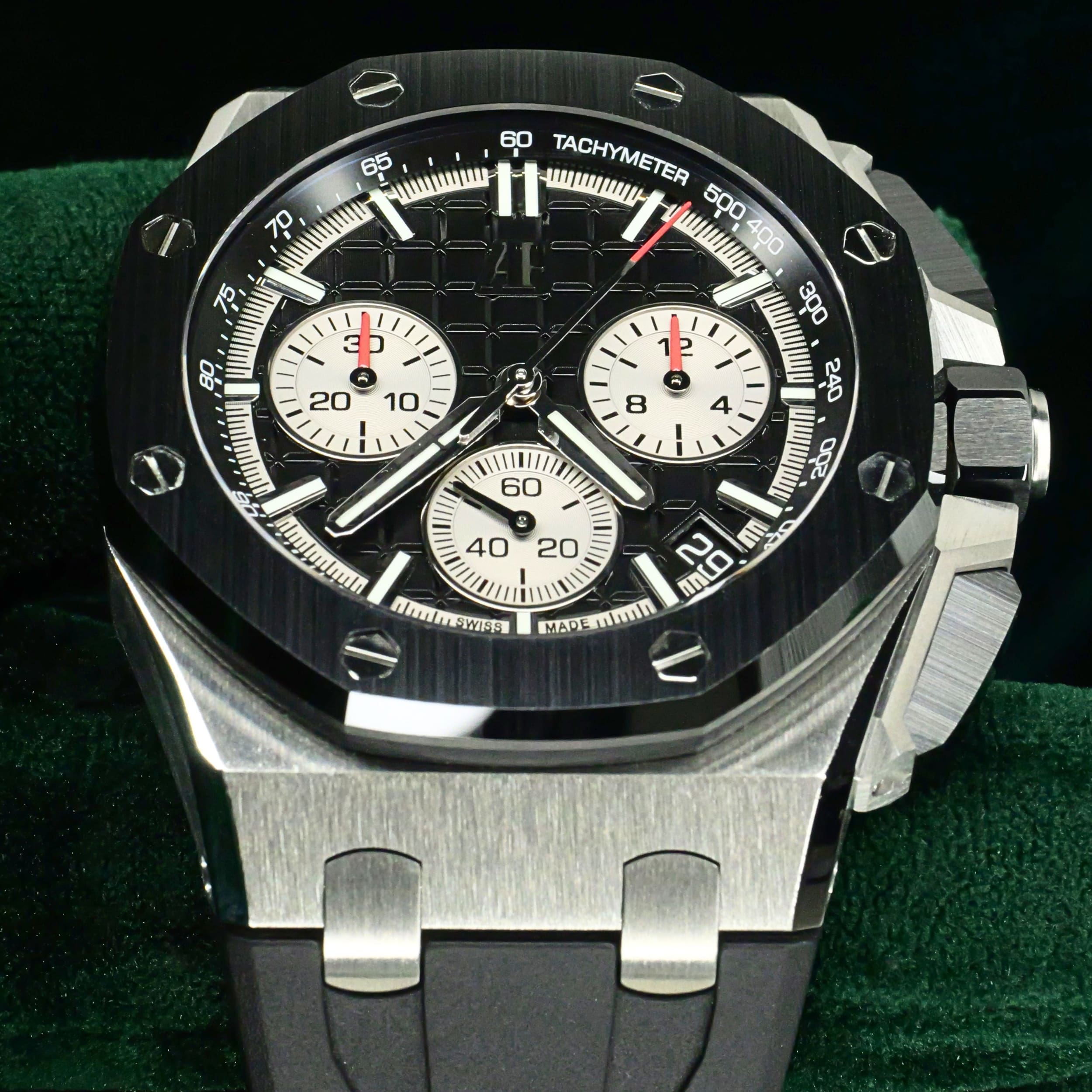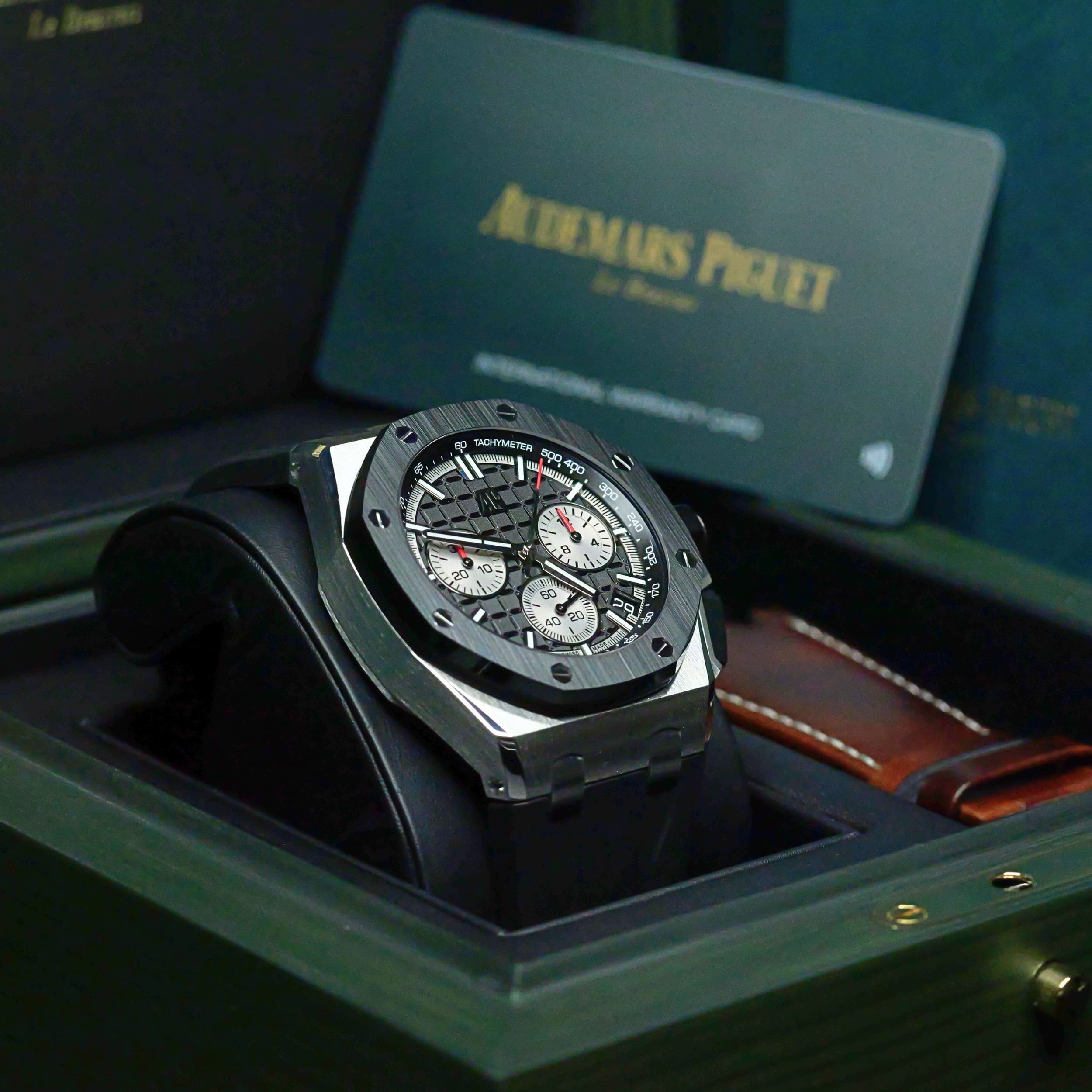 Combining the resilience of the ceramic black bezel and a stainless steel case, the Audemars Piguet Royal Oak Offshore Chronograph commands a presence wherever you go. With sharp angles paired to contrasting finishes, this is an all-around bold timepiece that can be used in various settings throughout the week.