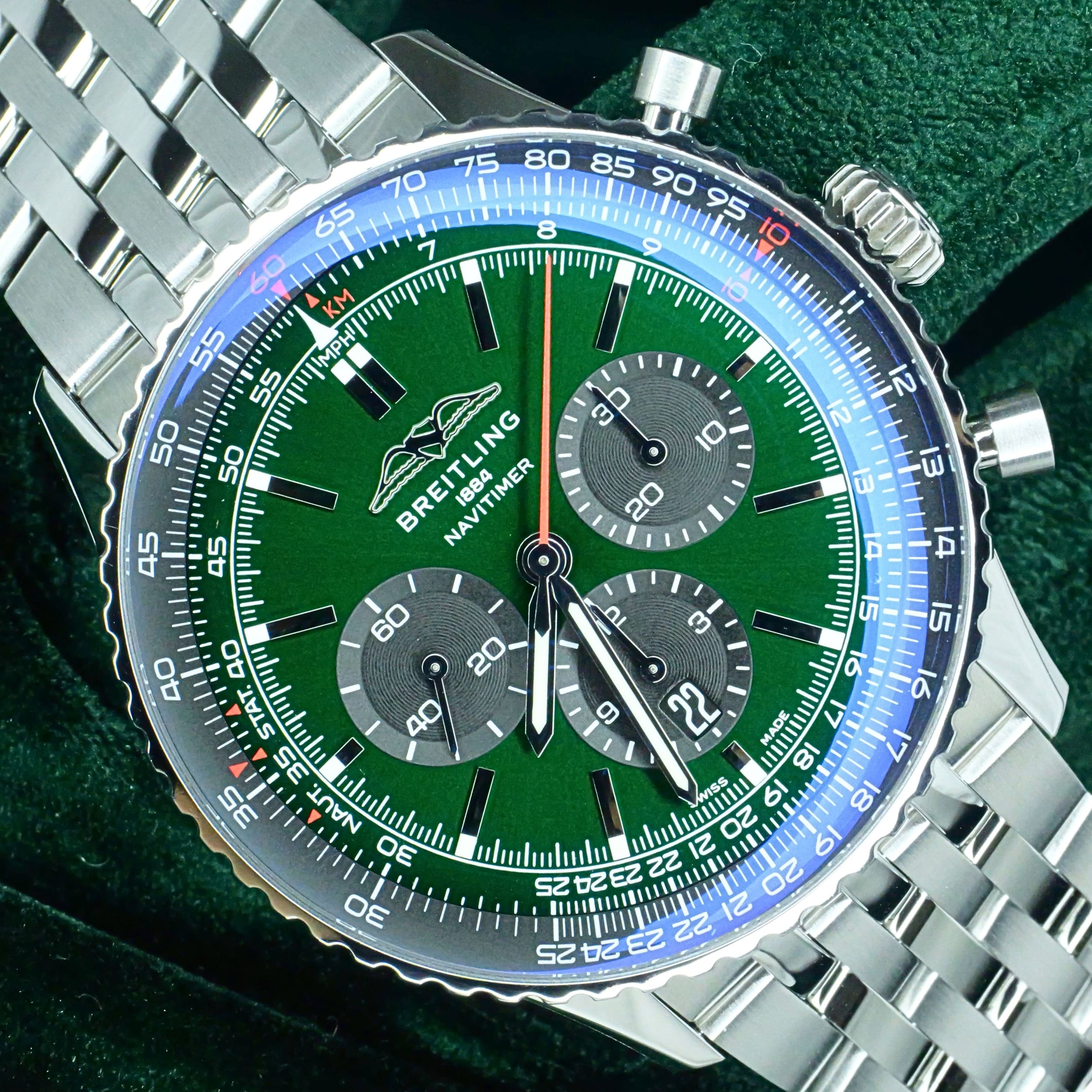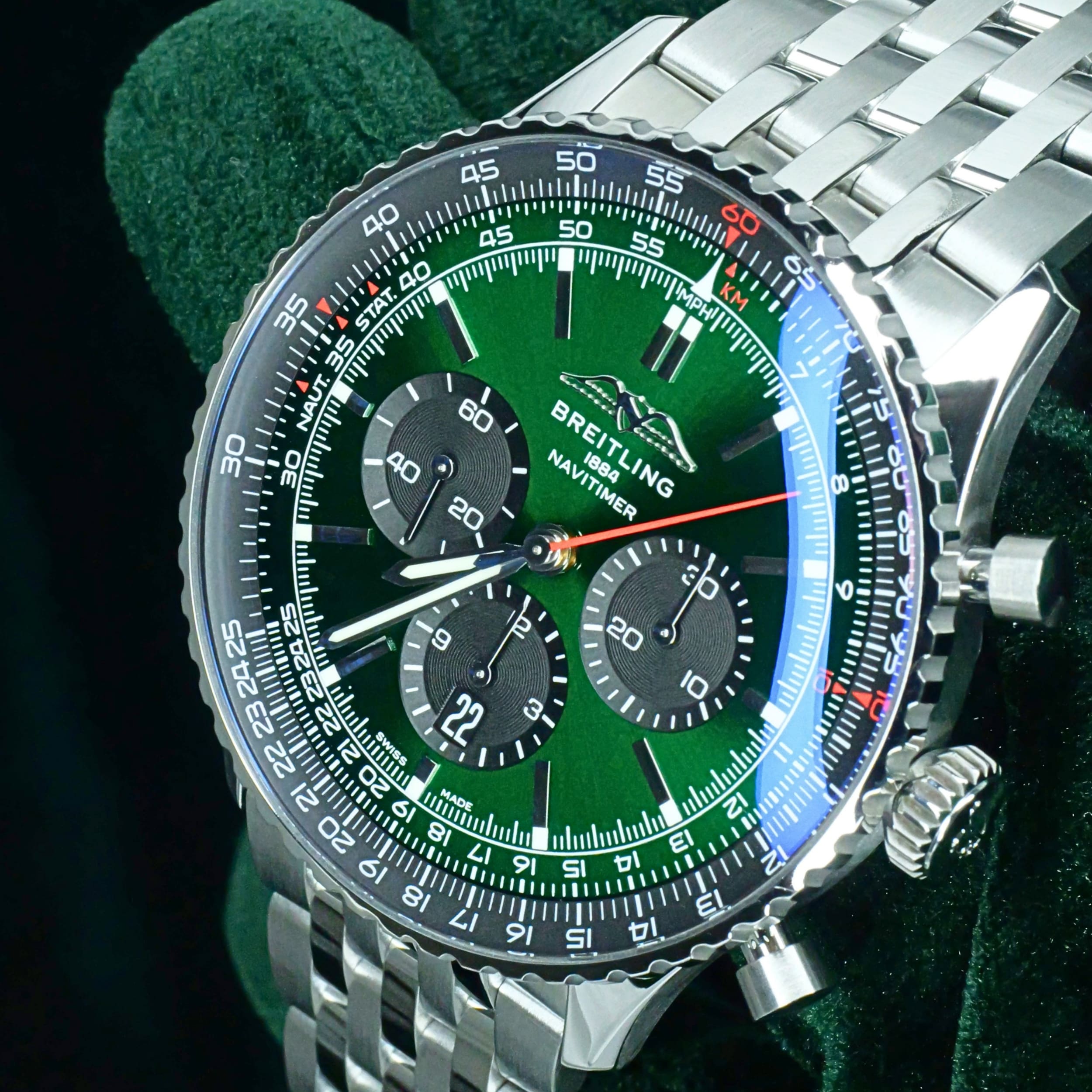 Boasting bold design and exceptional craftsmanship, this Navitimer is a true testament to style and precision. Whether worn daily or on special occasions, its unique green dial ensures it stands out with sophistication and performance.