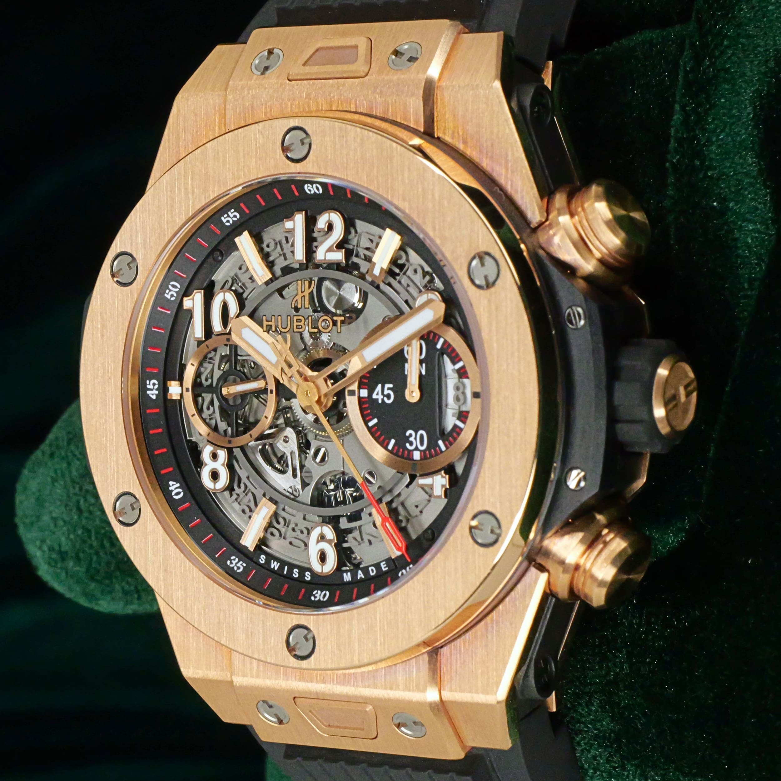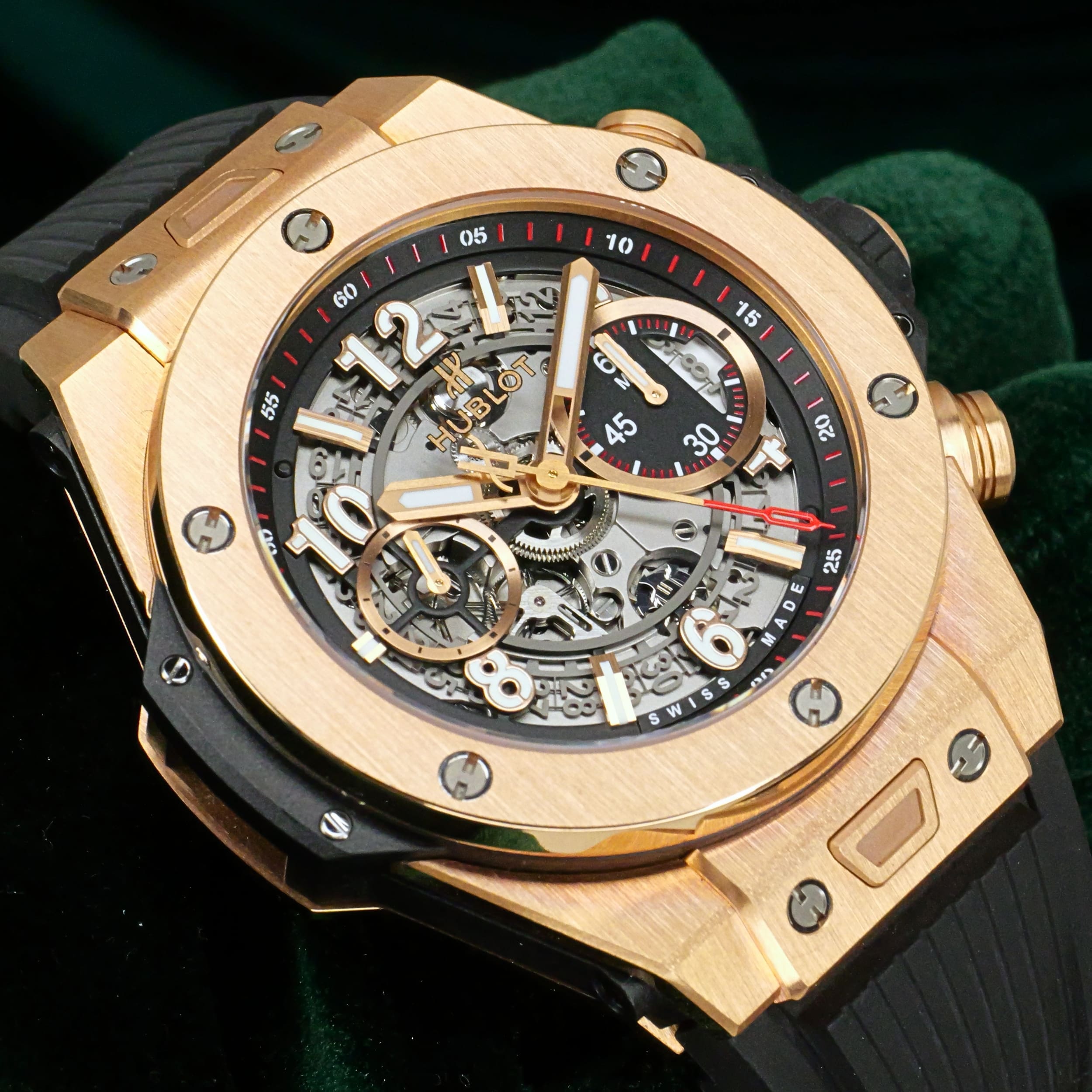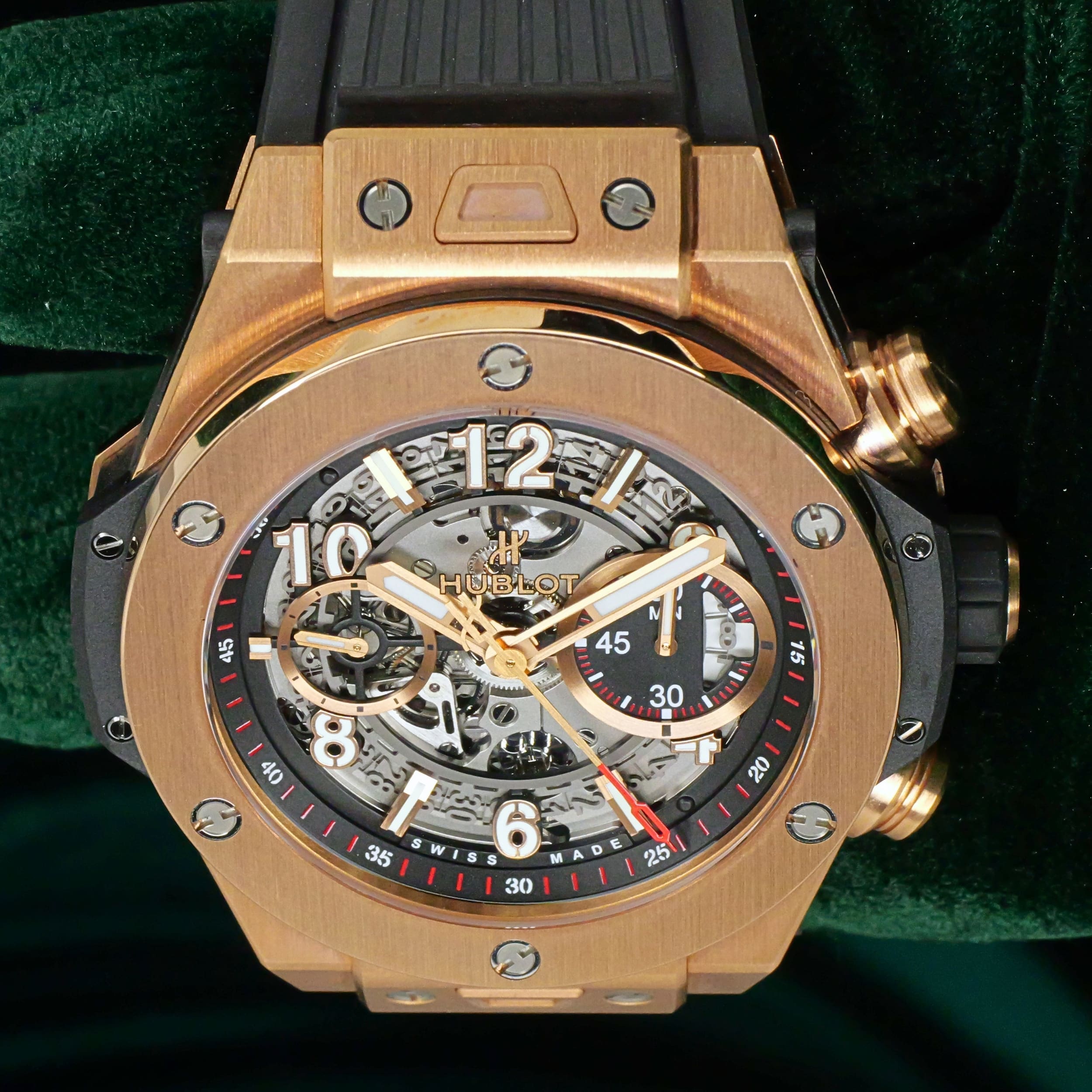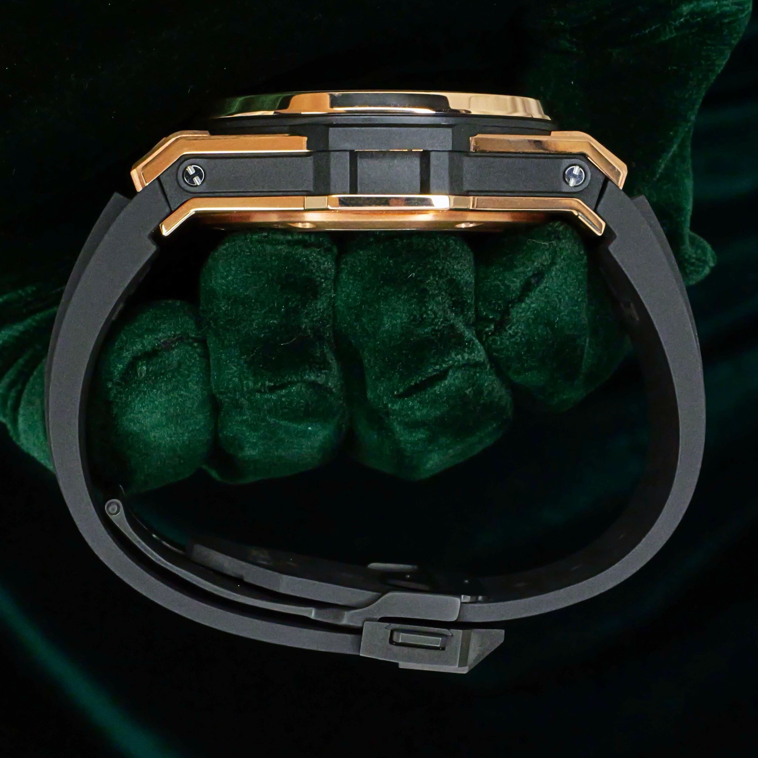 Presents itself in mint condition with little to no signs of wear. Showcasing its openworked dial, the timepiece reveals the in-house Unico movement, where layered components and visible chronograph architecture create a striking visual centerpiece. Featuring an 18K King Gold case, the design introduces warmth and weight, while the black ceramic bezel, secured with exposed screws, reinforces its industrial aesthetic. Completing the composition, the black rubber strap ensures a secure and comfortable fit, balancing the watch’s bold 45mm presence.