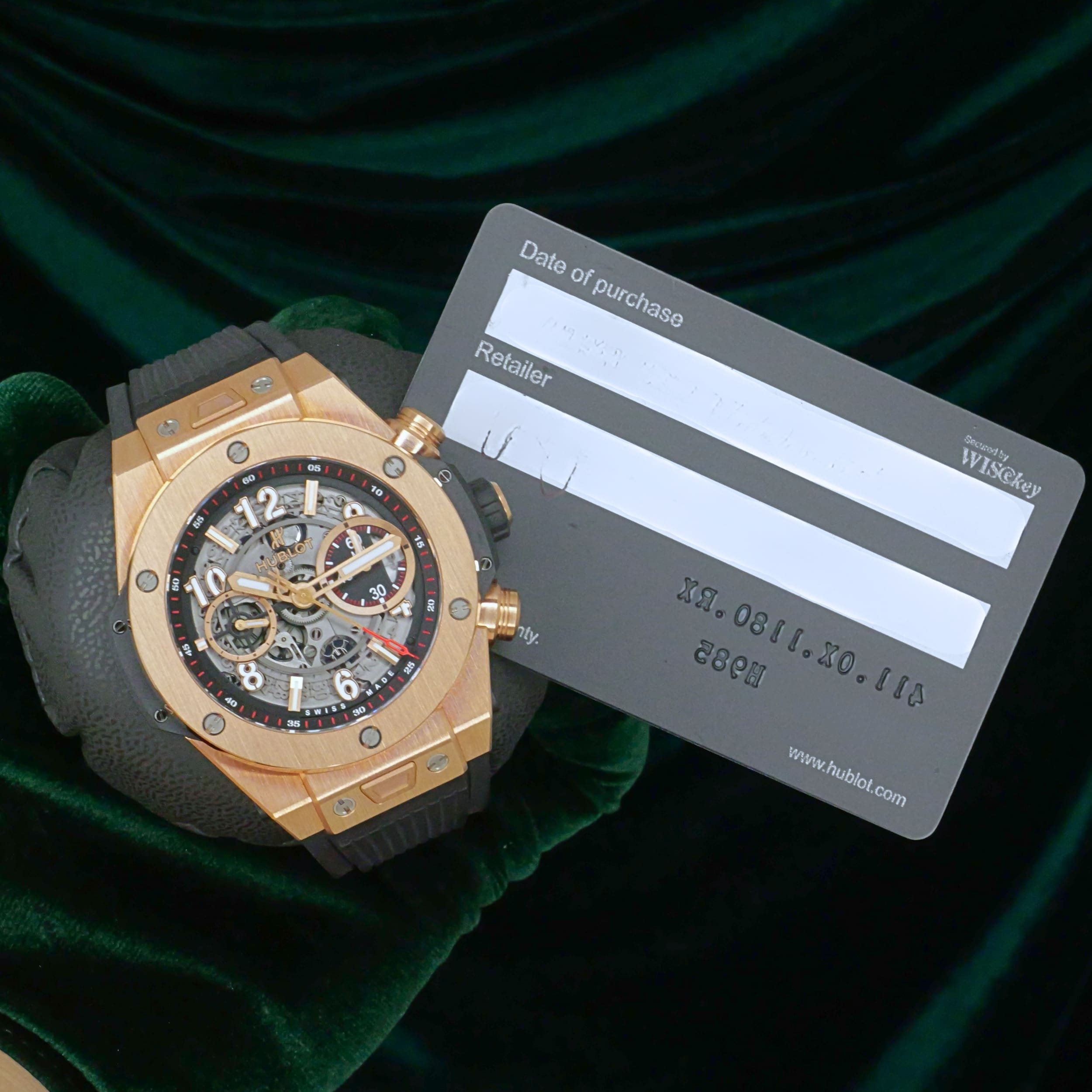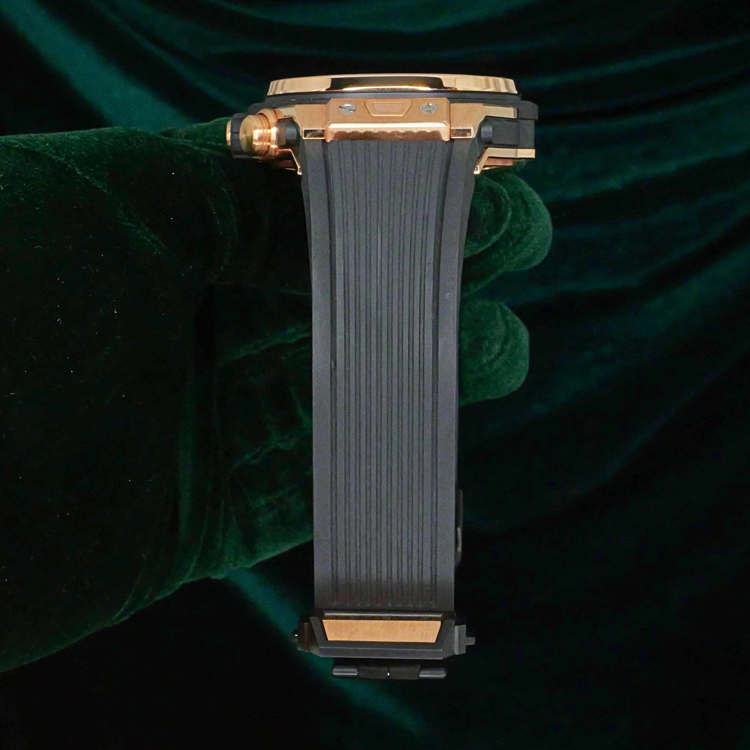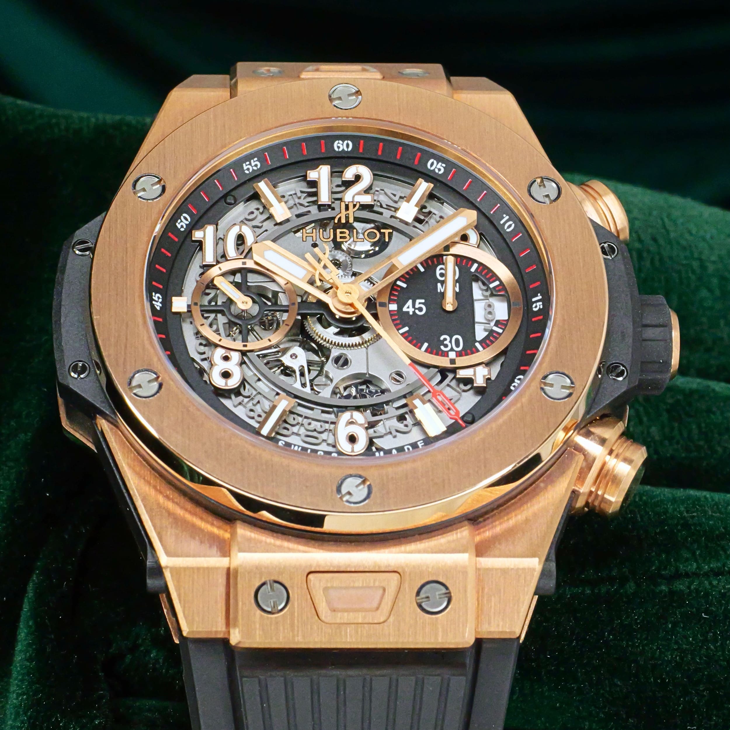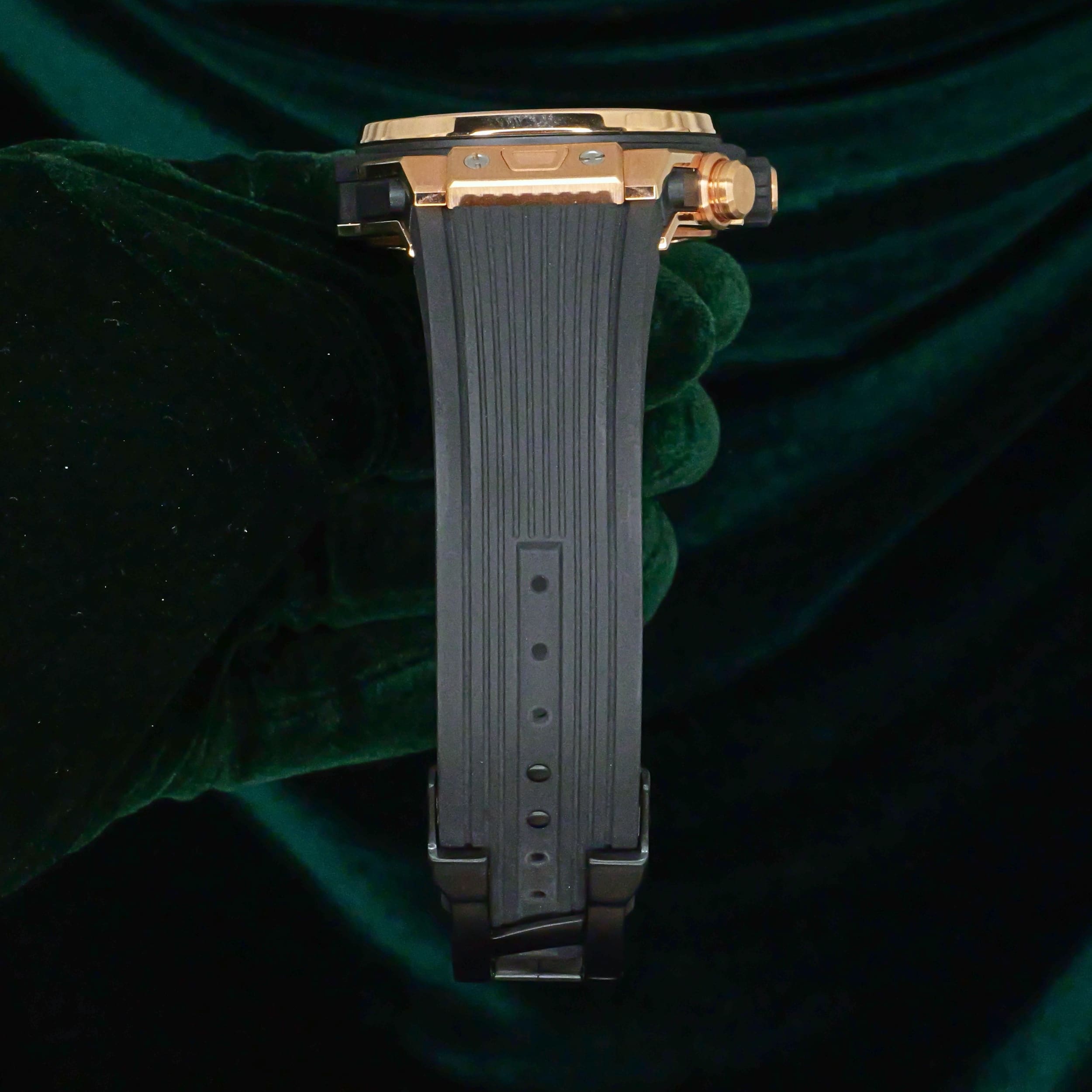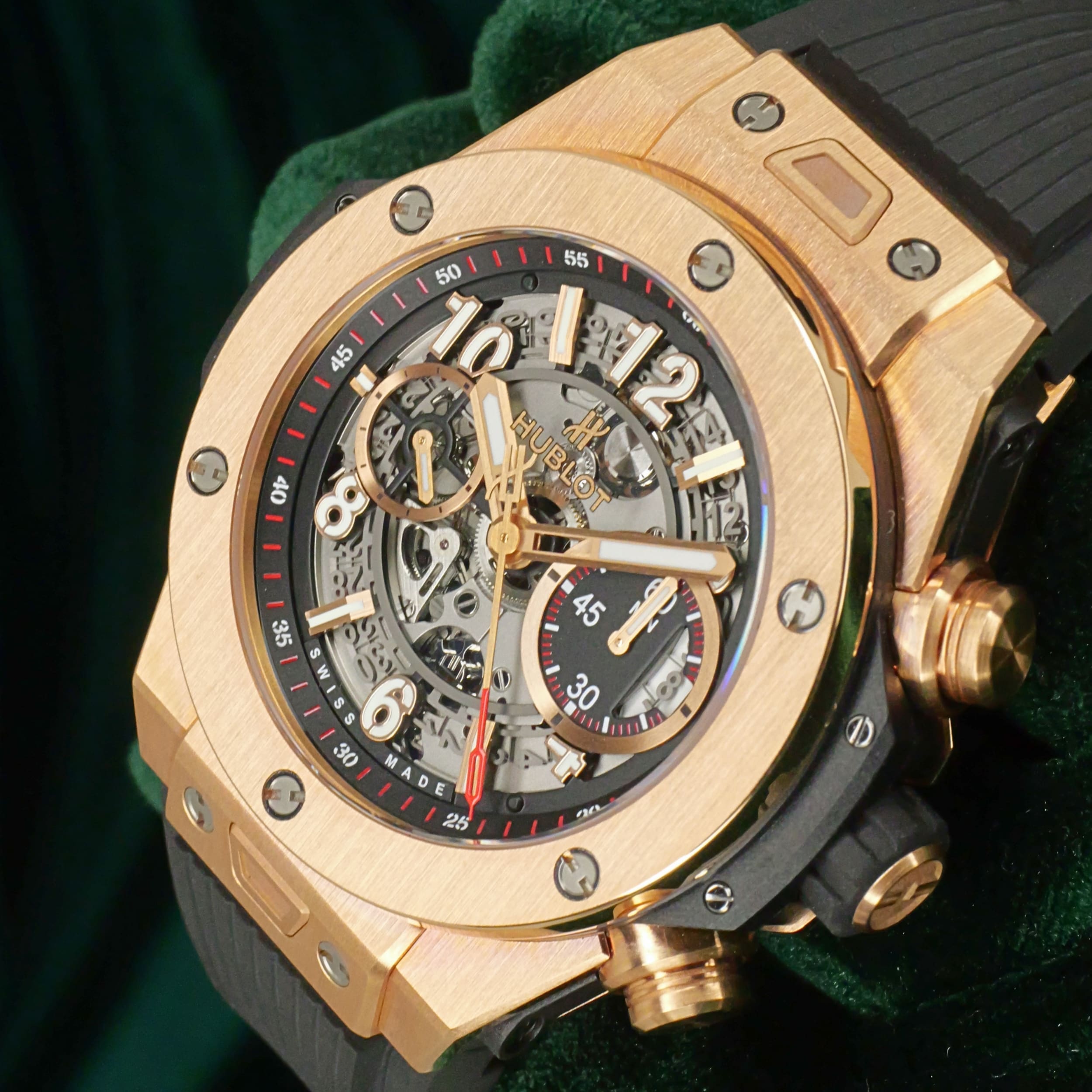 Presents itself in mint condition with little to no signs of wear. Showcasing its openworked dial, the timepiece reveals the in-house Unico movement, where layered components and visible chronograph architecture create a striking visual centerpiece. Featuring an 18K King Gold case, the design introduces warmth and weight, while the black ceramic bezel, secured with exposed screws, reinforces its industrial aesthetic. Completing the composition, the black rubber strap ensures a secure and comfortable fit, balancing the watch’s bold 45mm presence.
