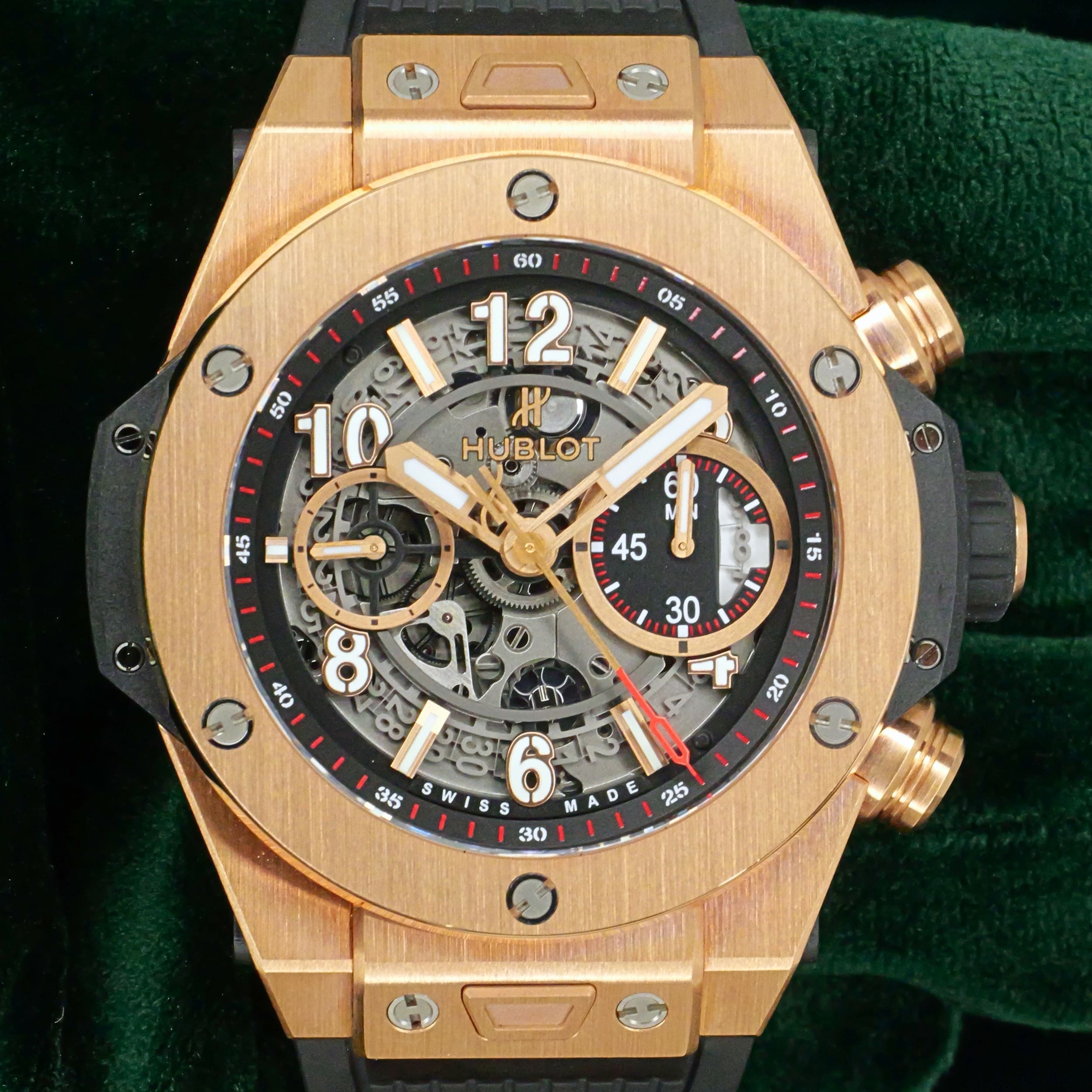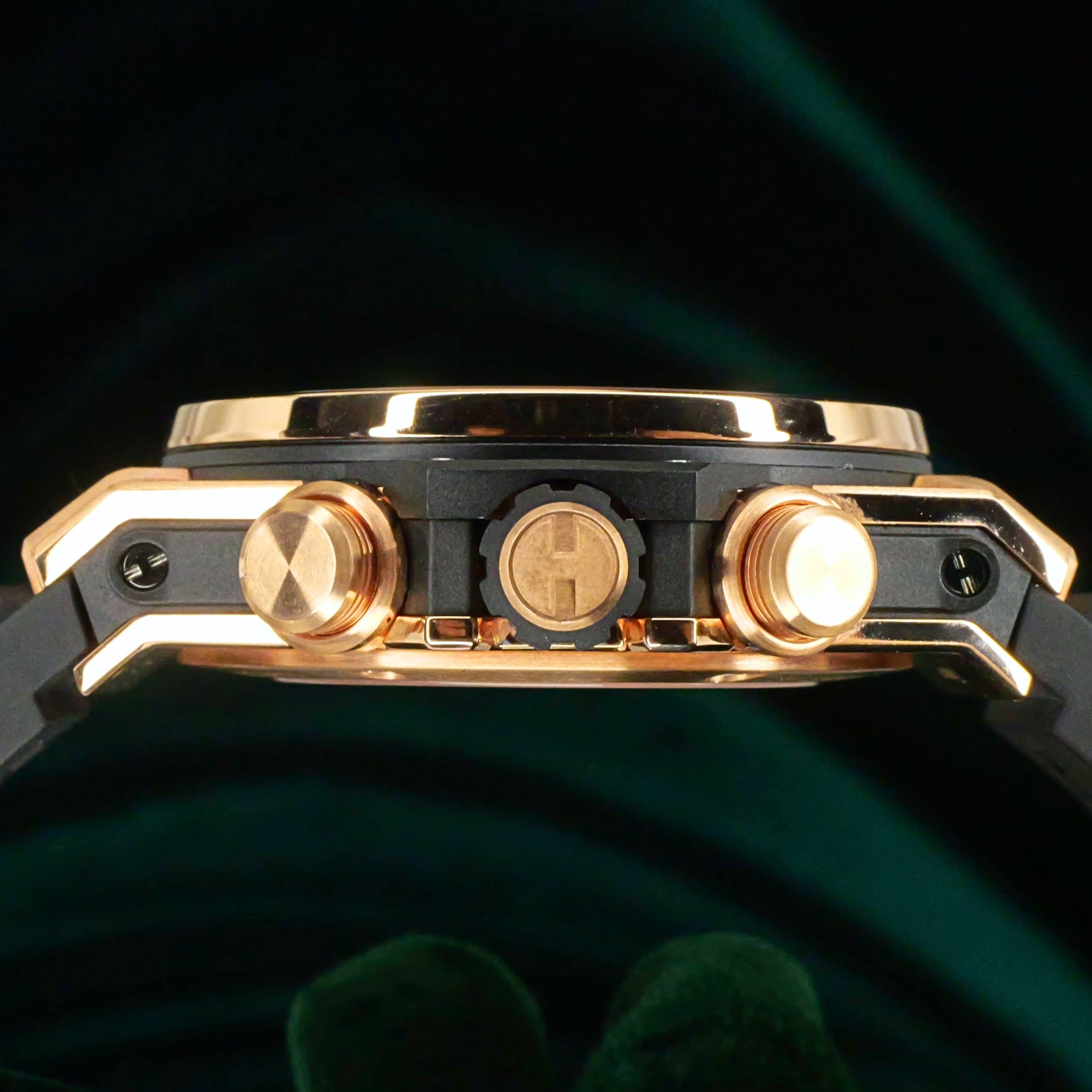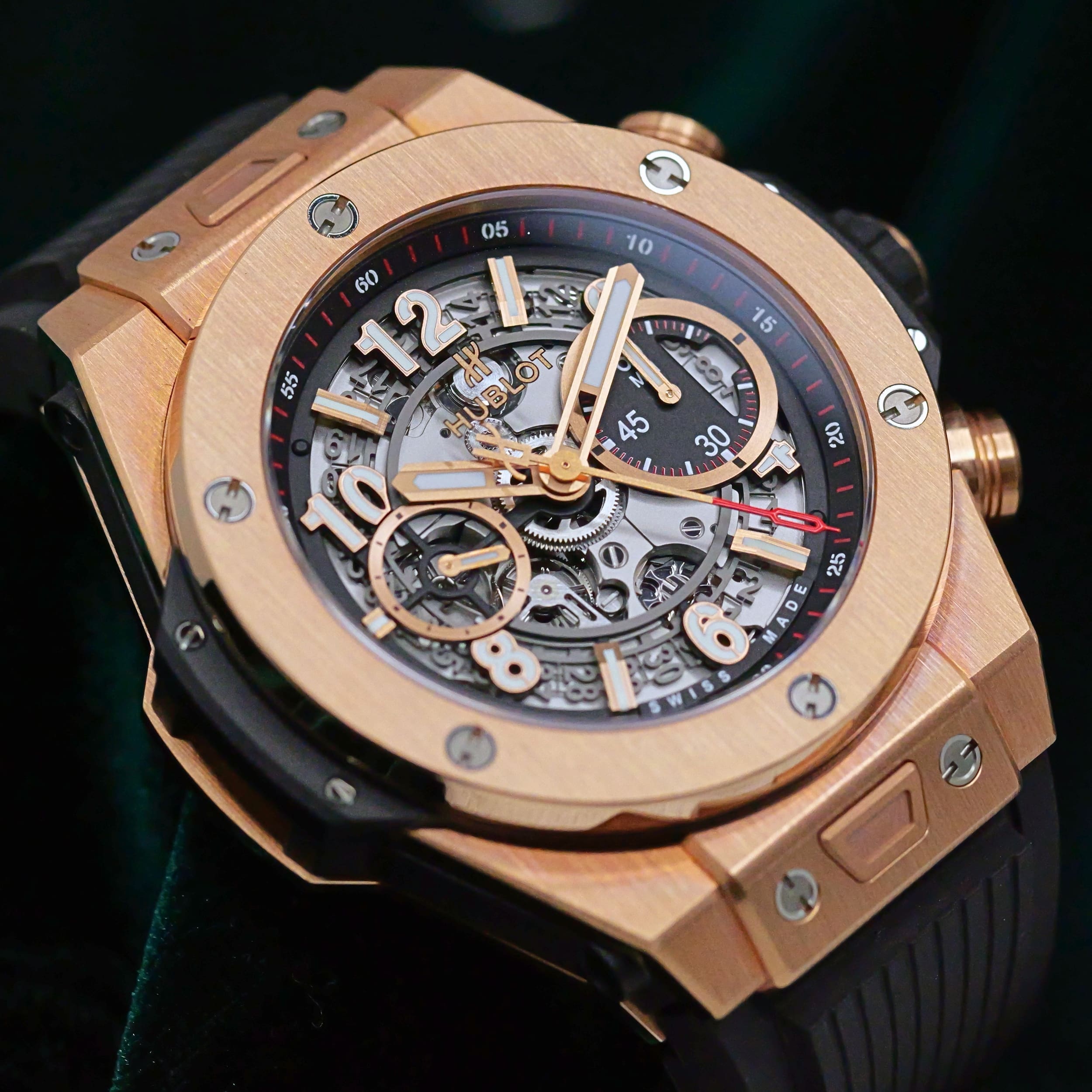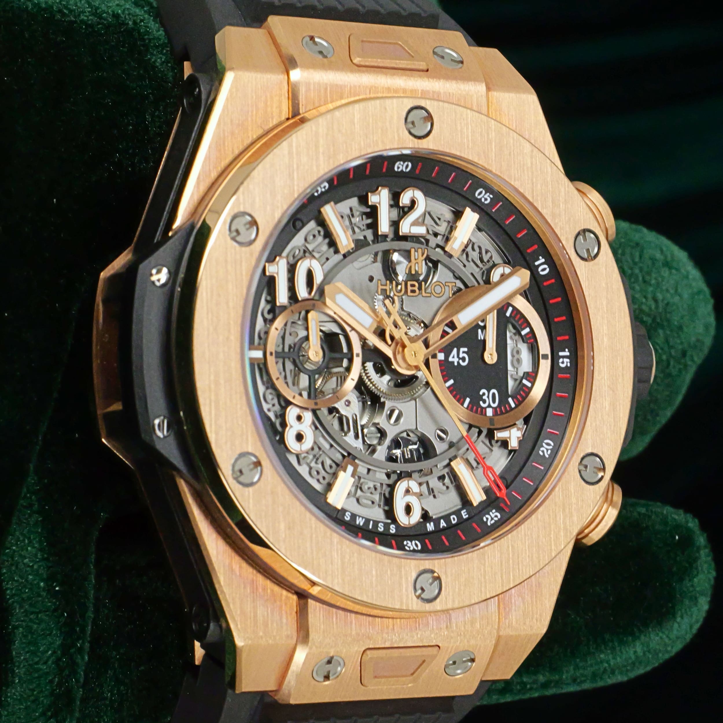 Presents itself in mint condition with little to no signs of wear. Showcasing its openworked dial, the timepiece reveals the in-house Unico movement, where layered components and visible chronograph architecture create a striking visual centerpiece. Featuring an 18K King Gold case, the design introduces warmth and weight, while the black ceramic bezel, secured with exposed screws, reinforces its industrial aesthetic. Completing the composition, the black rubber strap ensures a secure and comfortable fit, balancing the watch’s bold 45mm presence.
