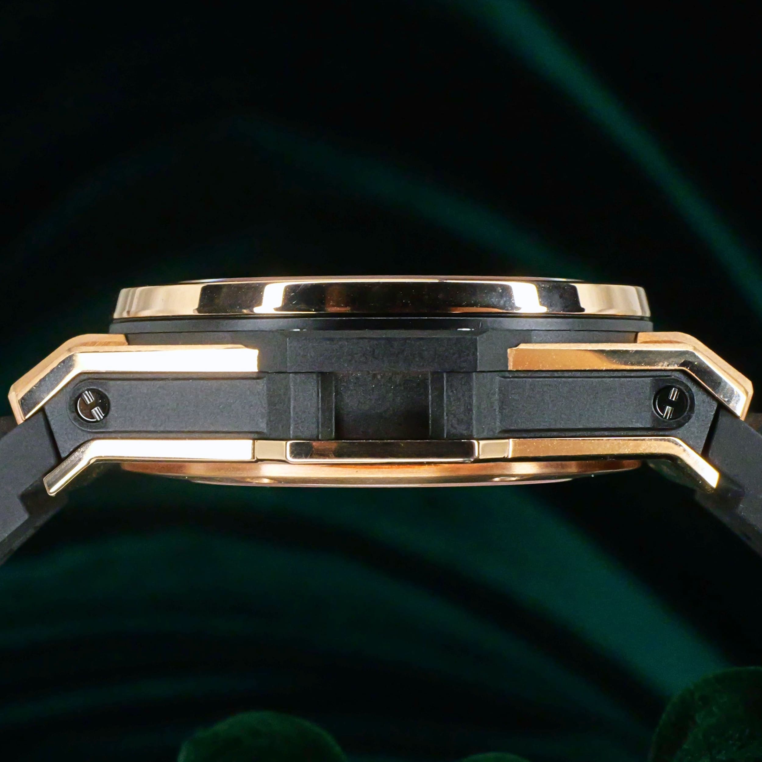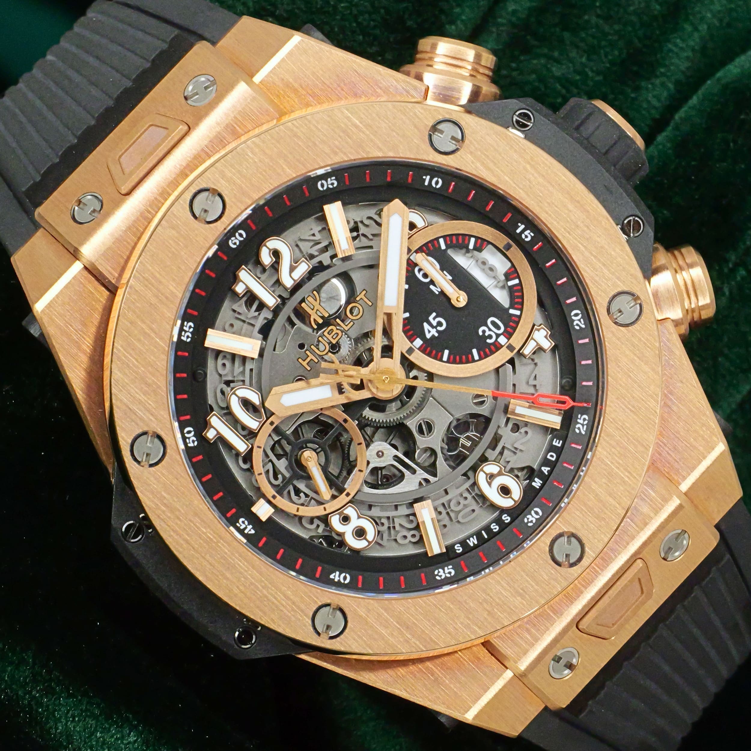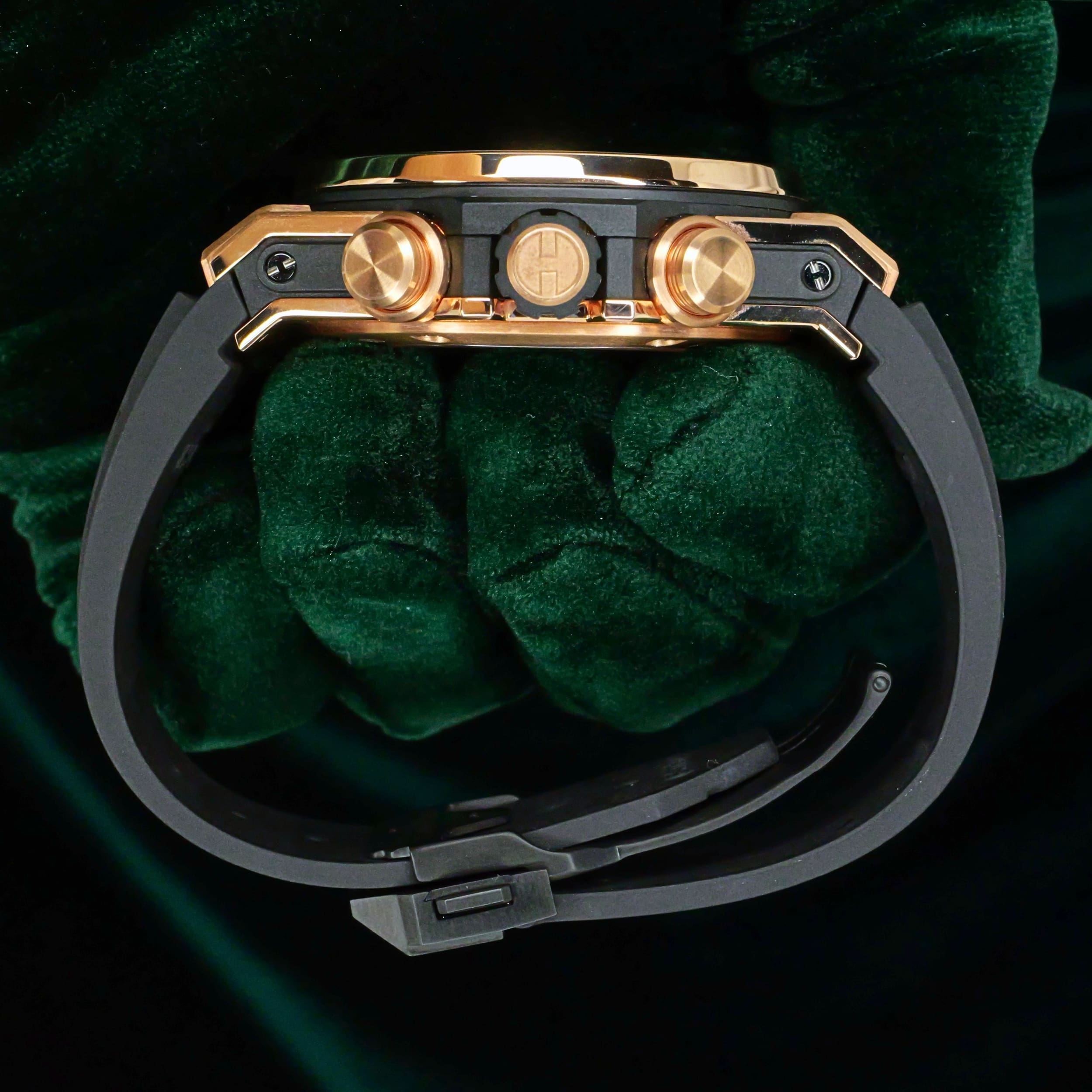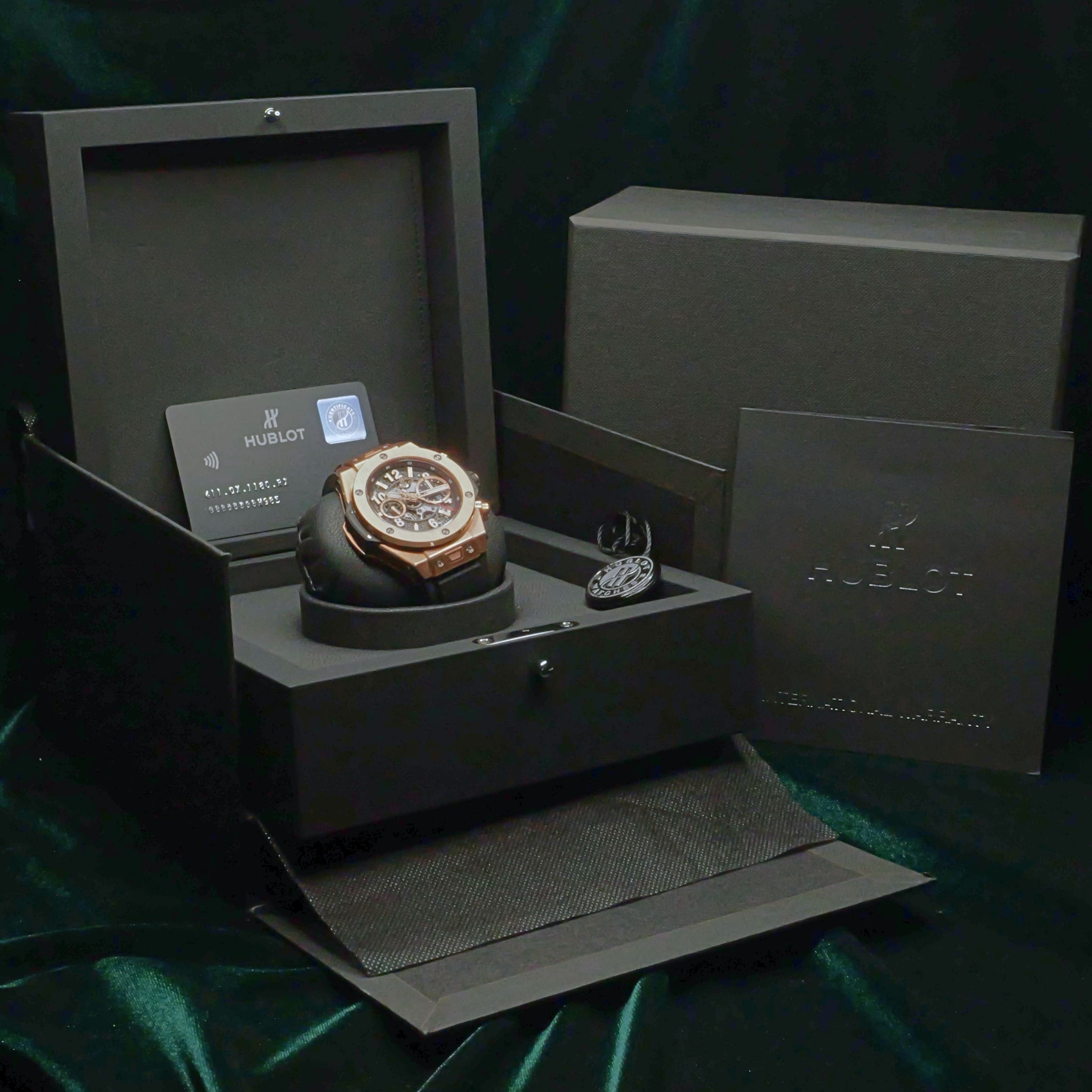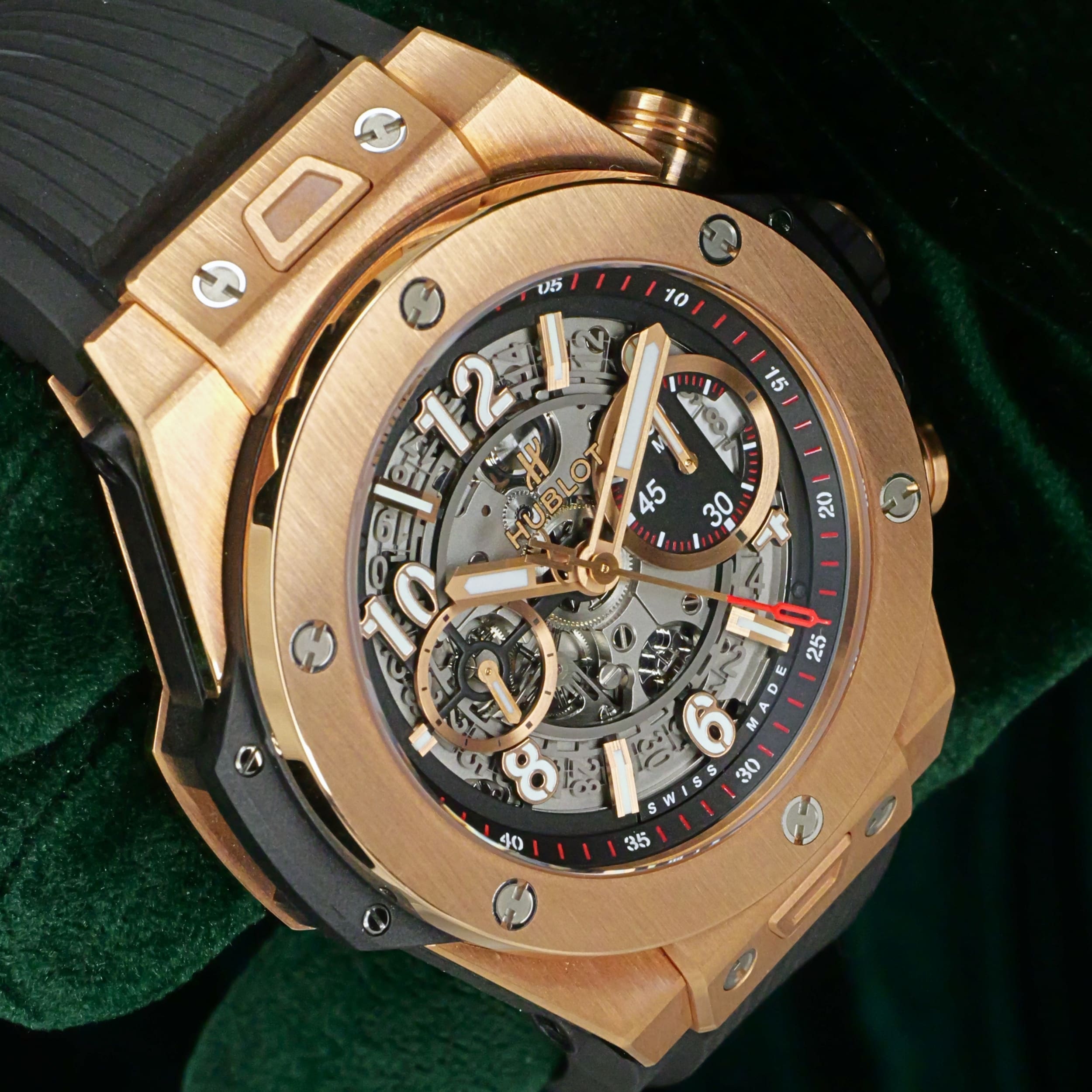 Presents itself in mint condition with little to no signs of wear. Showcasing its openworked dial, the timepiece reveals the in-house Unico movement, where layered components and visible chronograph architecture create a striking visual centerpiece. Featuring an 18K King Gold case, the design introduces warmth and weight, while the black ceramic bezel, secured with exposed screws, reinforces its industrial aesthetic. Completing the composition, the black rubber strap ensures a secure and comfortable fit, balancing the watch’s bold 45mm presence.