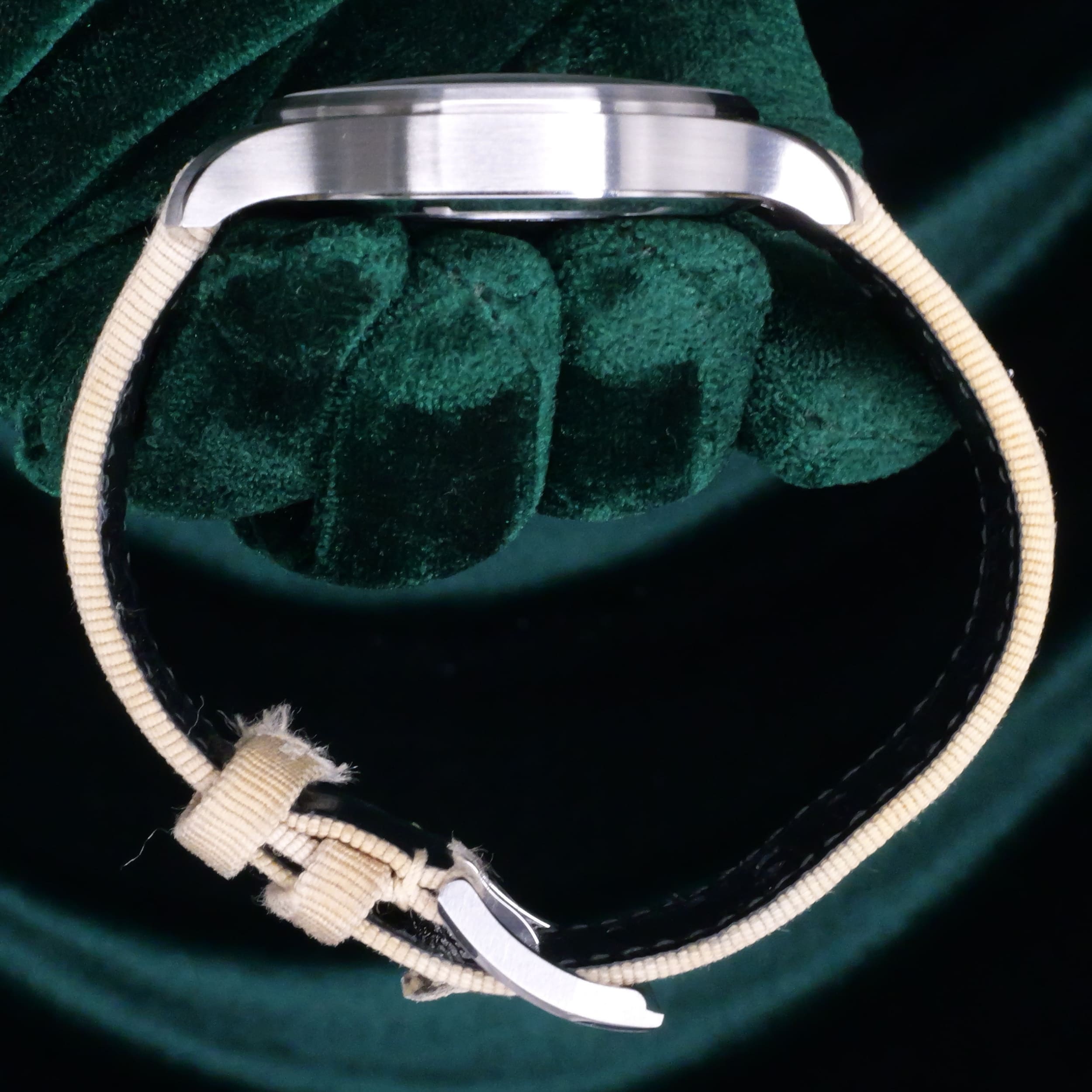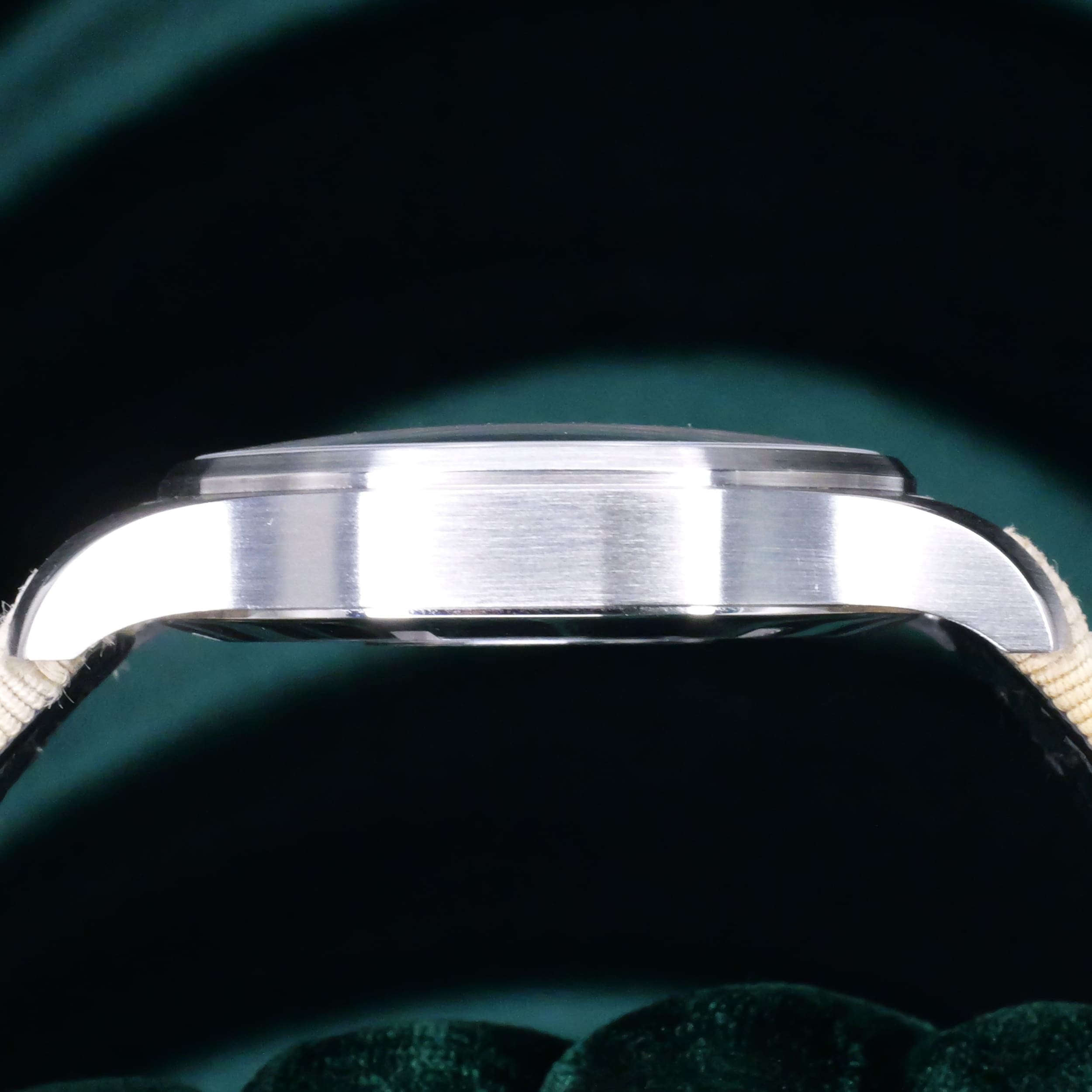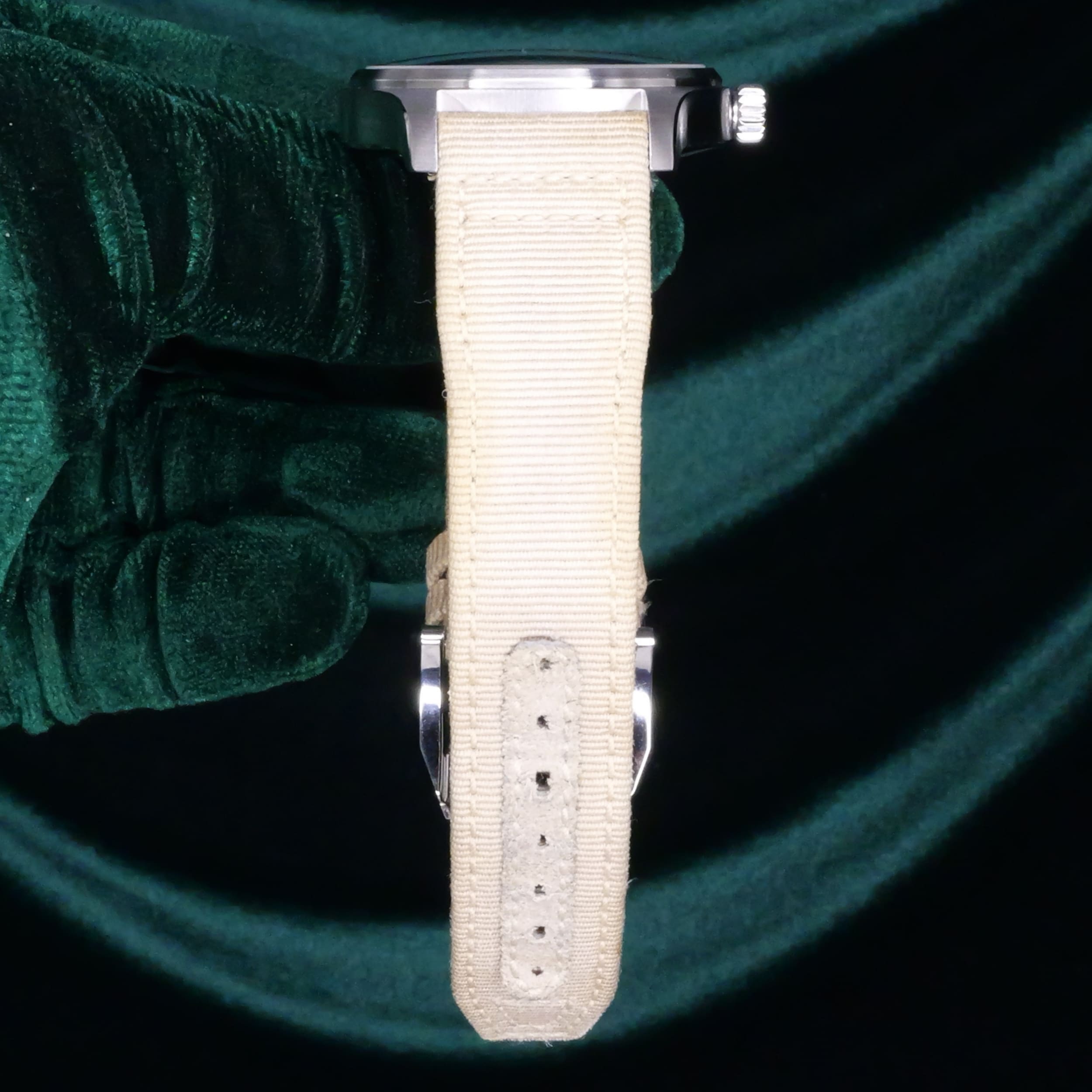 Presents itself in mint condition with little to no signs of wear. Warm tones on the silver sunburst dial give added clarity to the hour markers in virtually all light conditions. Polished bevels throughout the case and fixed bezel give a subtle yet effective definition with the brushed surfaces of the stainless steel. The crisp beige texture strap gives a classy touch while being able to match many outfits due to its neutral tone. Complimenting the overall clean design of the dial, the light-blue lume is featured on the hour and minute hands as well as the 12, 3, 6, and 9 o’clock markers.