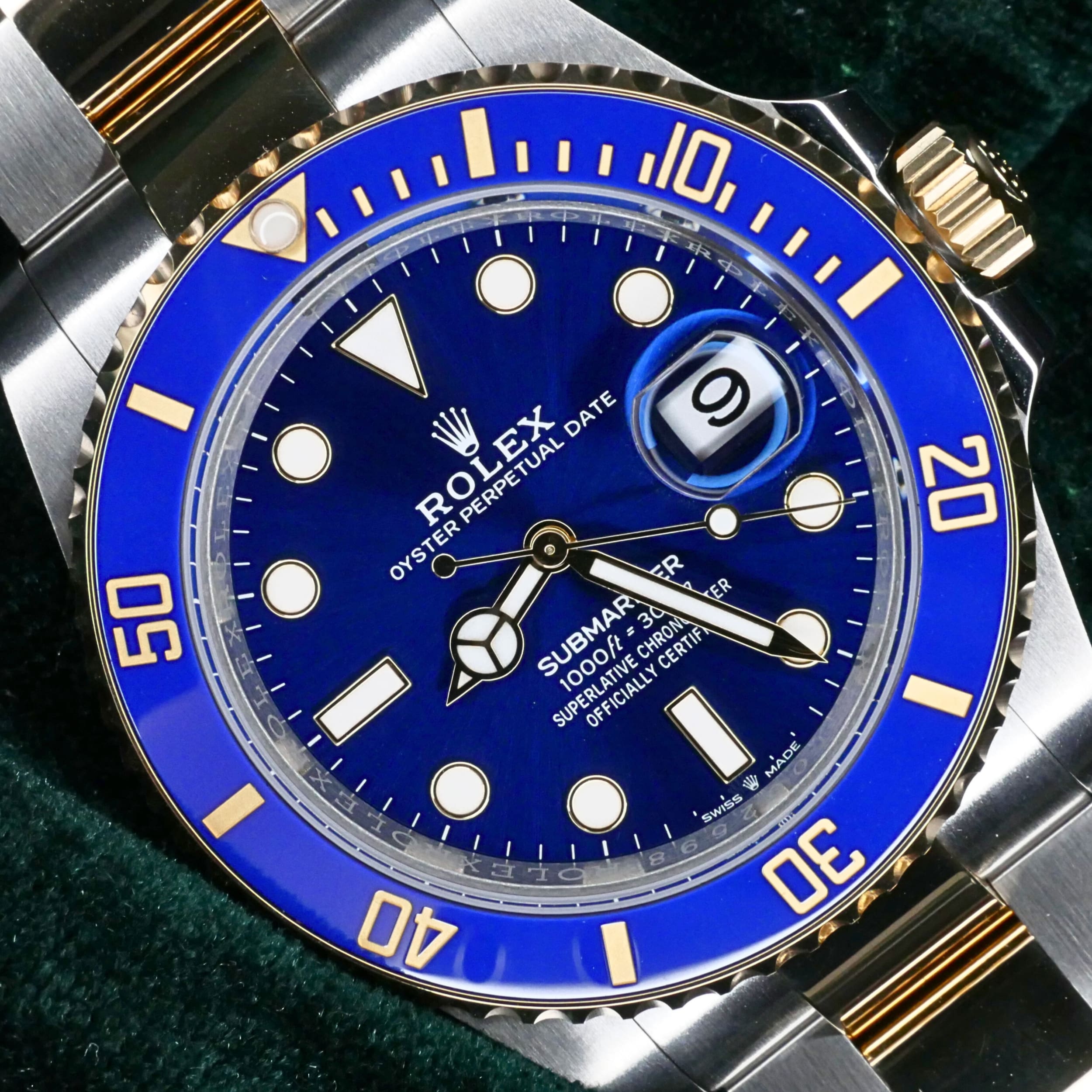 This is a brand new and unworn timepiece. It has a two-tone bracelet made up of stainless steel and yellow gold and a rotating ceramic bezel. Its functions includes seconds, minutes and hours. The blue dial, reminiscent of the ocean, creates a stunning effect when it catches the sunlight, inviting you to go on adventures.