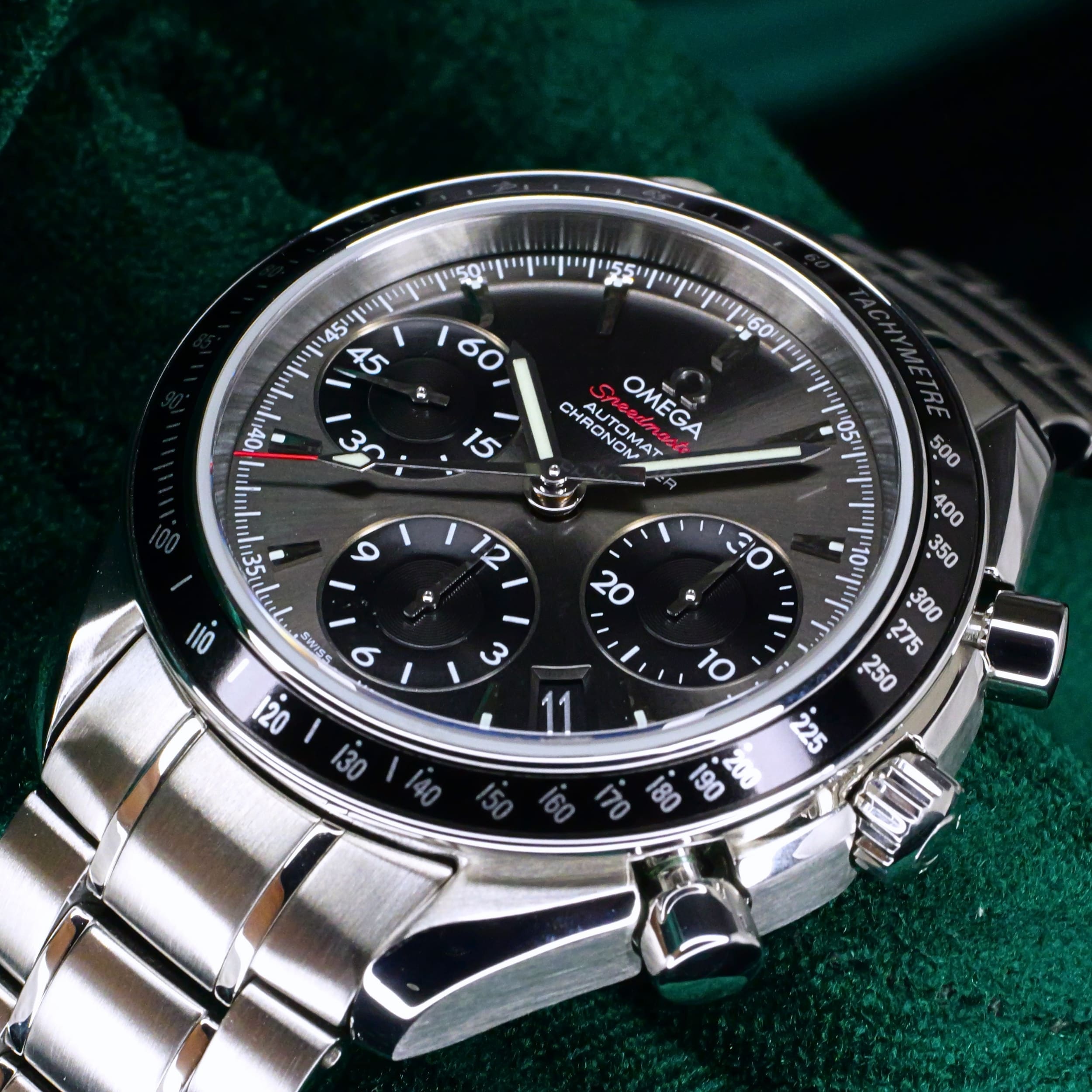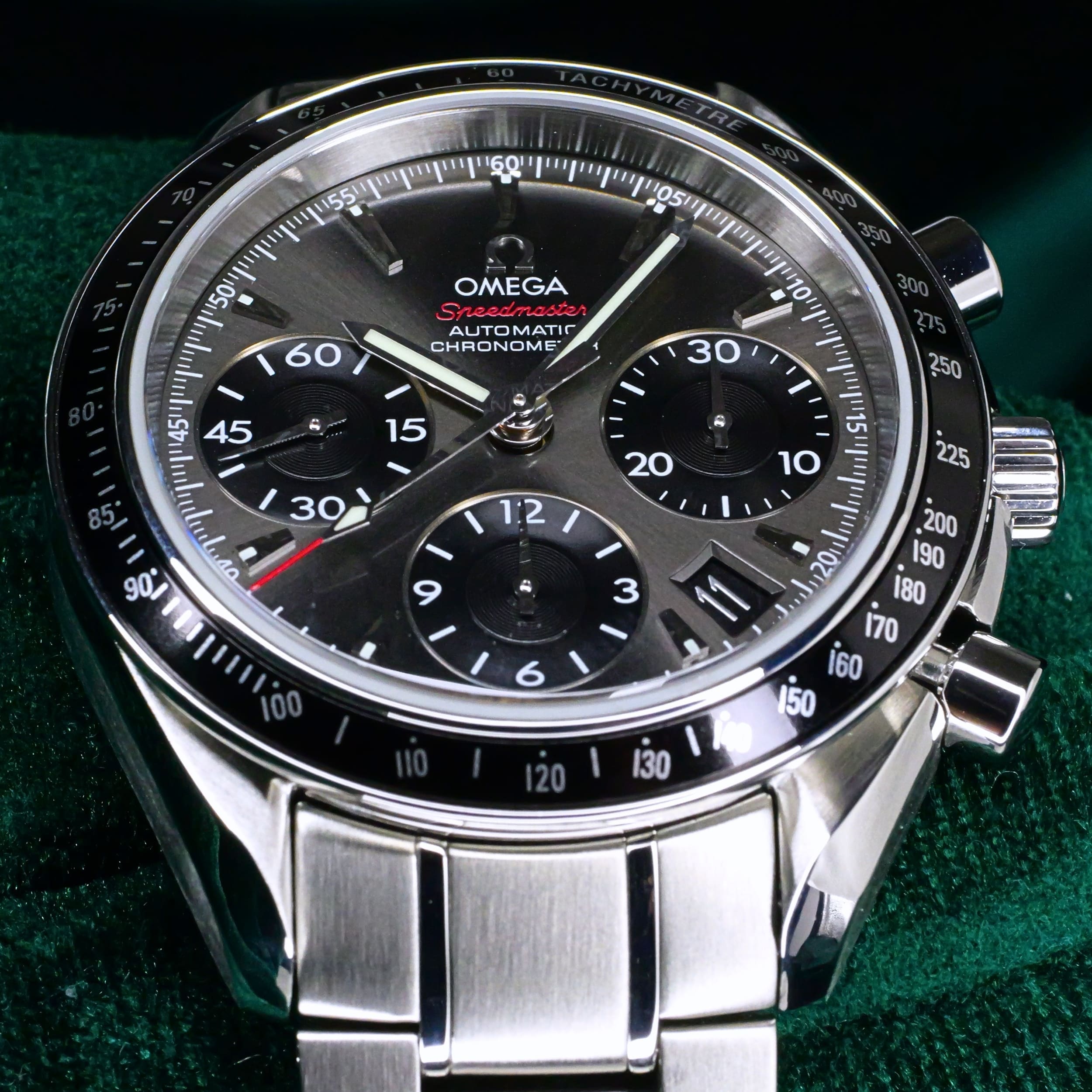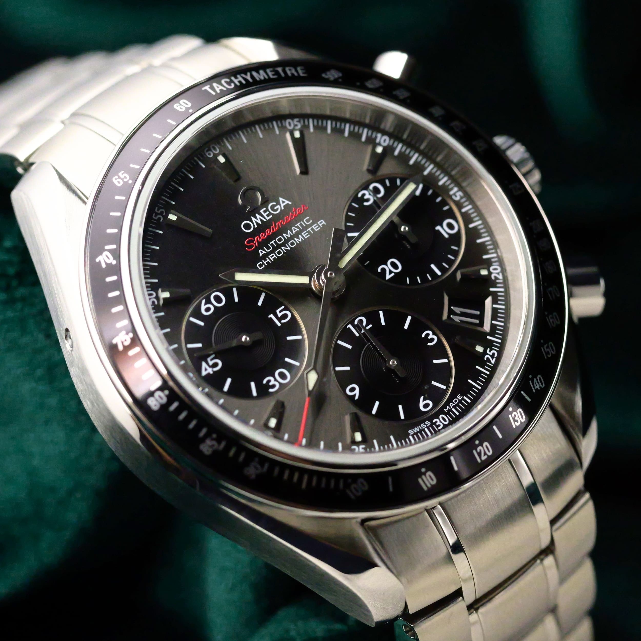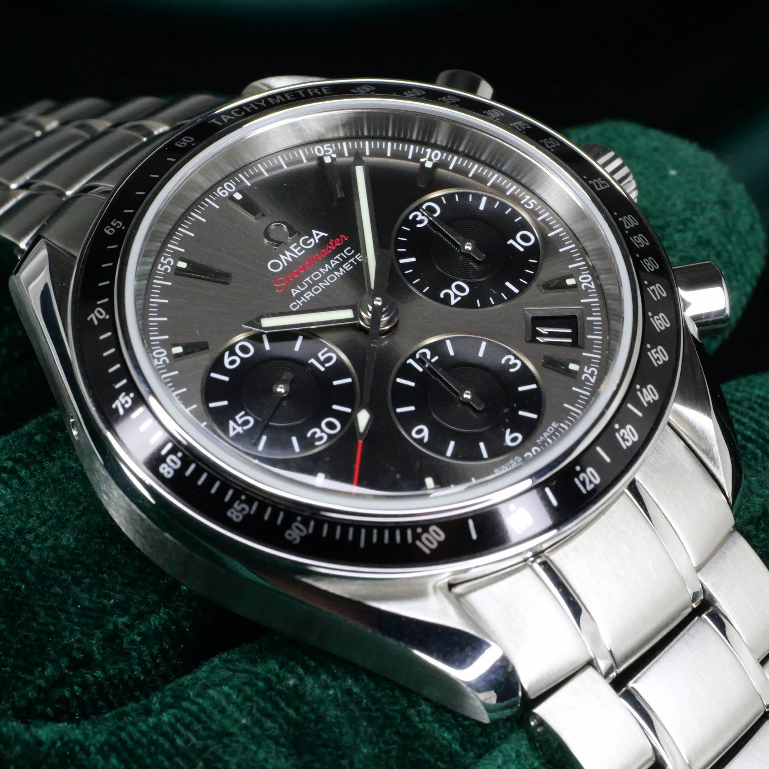 Presents itself in mint condition with little to no signs of wear. The beautiful sunburst dial offers better contrast to read the black subdials, complete with date window located at the 4:30 position. Complimenting the chronograph, you can find double-digit second reads at the top of each hour marker/position. With true Speedmaster DNA, the black ceramic bezel contains the tachymetre scale to provide accurate readings.