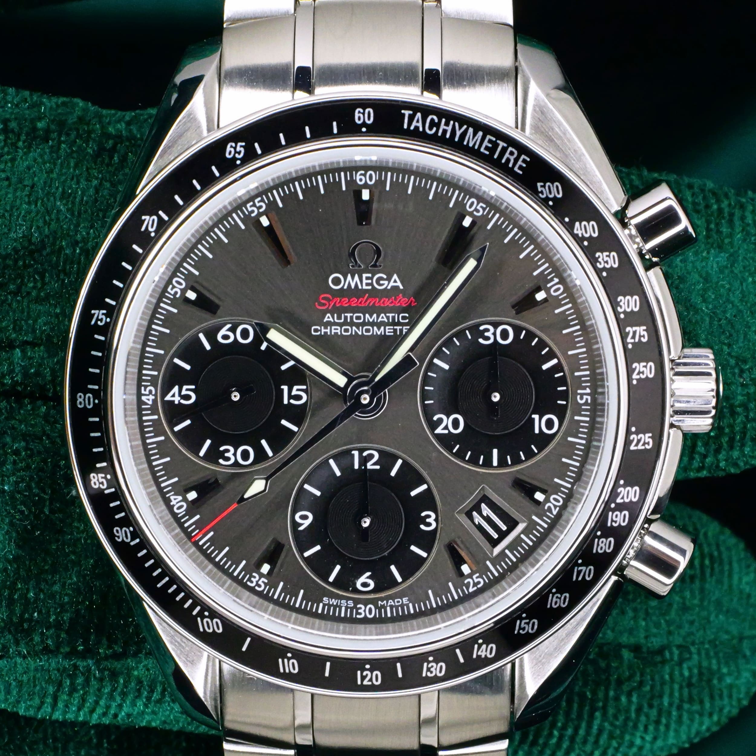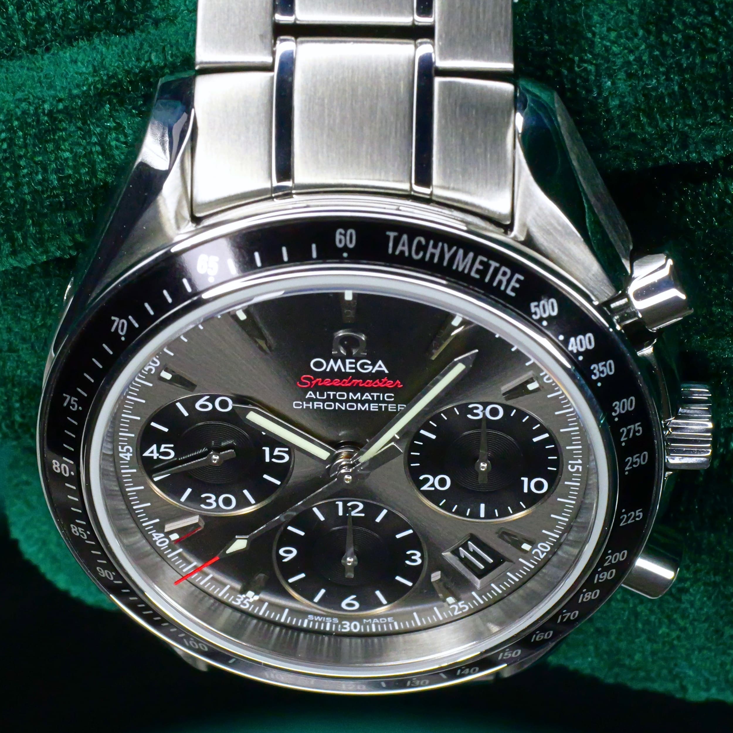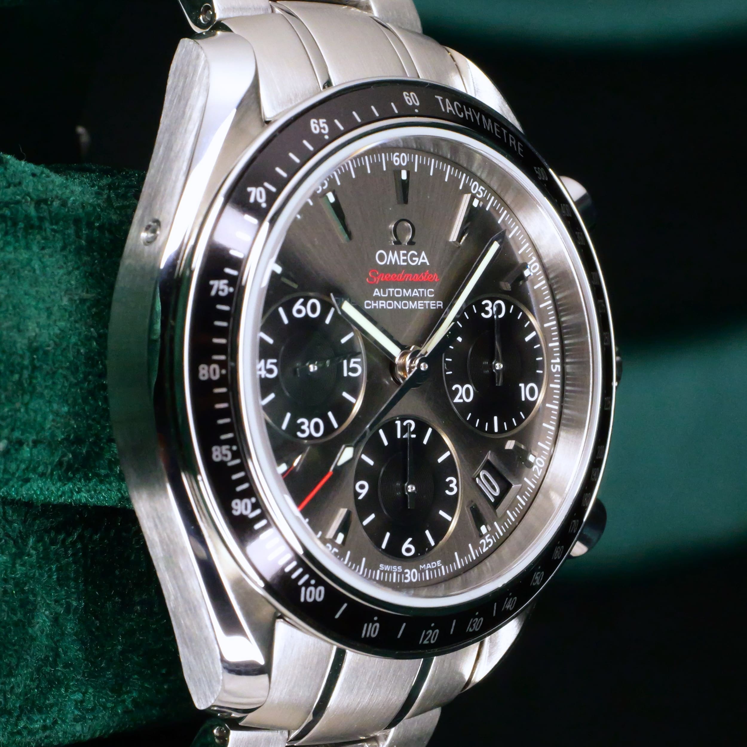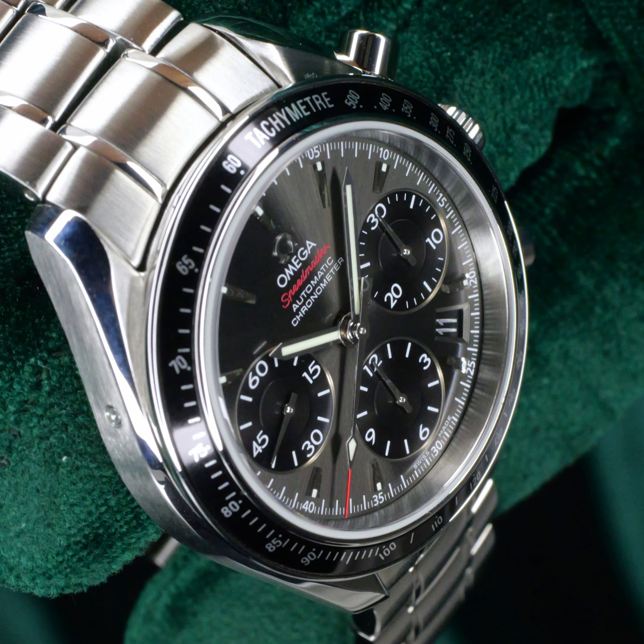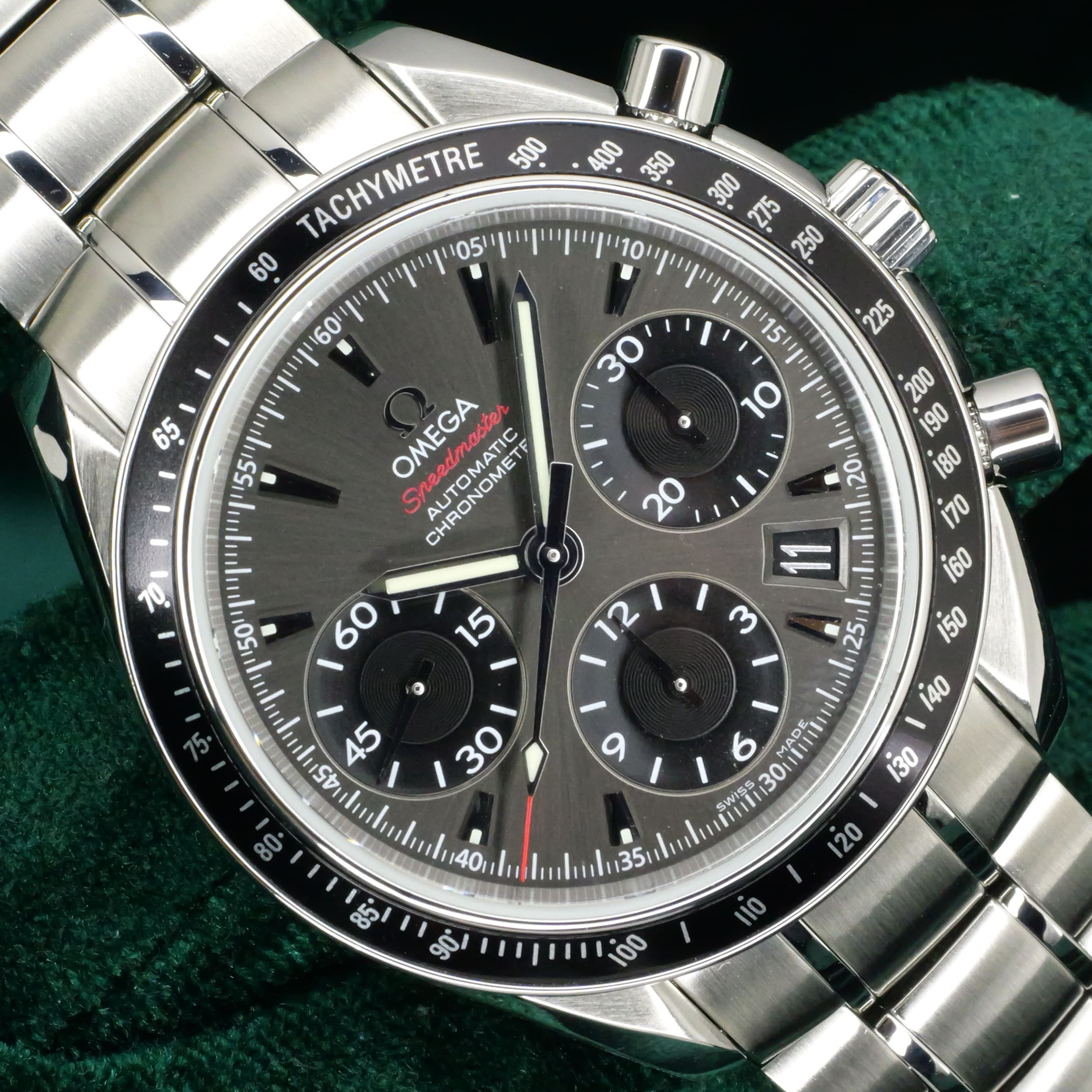 Presents itself in mint condition with little to no signs of wear. The beautiful sunburst dial offers better contrast to read the black subdials, complete with date window located at the 4:30 position. Complimenting the chronograph, you can find double-digit second reads at the top of each hour marker/position. With true Speedmaster DNA, the black ceramic bezel contains the tachymetre scale to provide accurate readings.