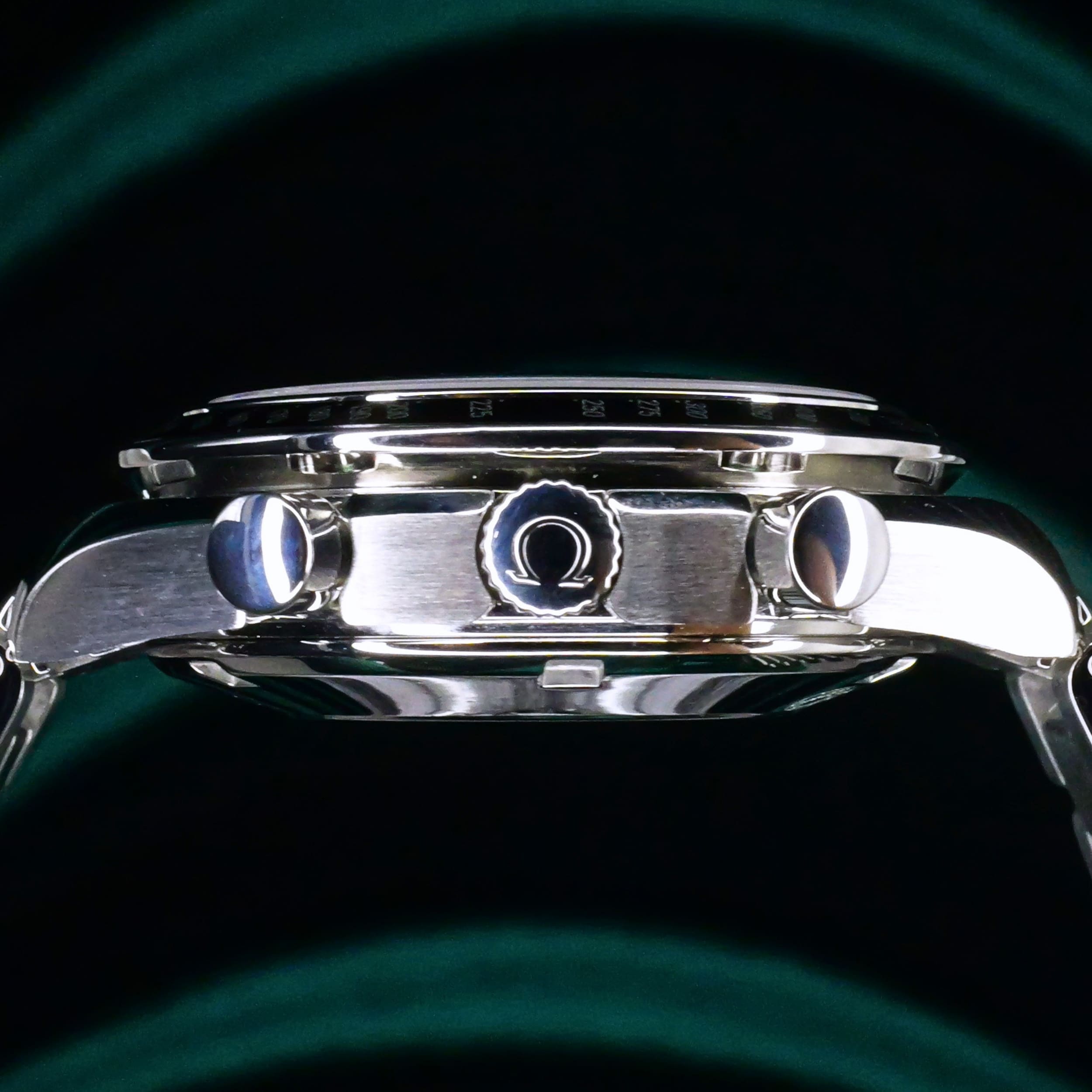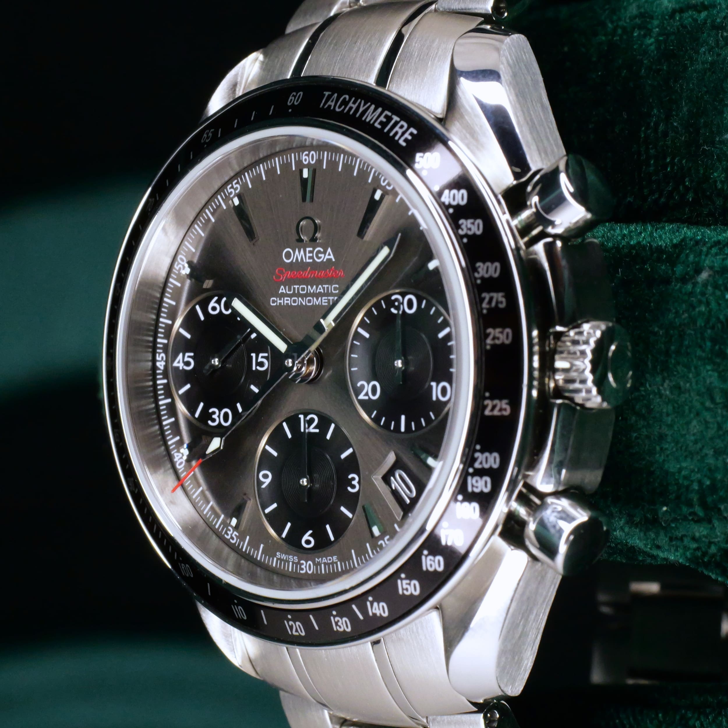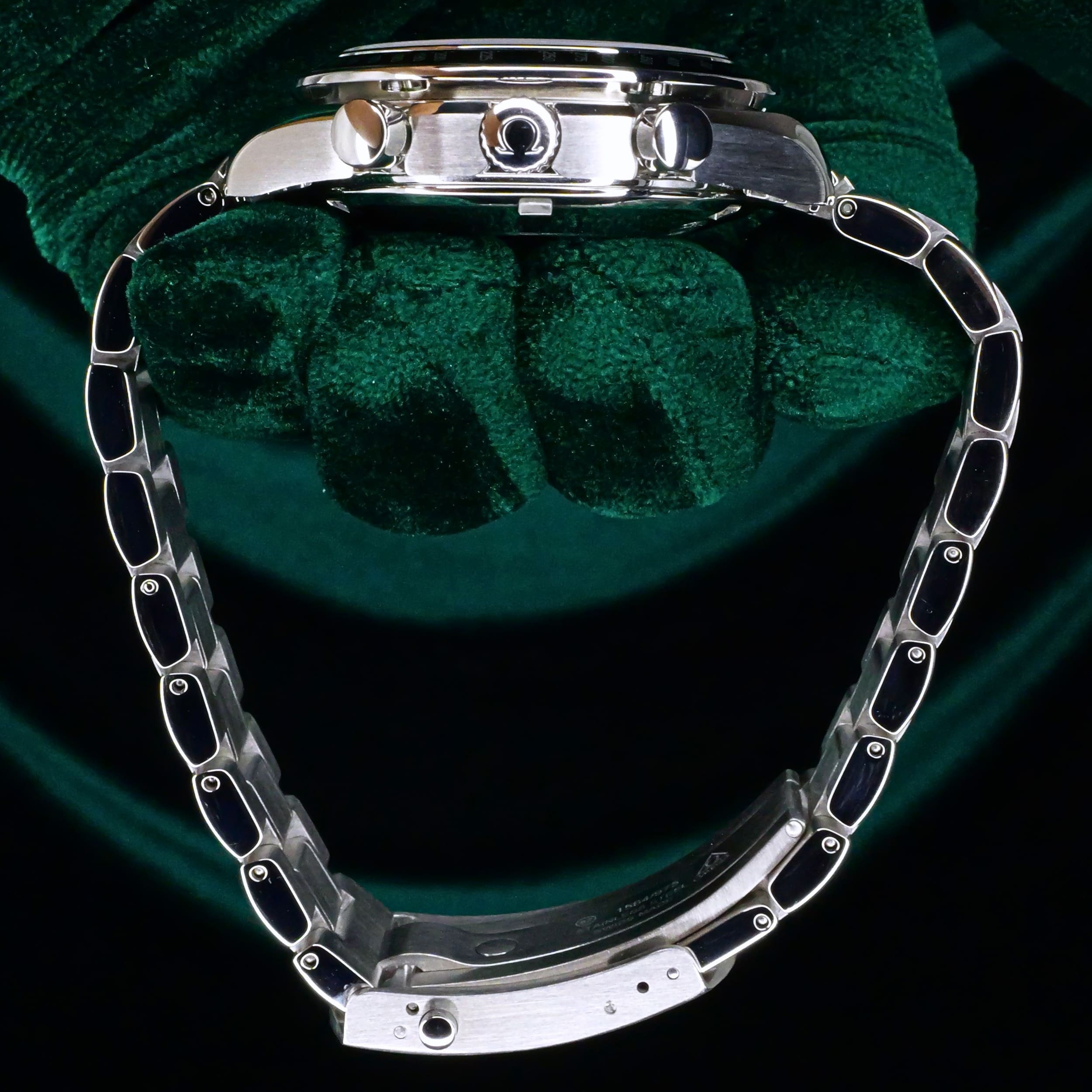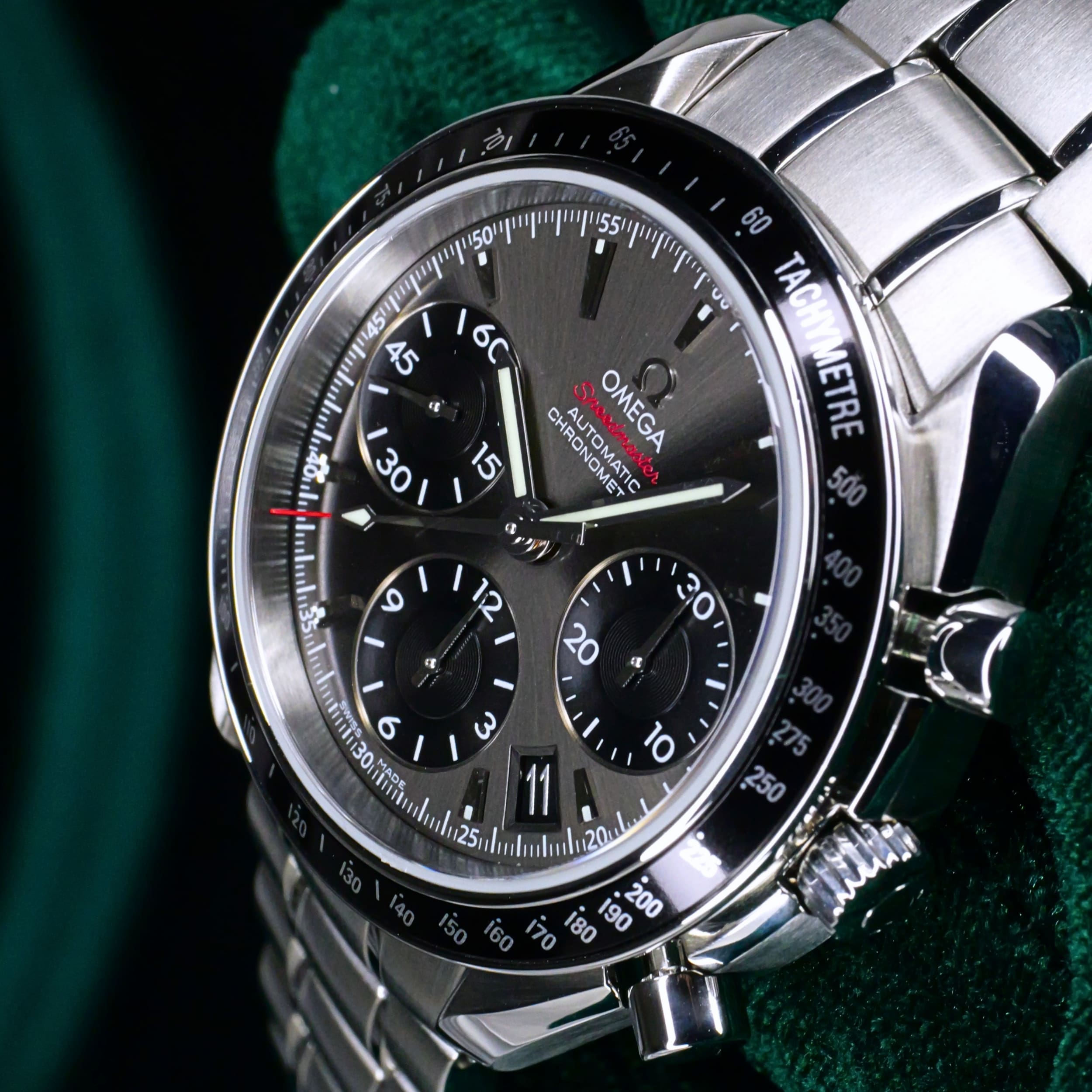 Presents itself in mint condition with little to no signs of wear. The beautiful sunburst dial offers better contrast to read the black subdials, complete with date window located at the 4:30 position. Complimenting the chronograph, you can find double-digit second reads at the top of each hour marker/position. With true Speedmaster DNA, the black ceramic bezel contains the tachymetre scale to provide accurate readings.