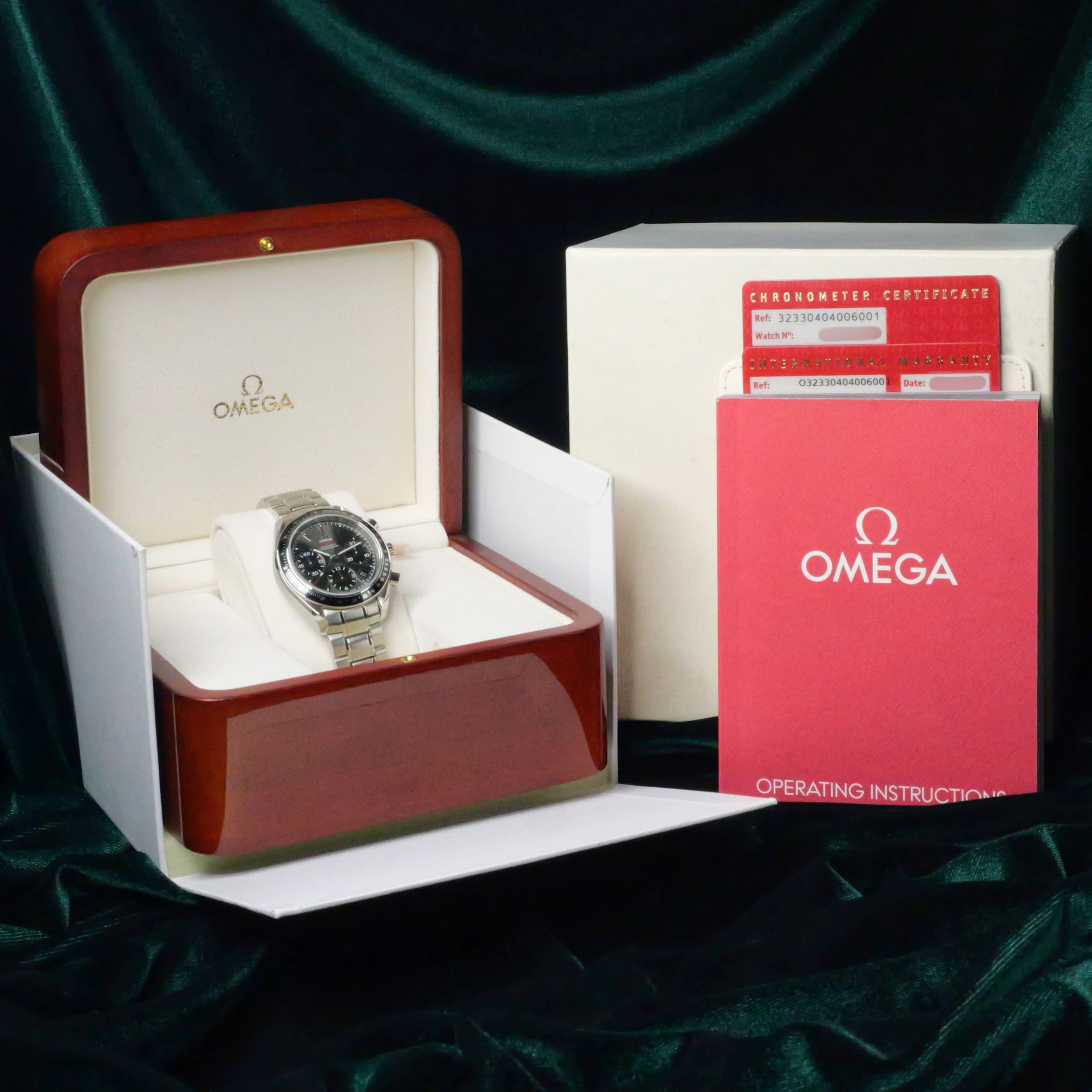 Comes as a full set, double-boxed with watch pillow, warranty wallet, warranty card, chronometer certificate, and operating manual.