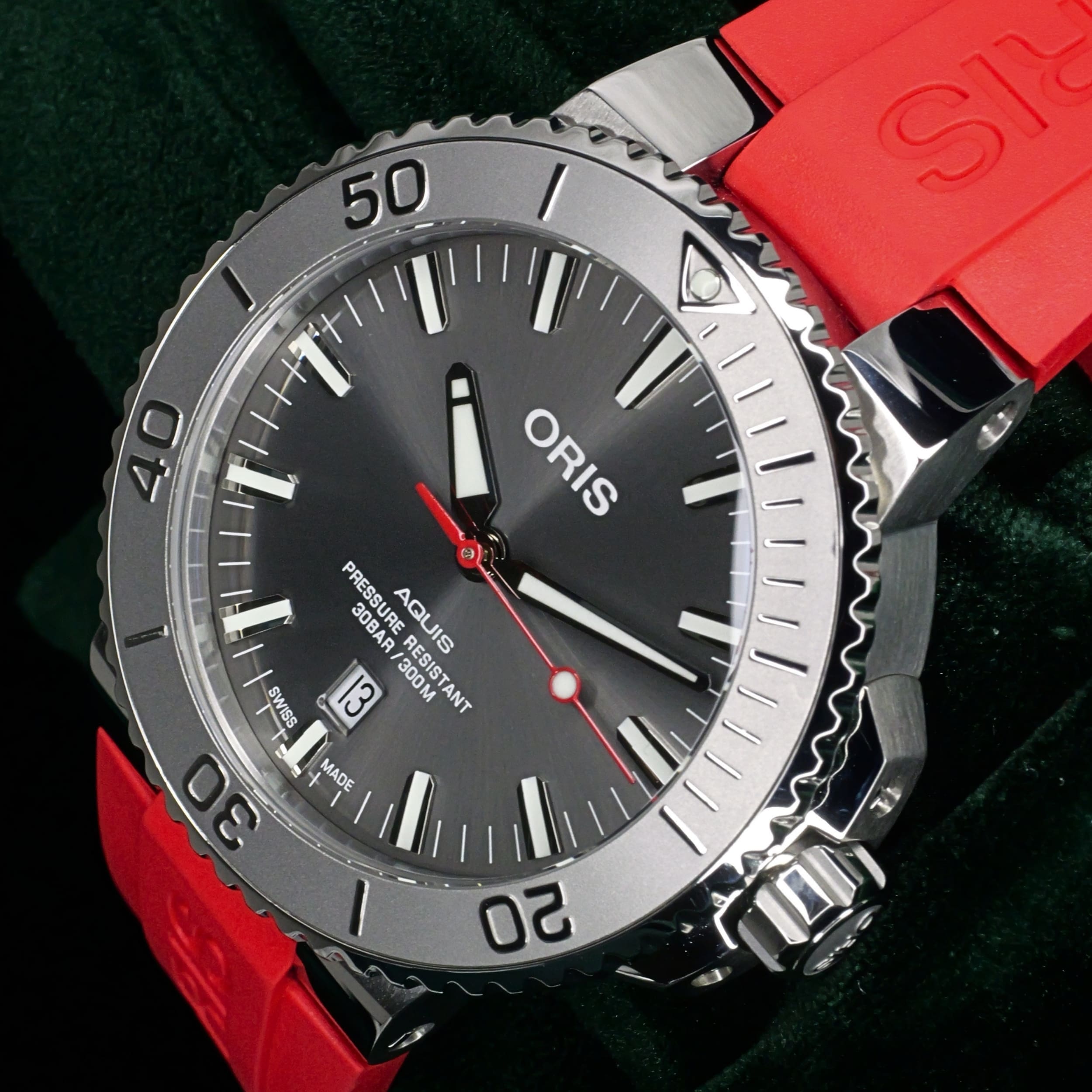 Presents itself in mint condition with some signs of wear. The sunburst grey dial reveals a soft gradient of tones as light moves across its surface, shifting between silvery highlights and deeper graphite hues. Surrounding the dial, the matching grey bezel creates a seamless monochromatic look that feels both modern and refined. The stainless steel case showcases a balanced combination of brushed and polished finishes, while the red rubber strap introduces a confident contrast that adds energy and individuality to the overall design.