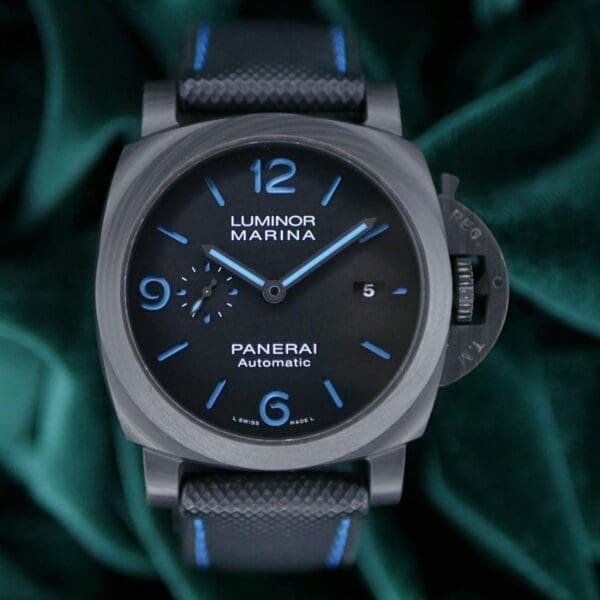 This timepiece features a sophisticated black dial and a carbotech bezel, a date display at 3 o’clock, a 60-seconds sub-dial at 9 o’clock, and luminescent hour hands for optimal visibility in low light conditions.