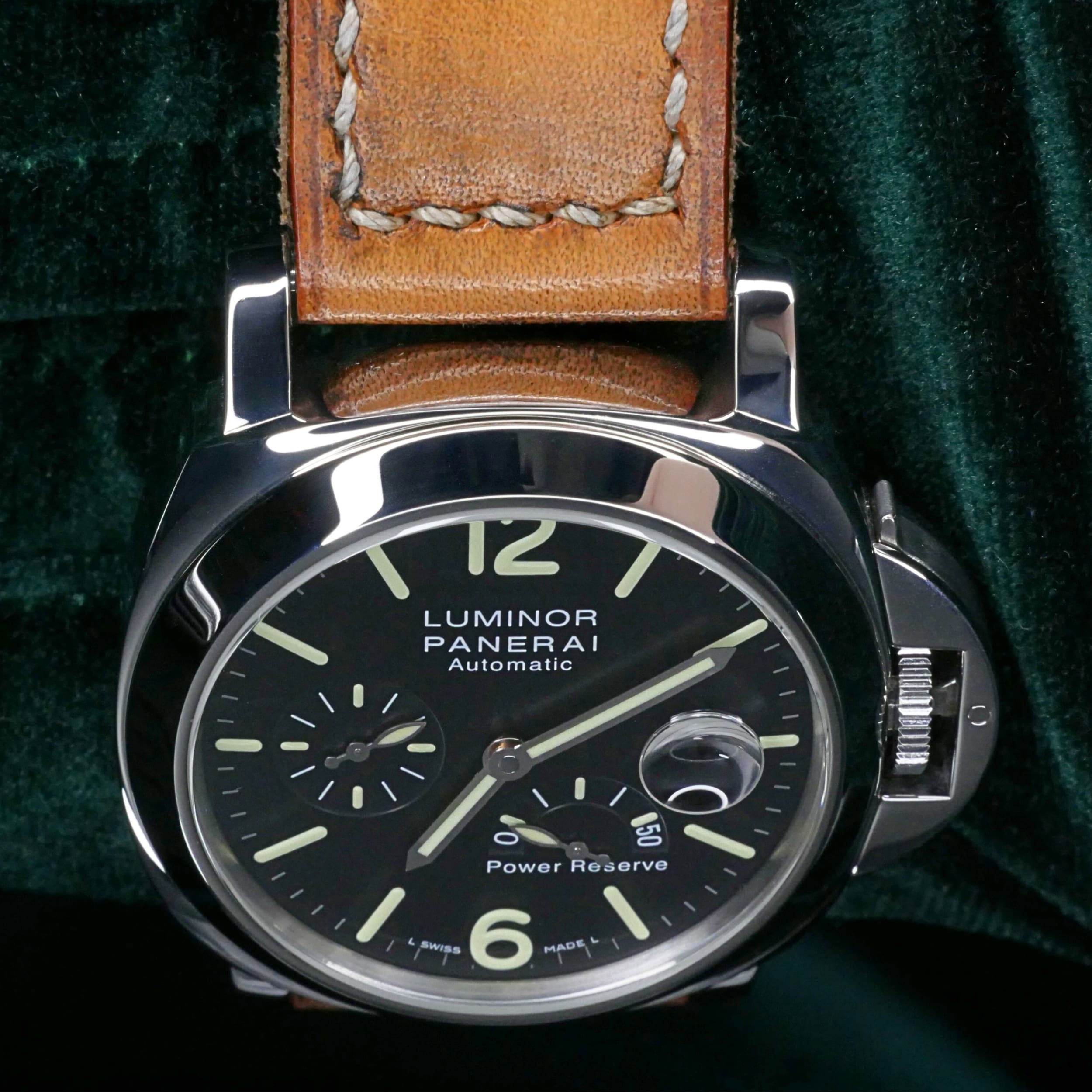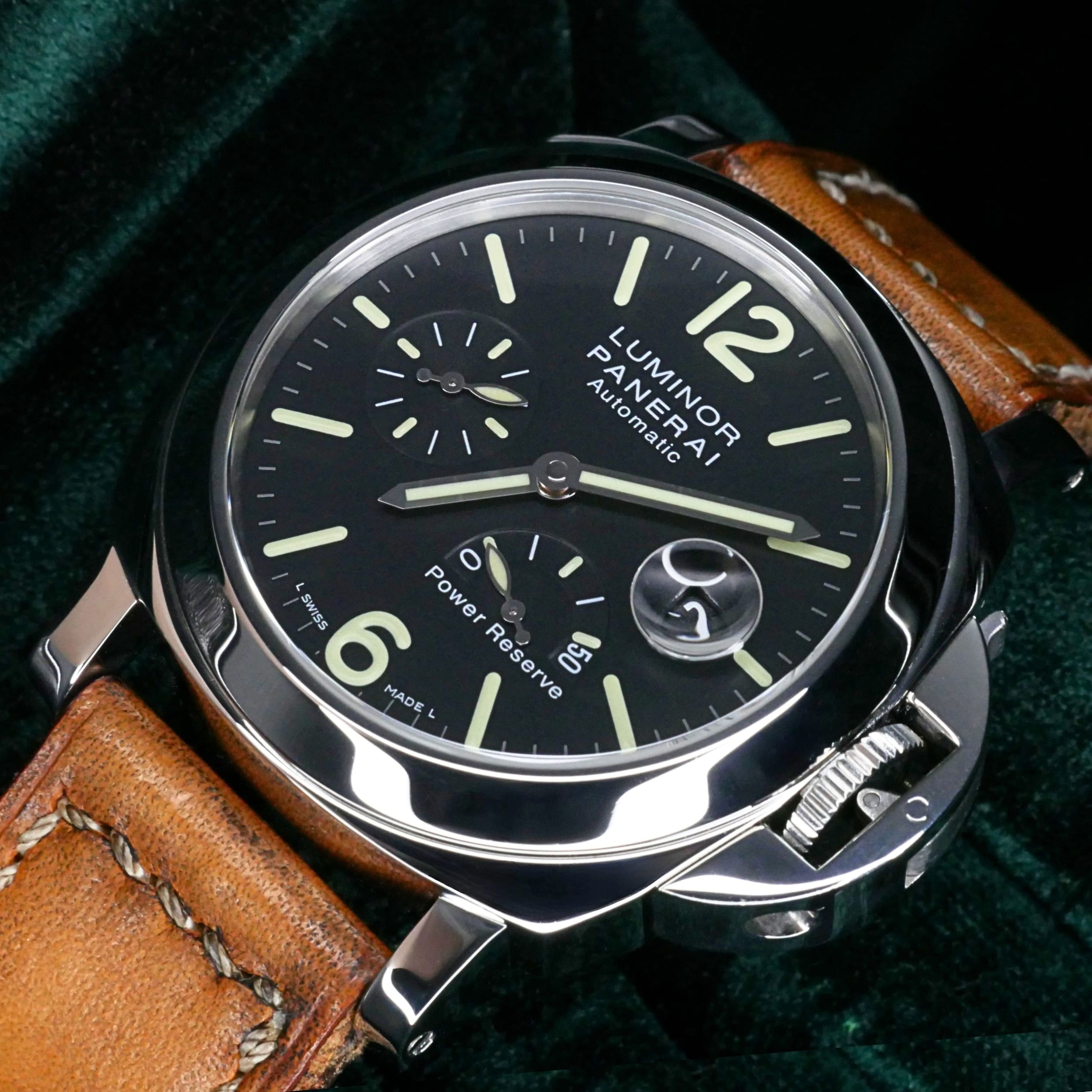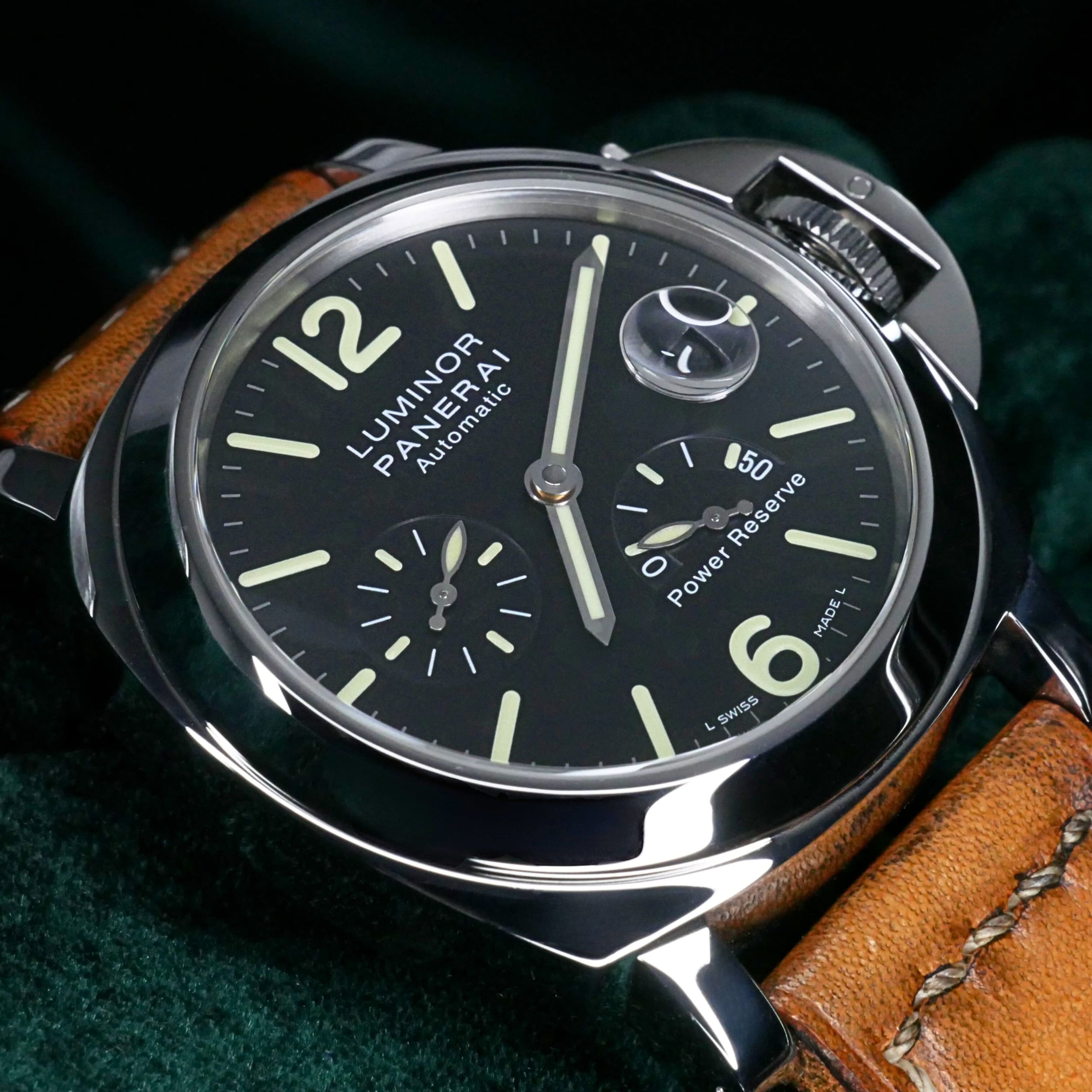 Presents itself in mint condition with little to no signs of wear. Featuring a black sandwich dial with a small seconds subdial, and a power reserve indicator that adds depth and mechanical character. The stainless steel Luminor case showcases Panerai’s iconic crown-protecting bridge and bold architectural lines. Completing the composition, the brown leather strap adds warmth and contrast, reinforcing the watch’s refined yet rugged presence.