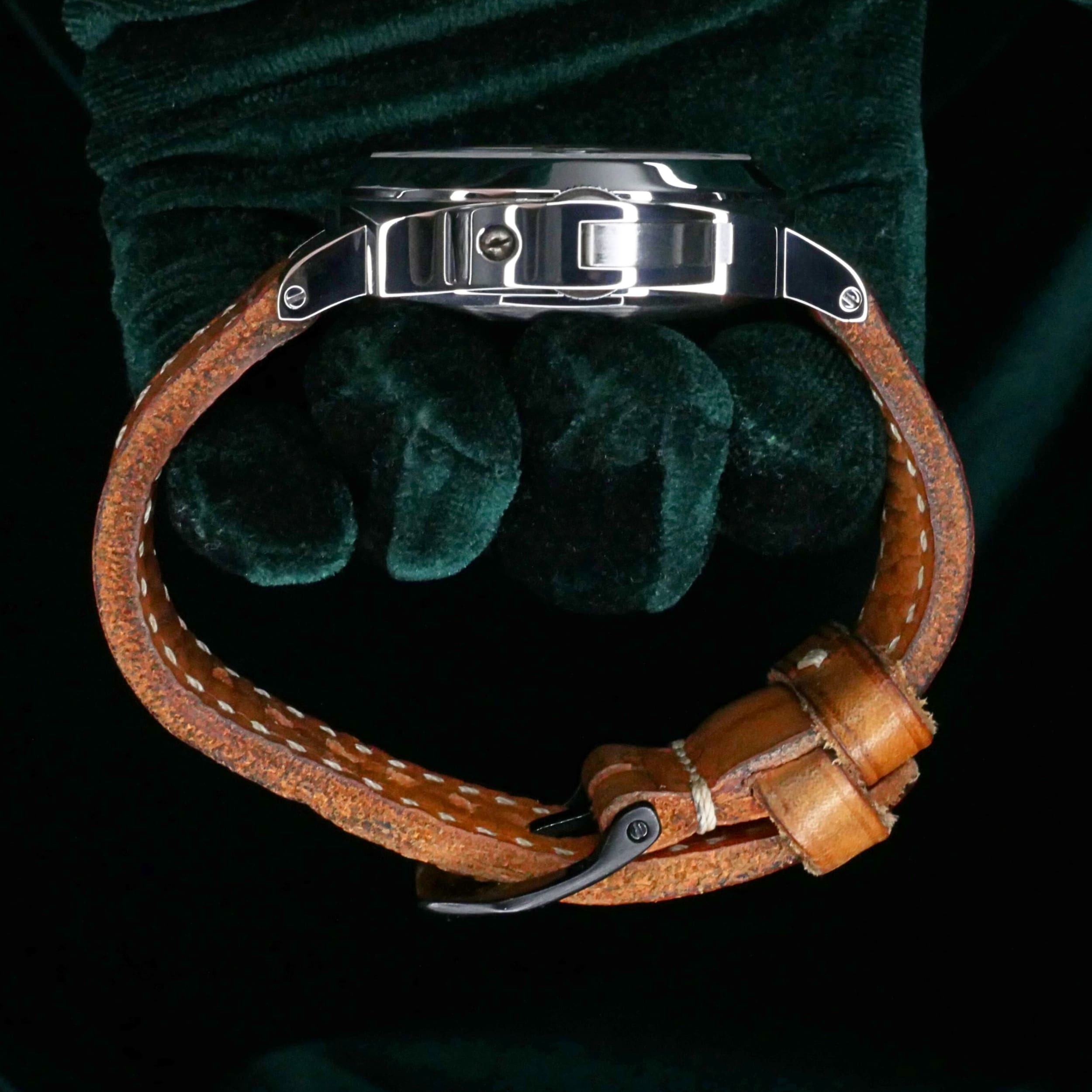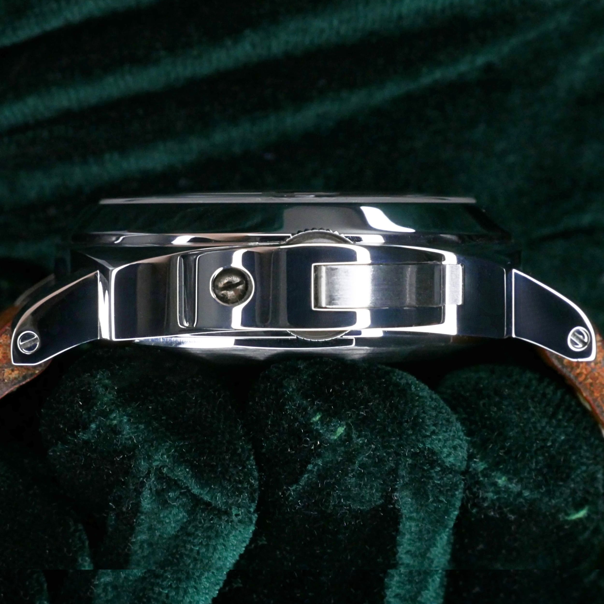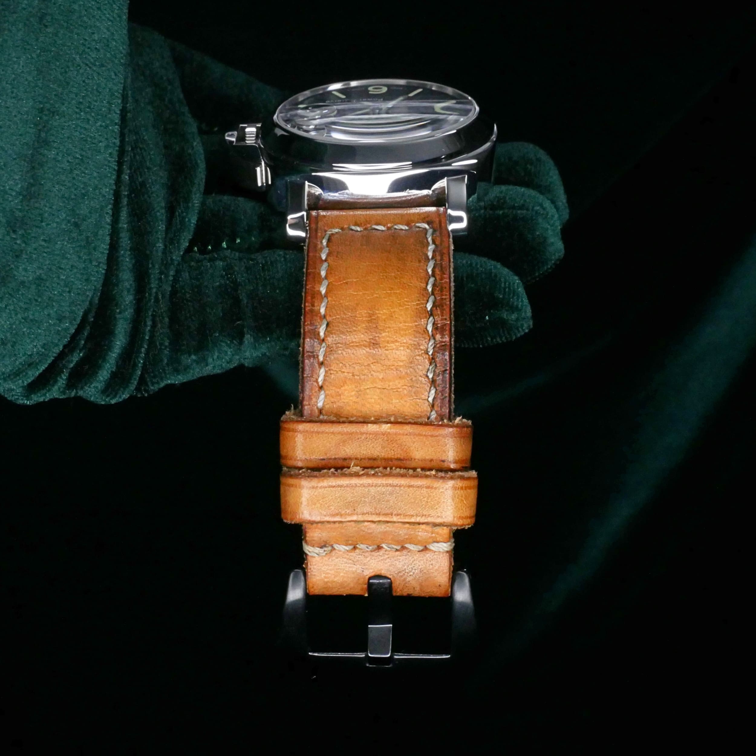 Presents itself in mint condition with little to no signs of wear. Featuring a black sandwich dial with a small seconds subdial, and a power reserve indicator that adds depth and mechanical character. The stainless steel Luminor case showcases Panerai’s iconic crown-protecting bridge and bold architectural lines. Completing the composition, the brown leather strap adds warmth and contrast, reinforcing the watch’s refined yet rugged presence.